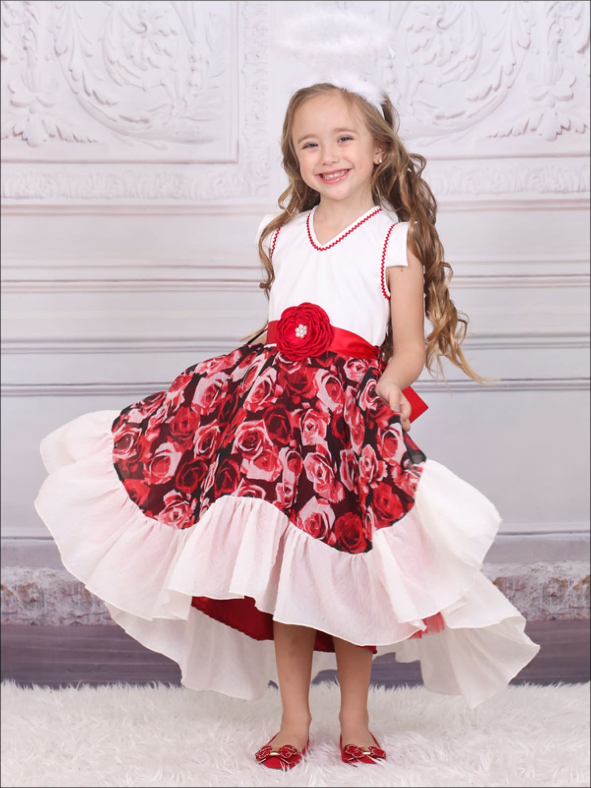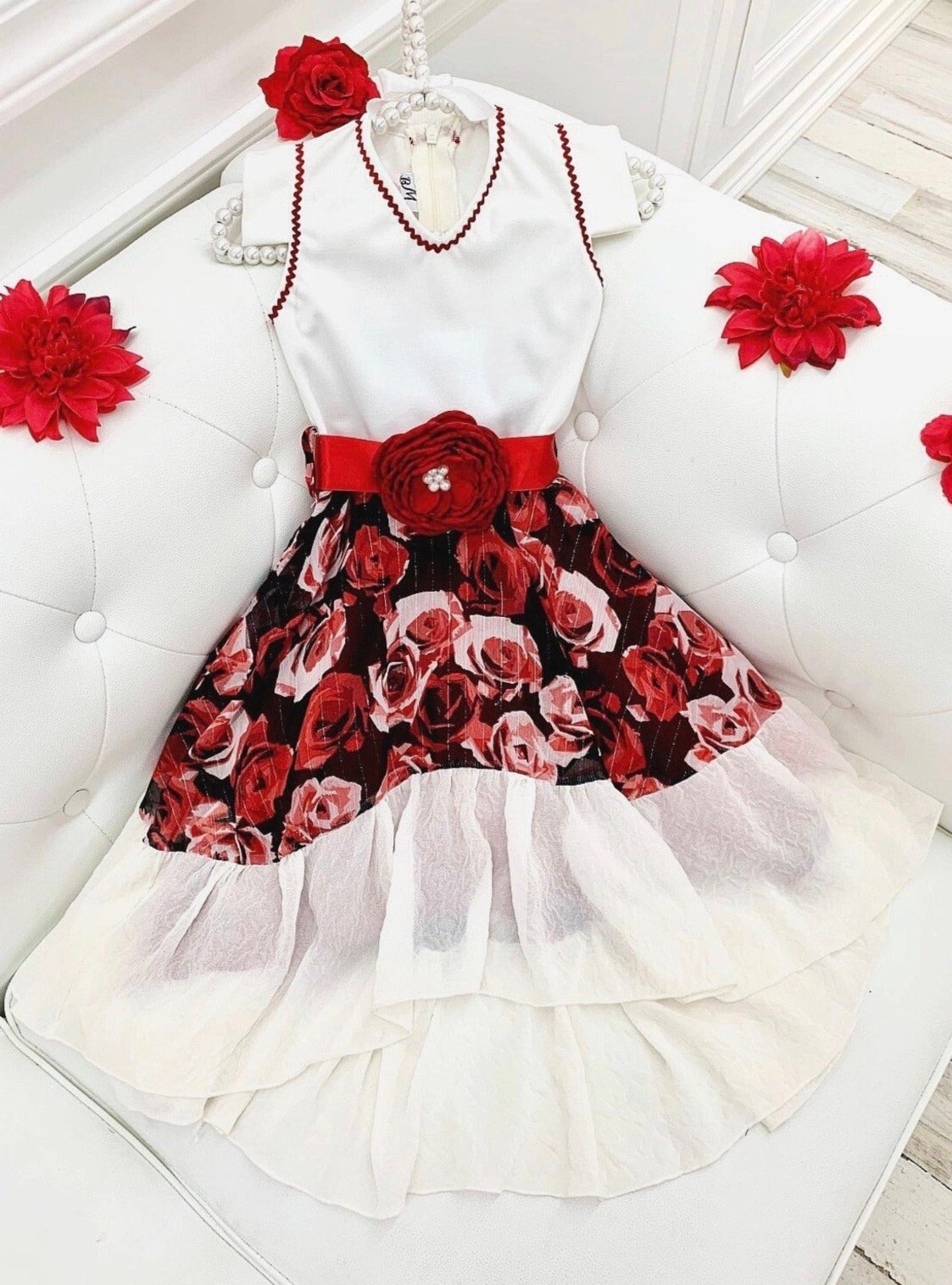 Twirl the night away in this red and creme v-neck hi-lo dress with sash flower waist belt.