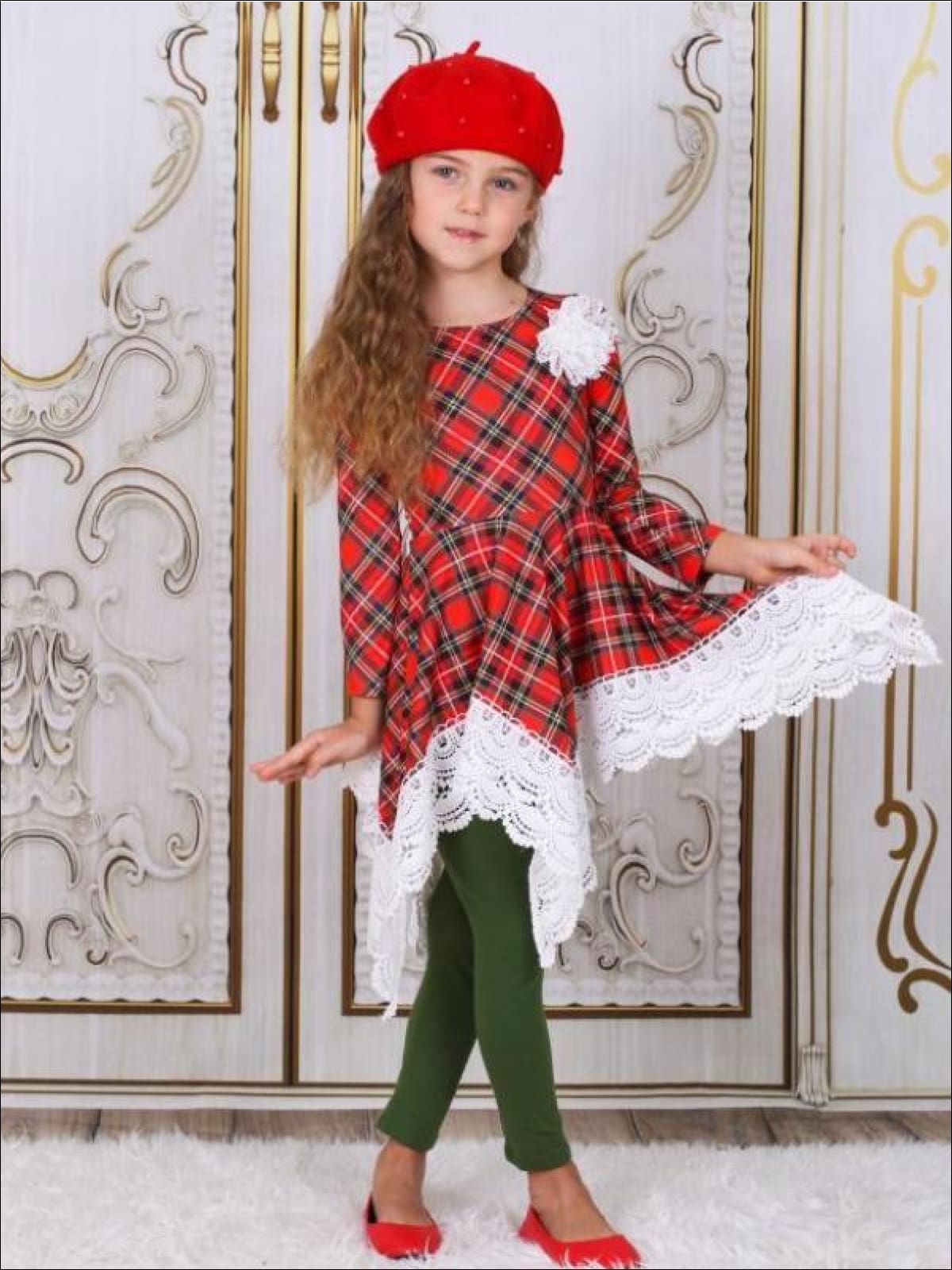 Girls Red & Green Plaid Crochet Trimmed Handkerchief Tunic & Leggings Set - Girls Fall Dressy Set