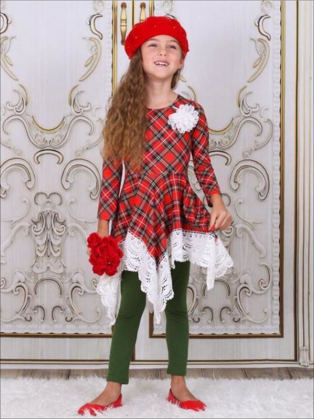 This one of a kind plaid tunic trimmed with crochet lace is so perfect for the holiday season. Comes together in a set with red leggings to complete the look.