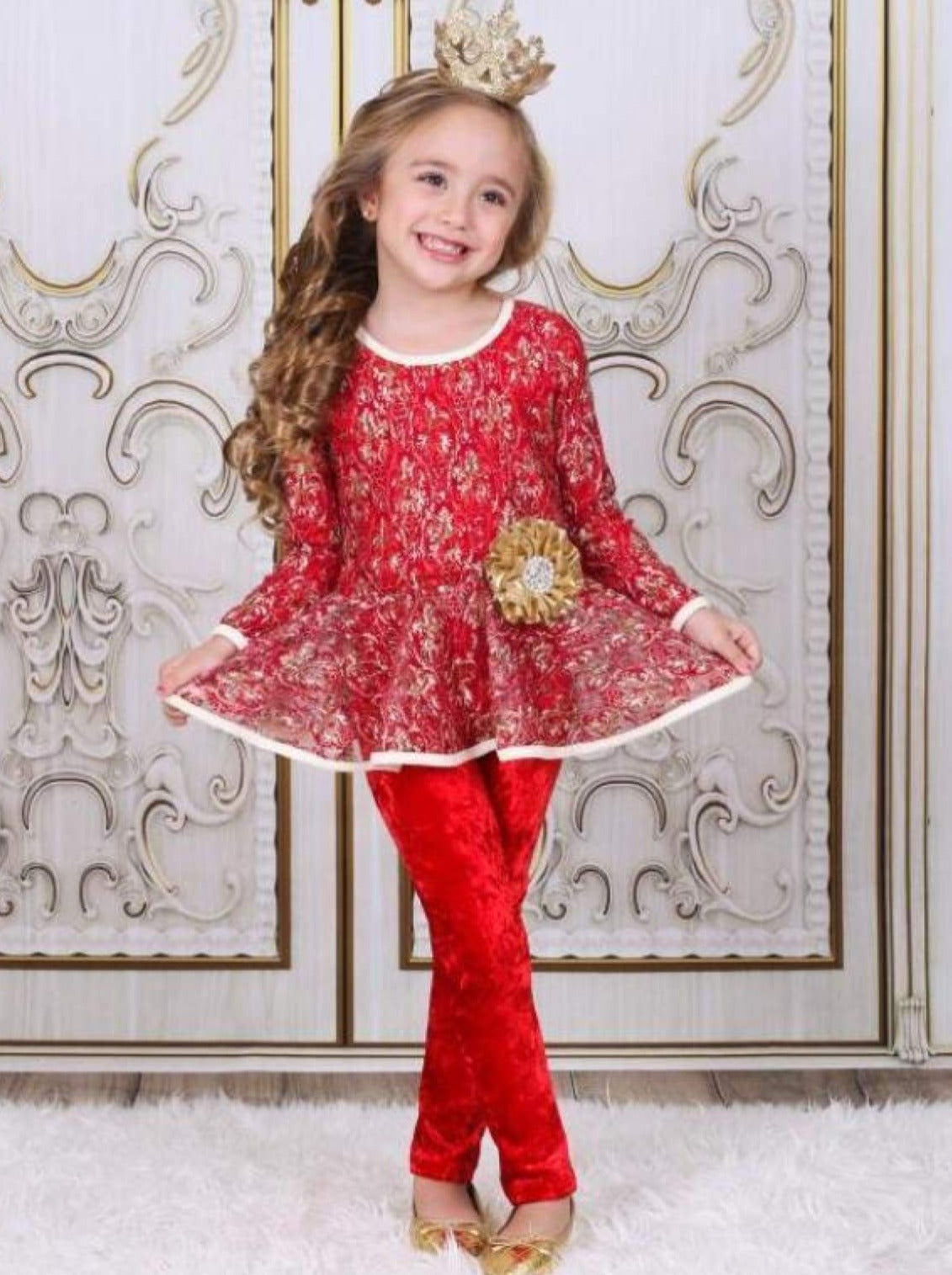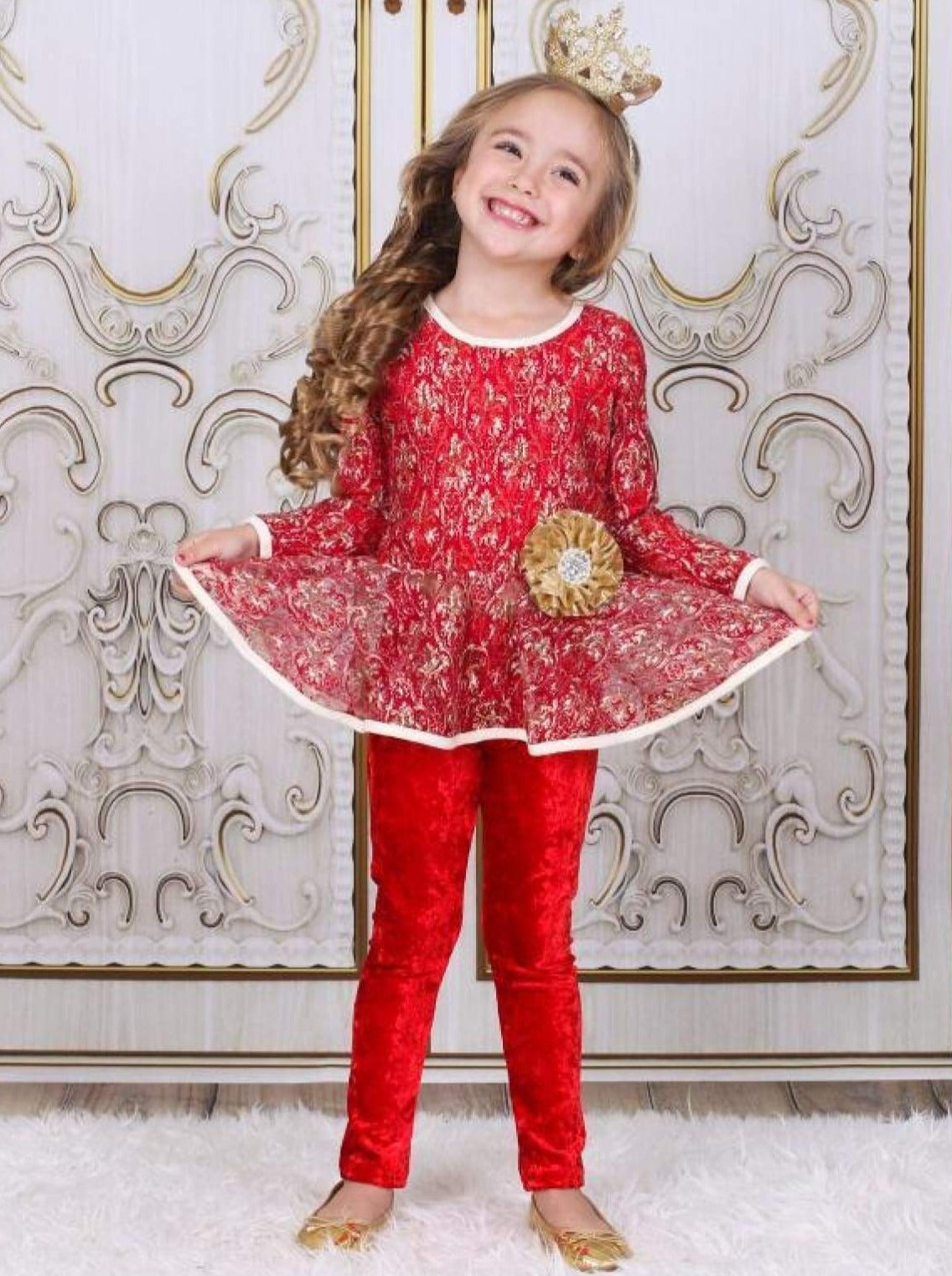 Girls Red & Gold Lace Peplum Tunic & Velvet Legging Set