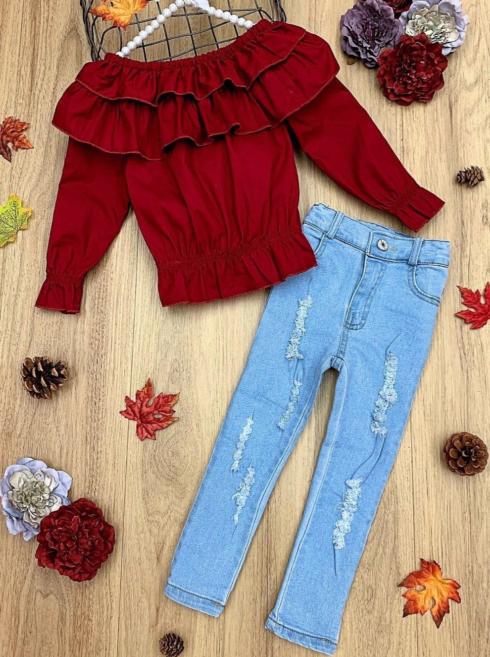Your little girl will rave over this sweet ruffle bib top and distressed jeans set. So easy to style up with your little girl's favorite accessories