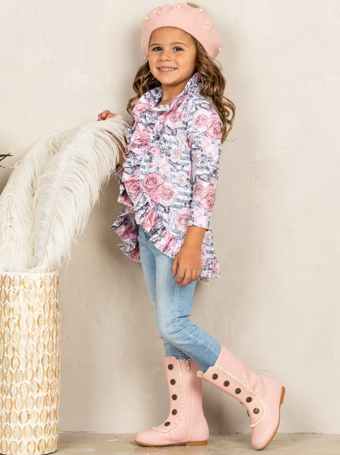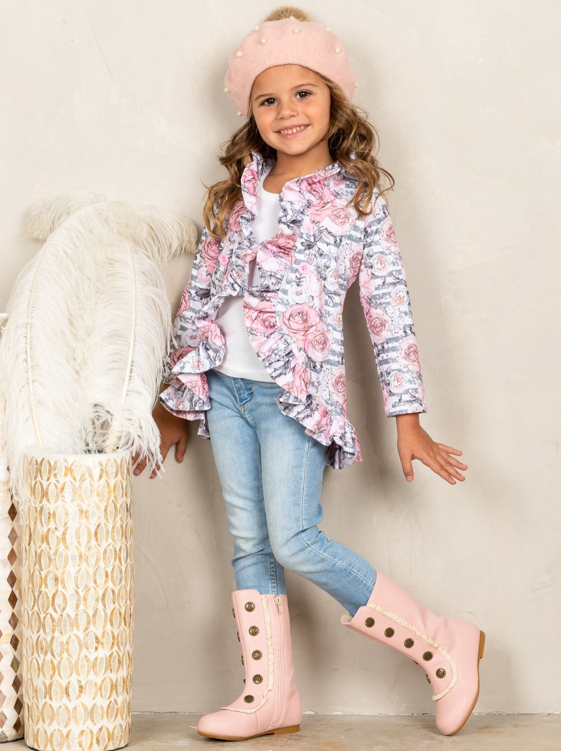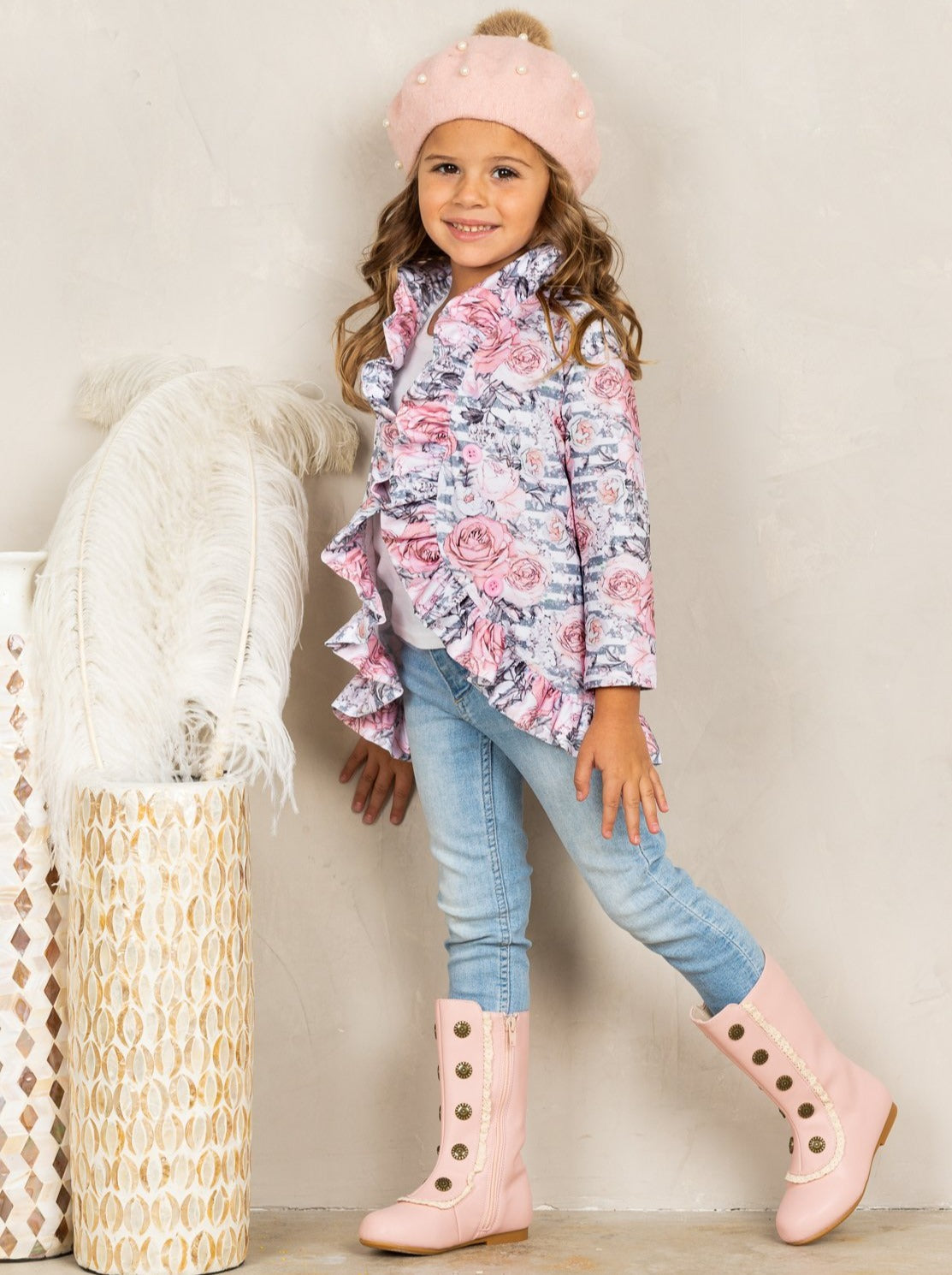 Girls Ruffled Faux Button  Floral Printed Blazer Style Cardigan