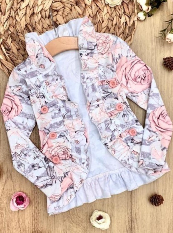 Girls Ruffled Faux Button Floral Printed Blazer Style Cardigan