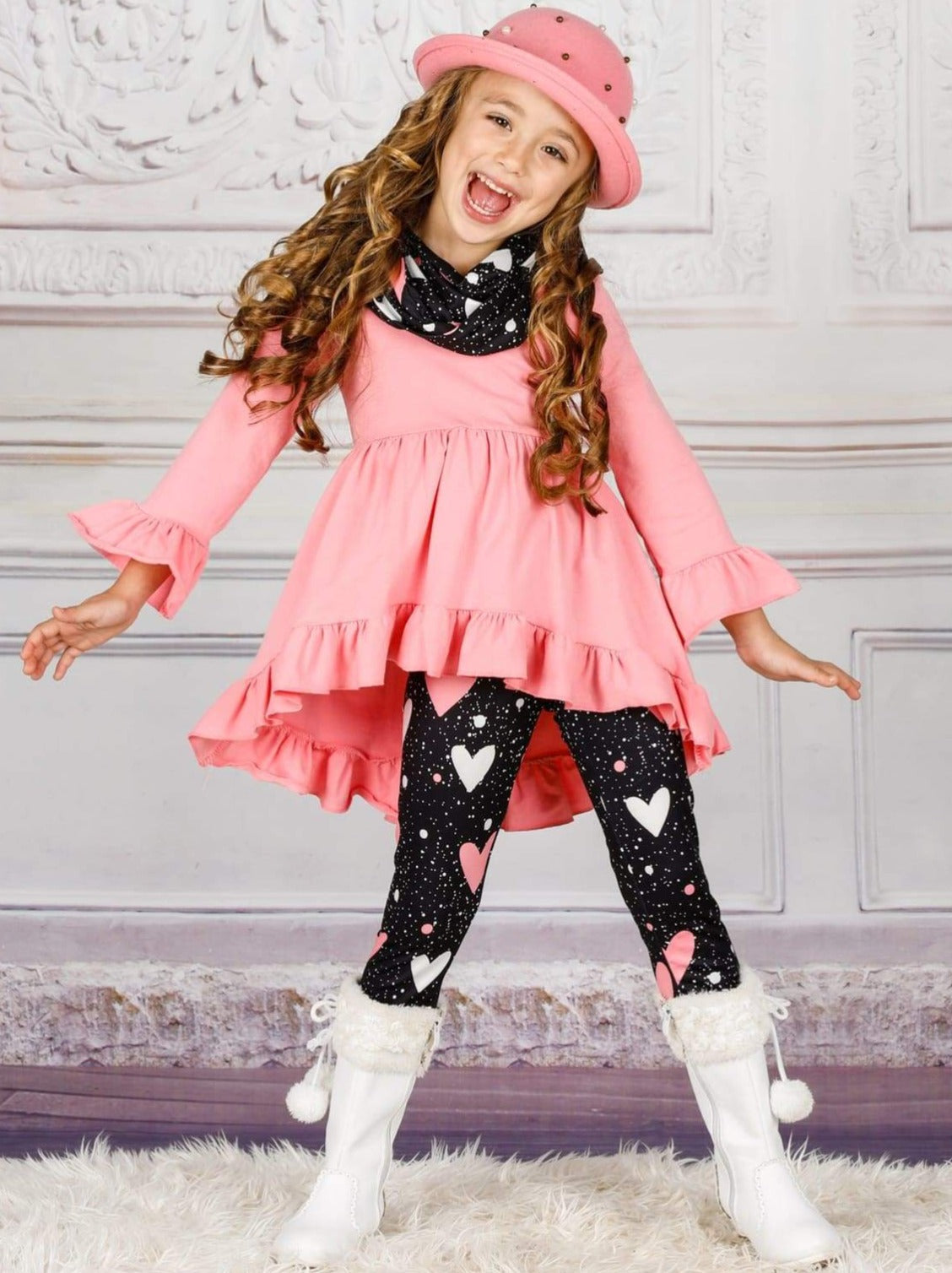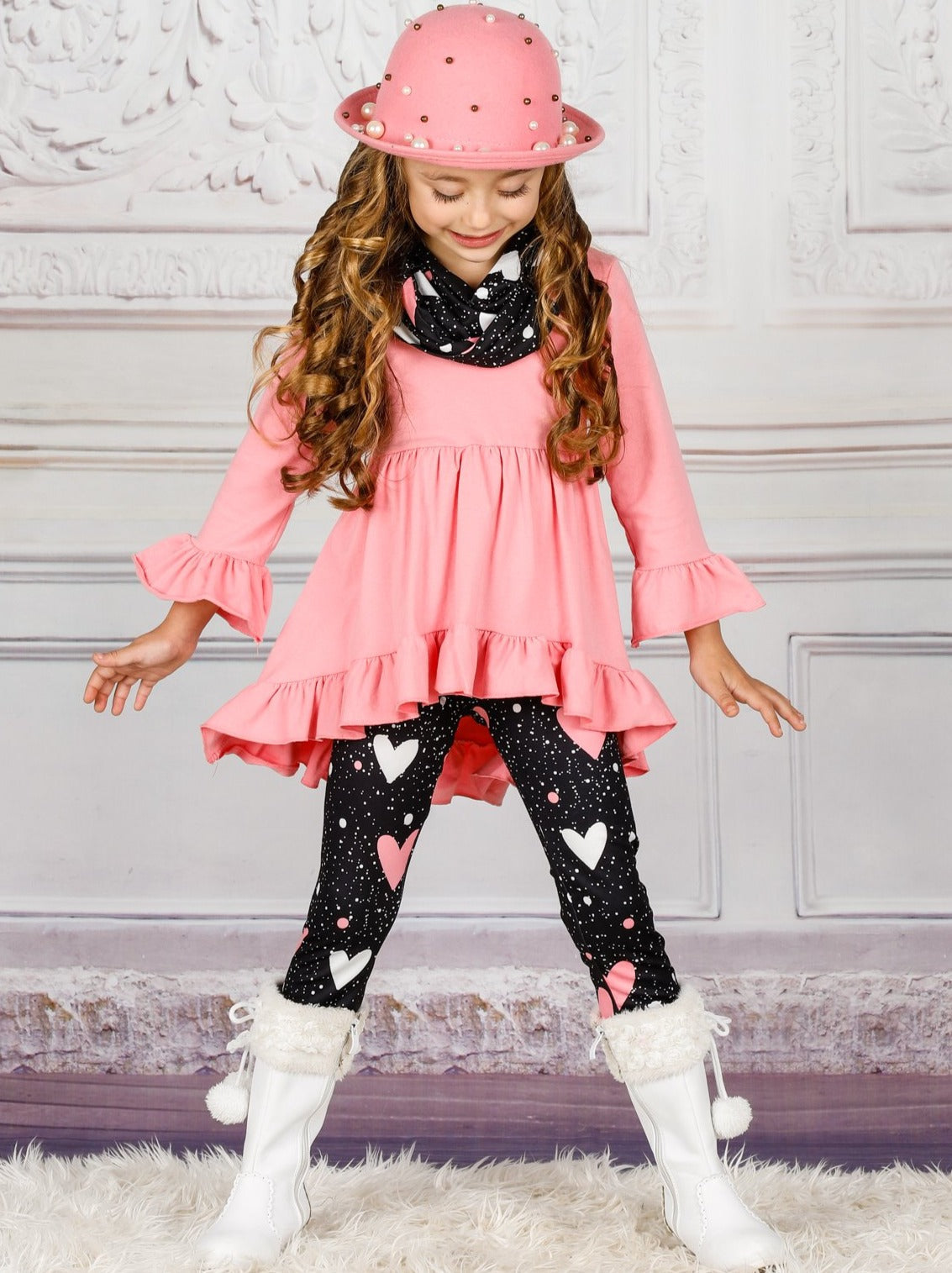 - The set features a ruffled long-sleeved hi-lo pink tunic with heart print leggings and matching infinity wrap scarf