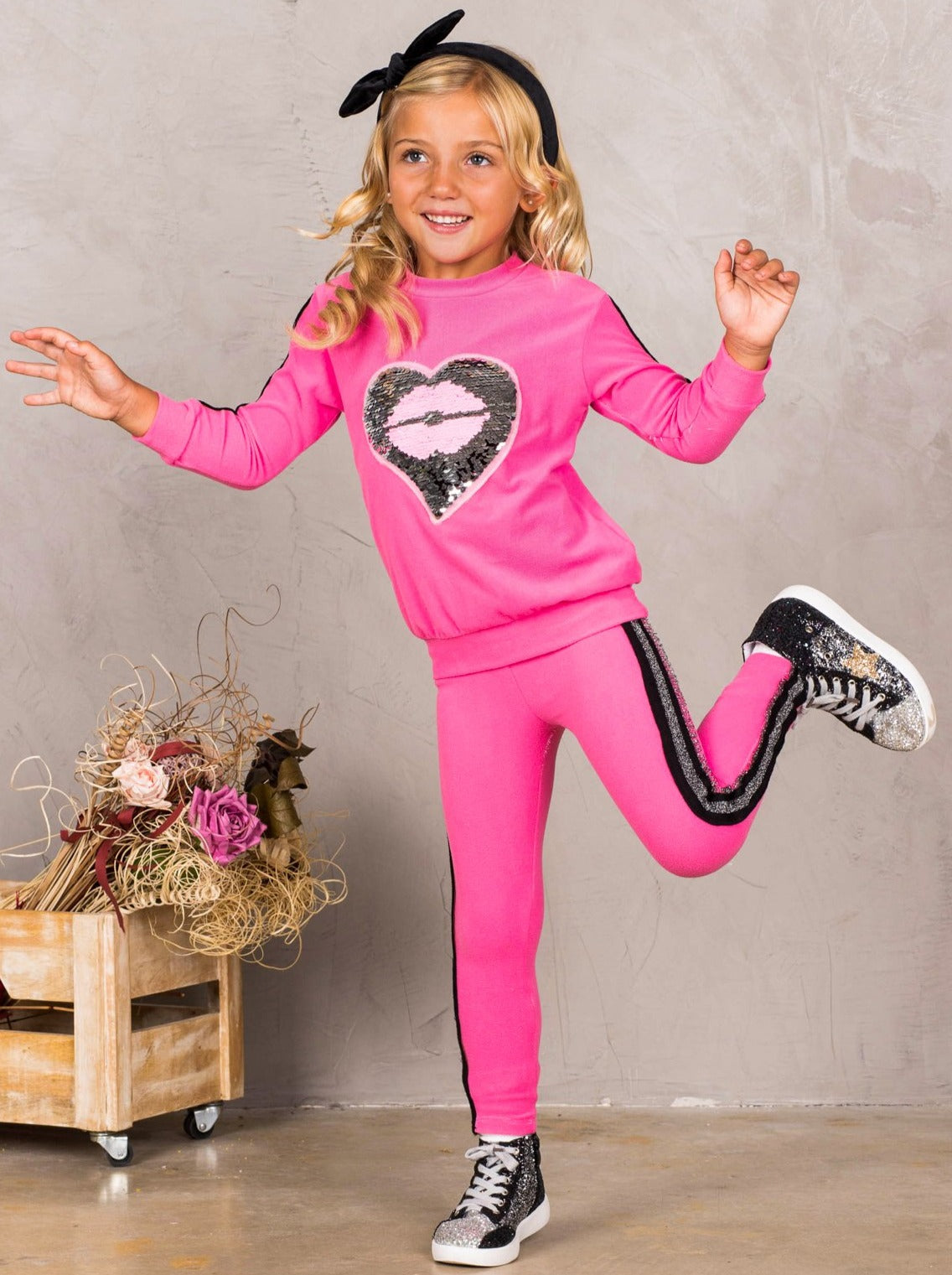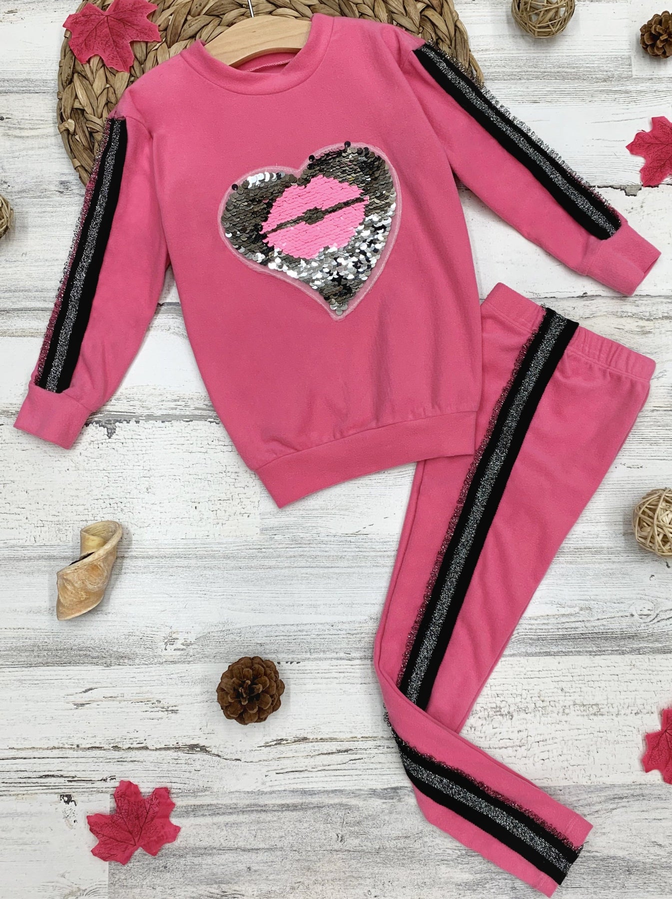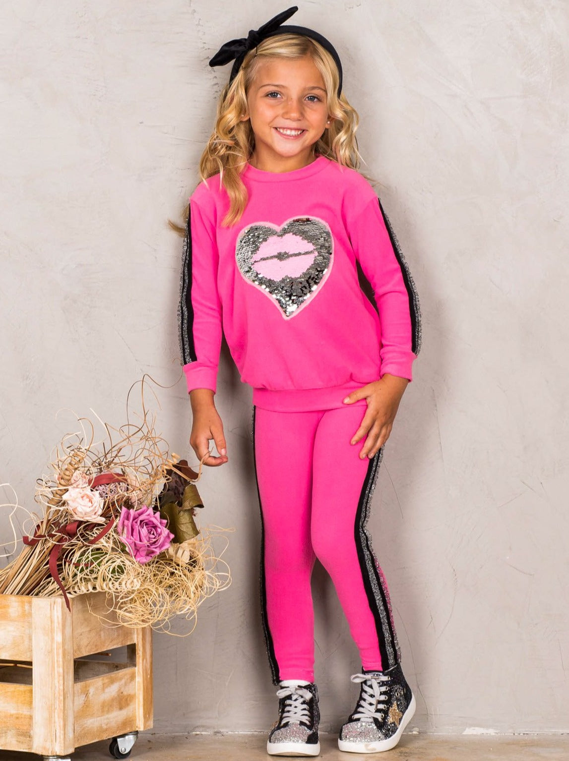 Girls Sequin Heart Lips Applique Sweatshirt and Jogger Set