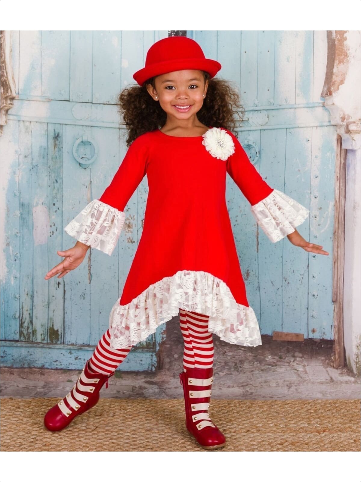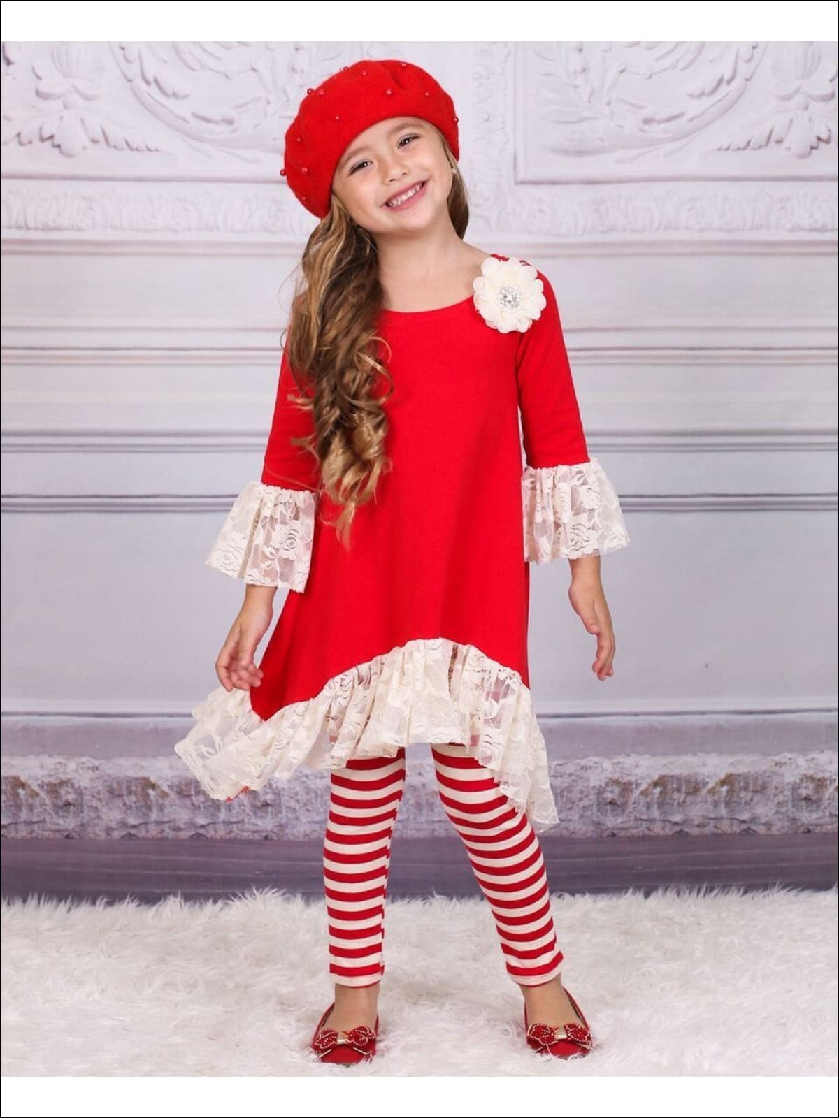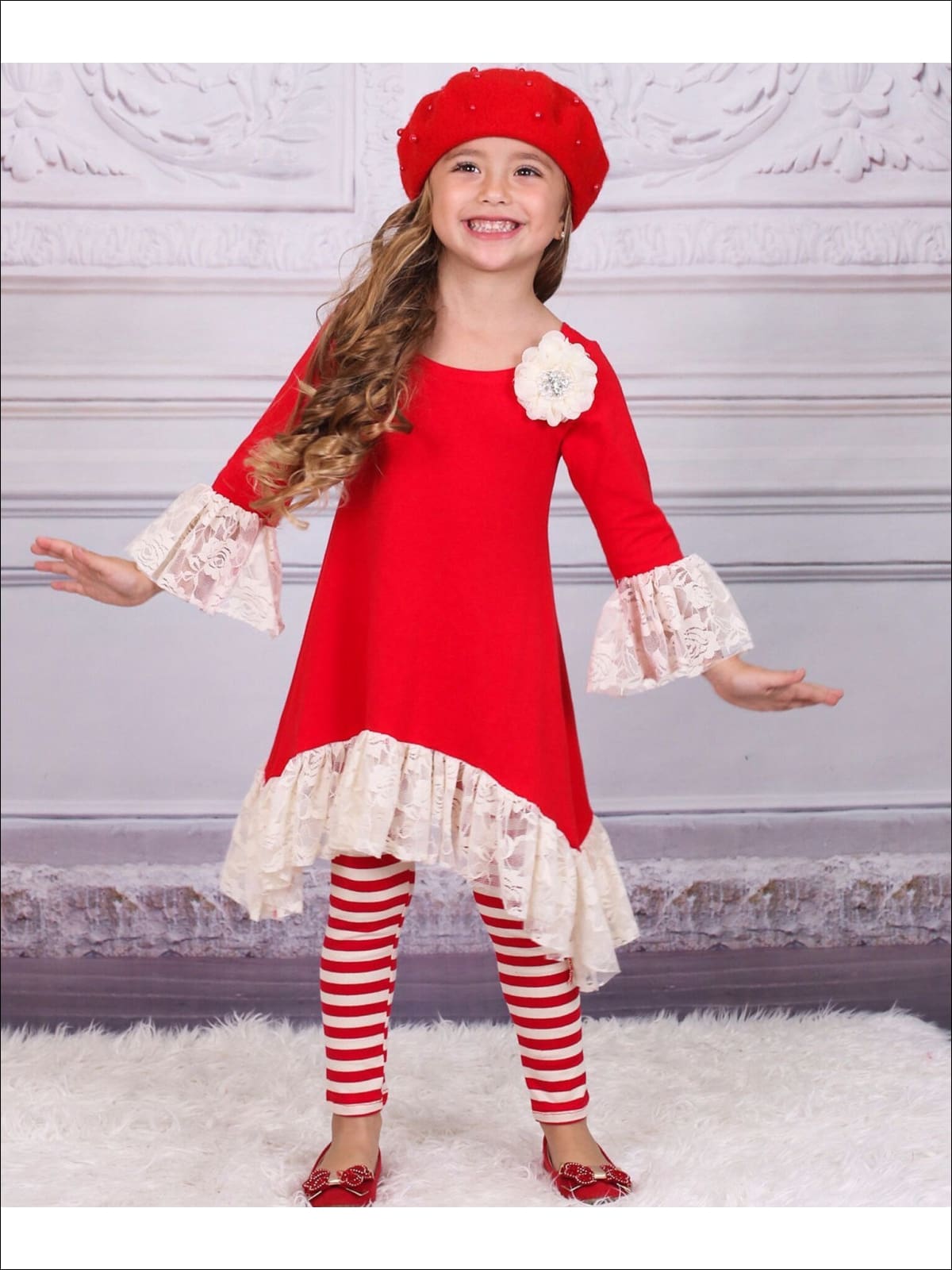Fluttering with lace and boasting a shoulder flower this Hi-Lo tunic will make styling a simple pleasure.