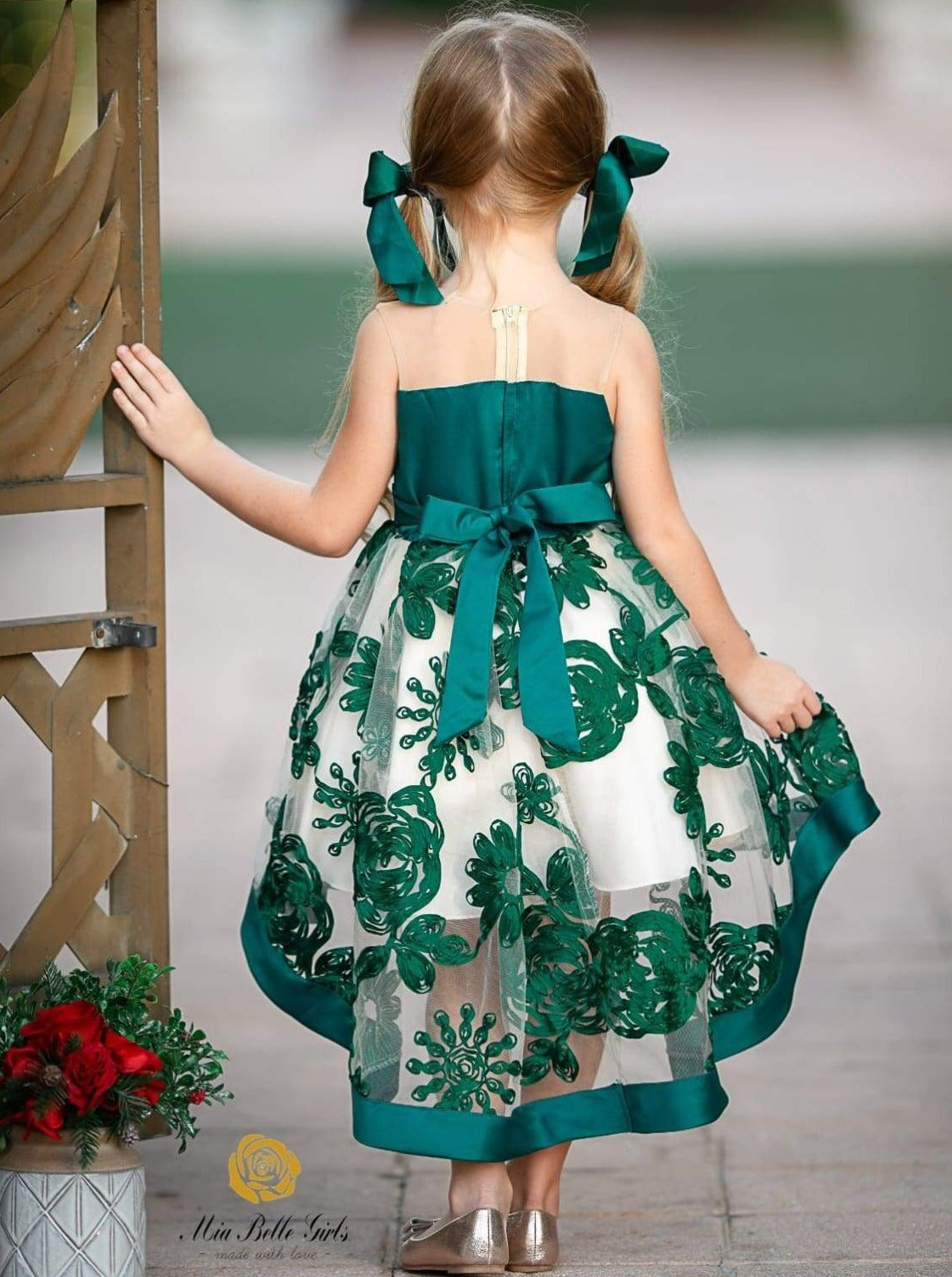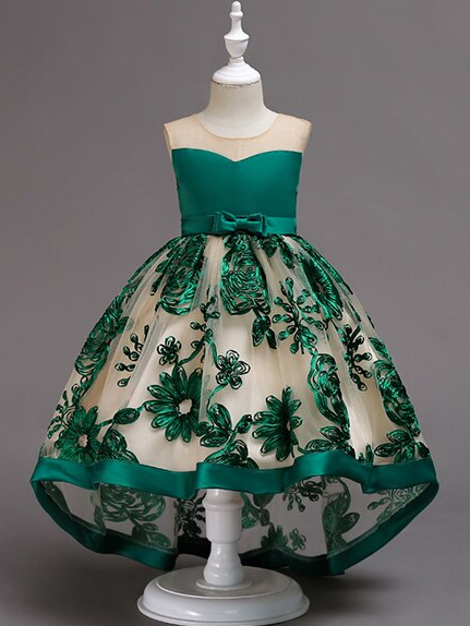 Sleeveless hi-lo dress with nude neckline, satin bodice, floral embroidered hi-li chiffon skirt, and bows in front and back