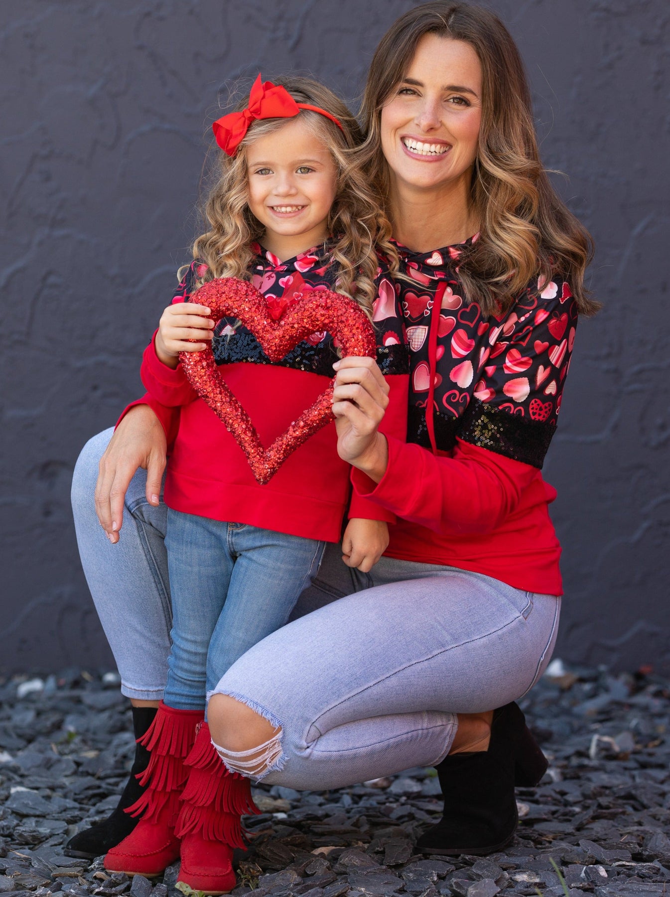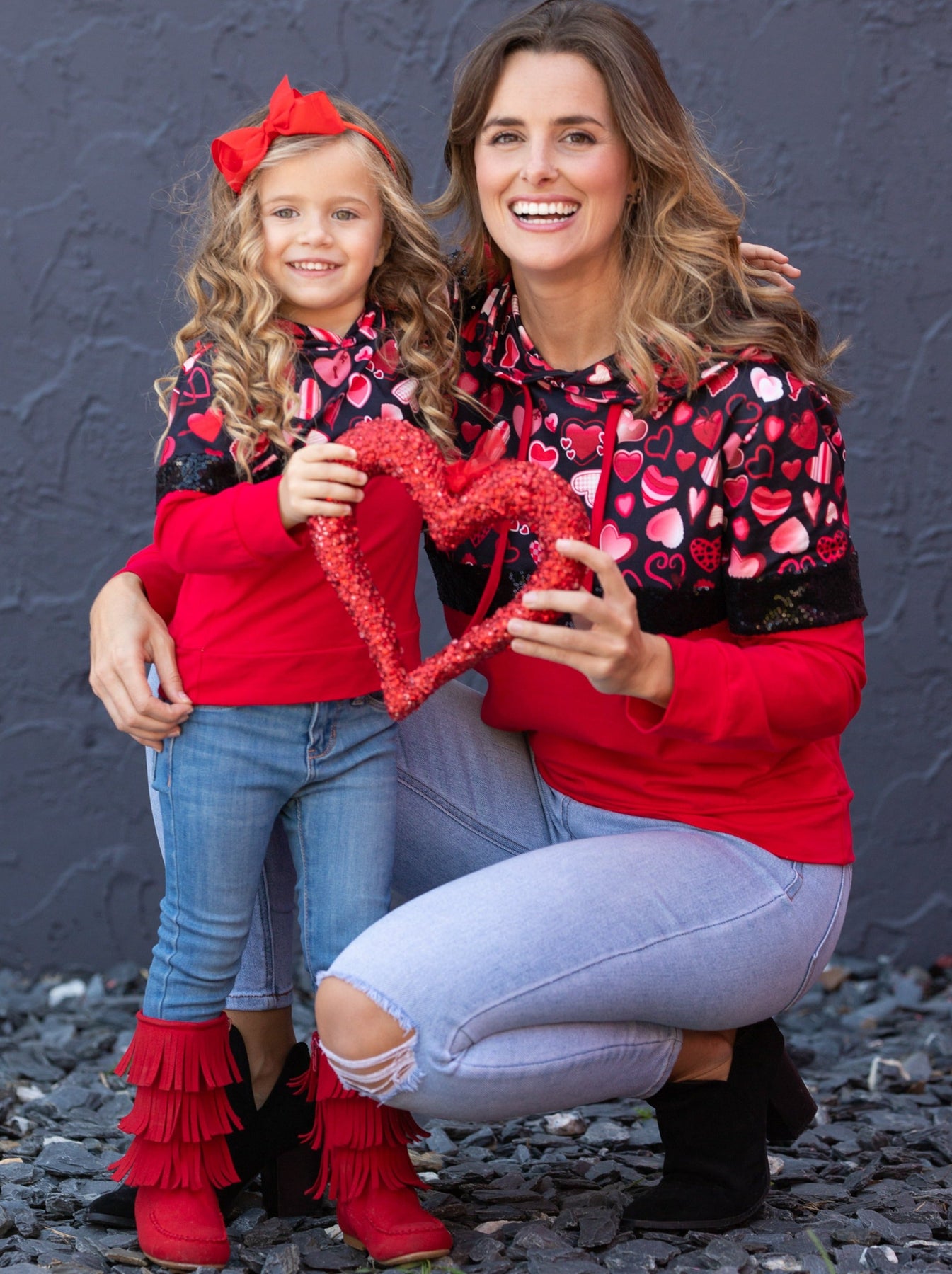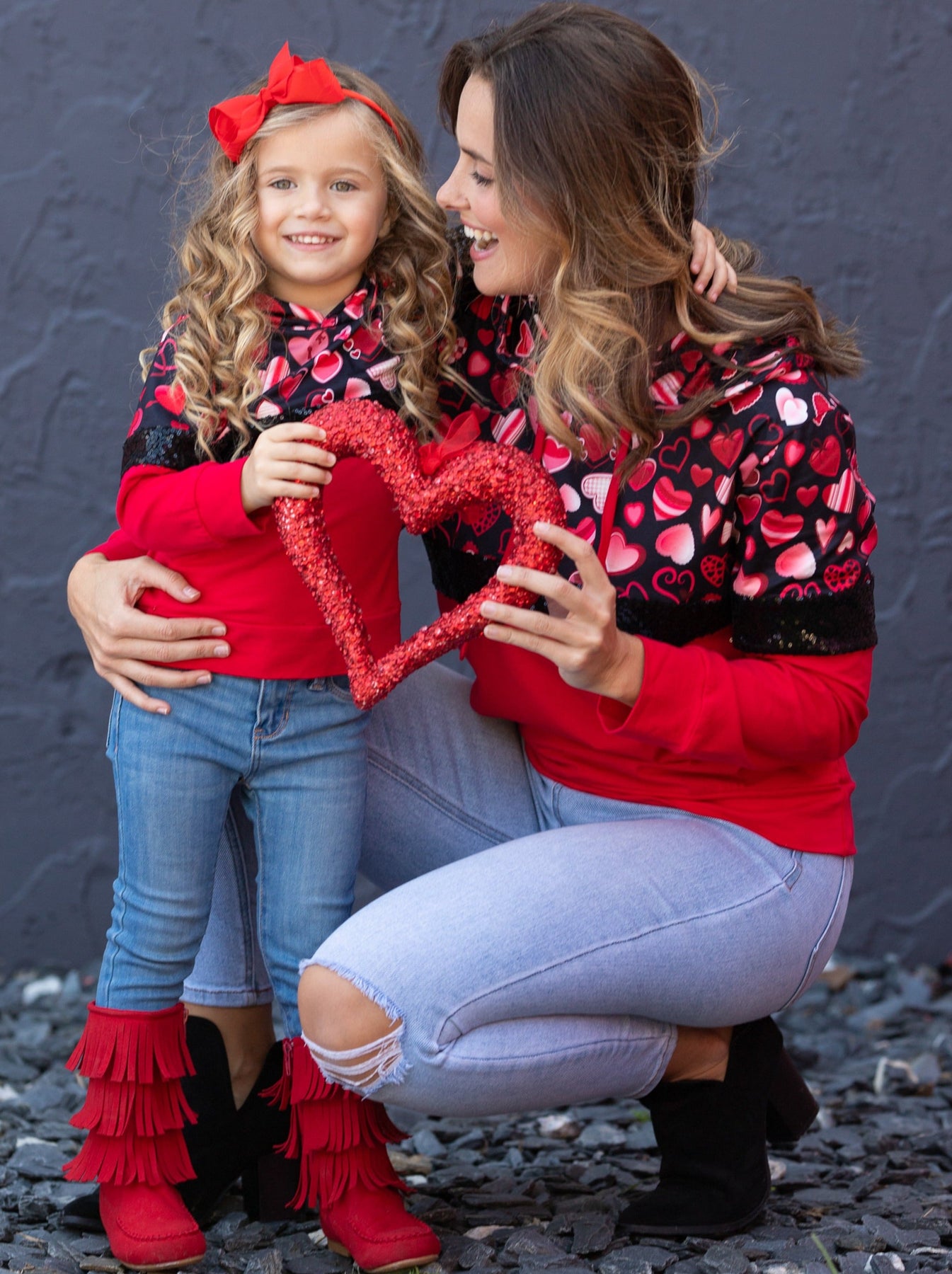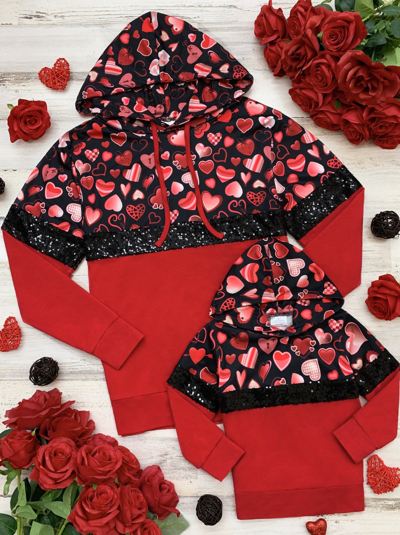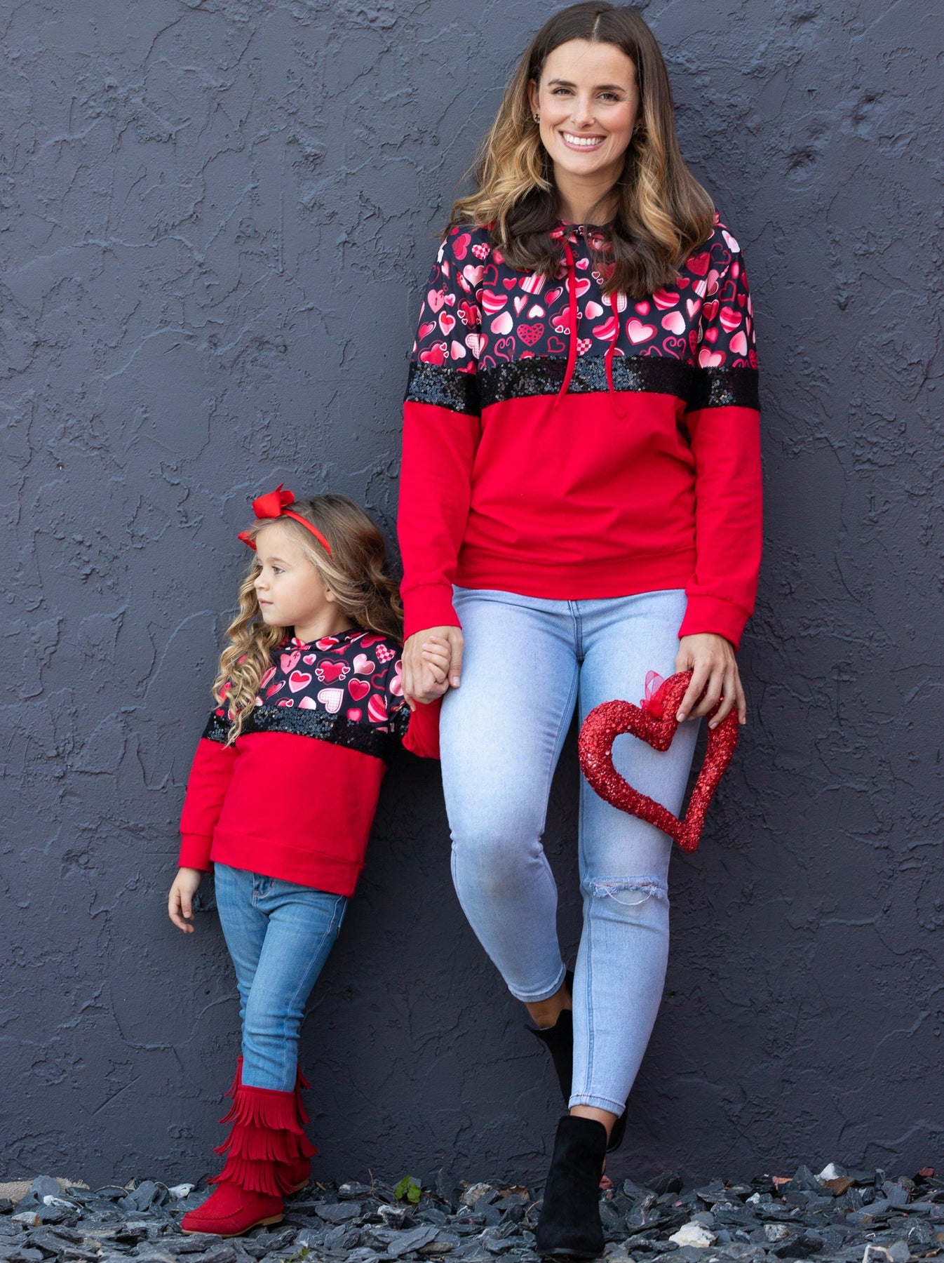 - Keep her cuter than Cupid all day long wearing our pullover hoodie covered in hearts and sequin. She'll adore the cute patterns and darling colors perfect for pairing with denim, skirts, and leggings. The way she'll look is sure to melt your heart!