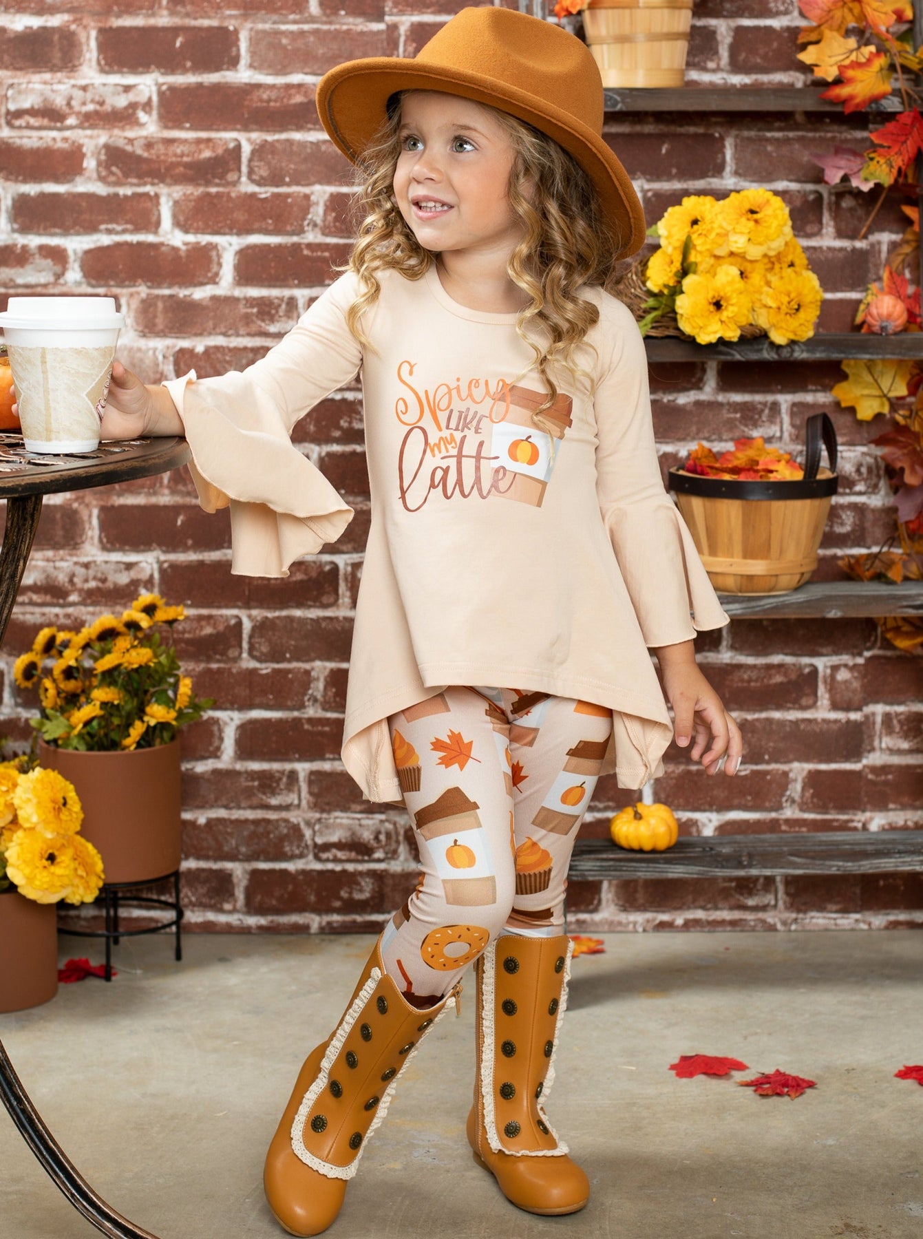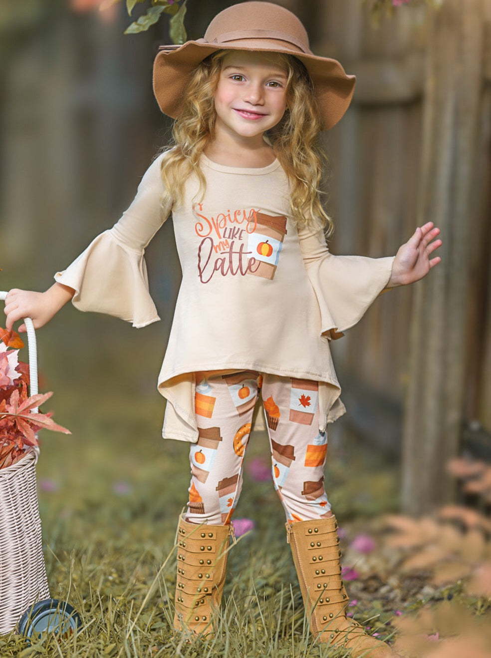 Girls Fall 3/4 sleeve hi-lo "Spicy Like My Latte" graphic print tunic with bell cuffs and pumpkin spice printed leggings - Mia Belle Girls