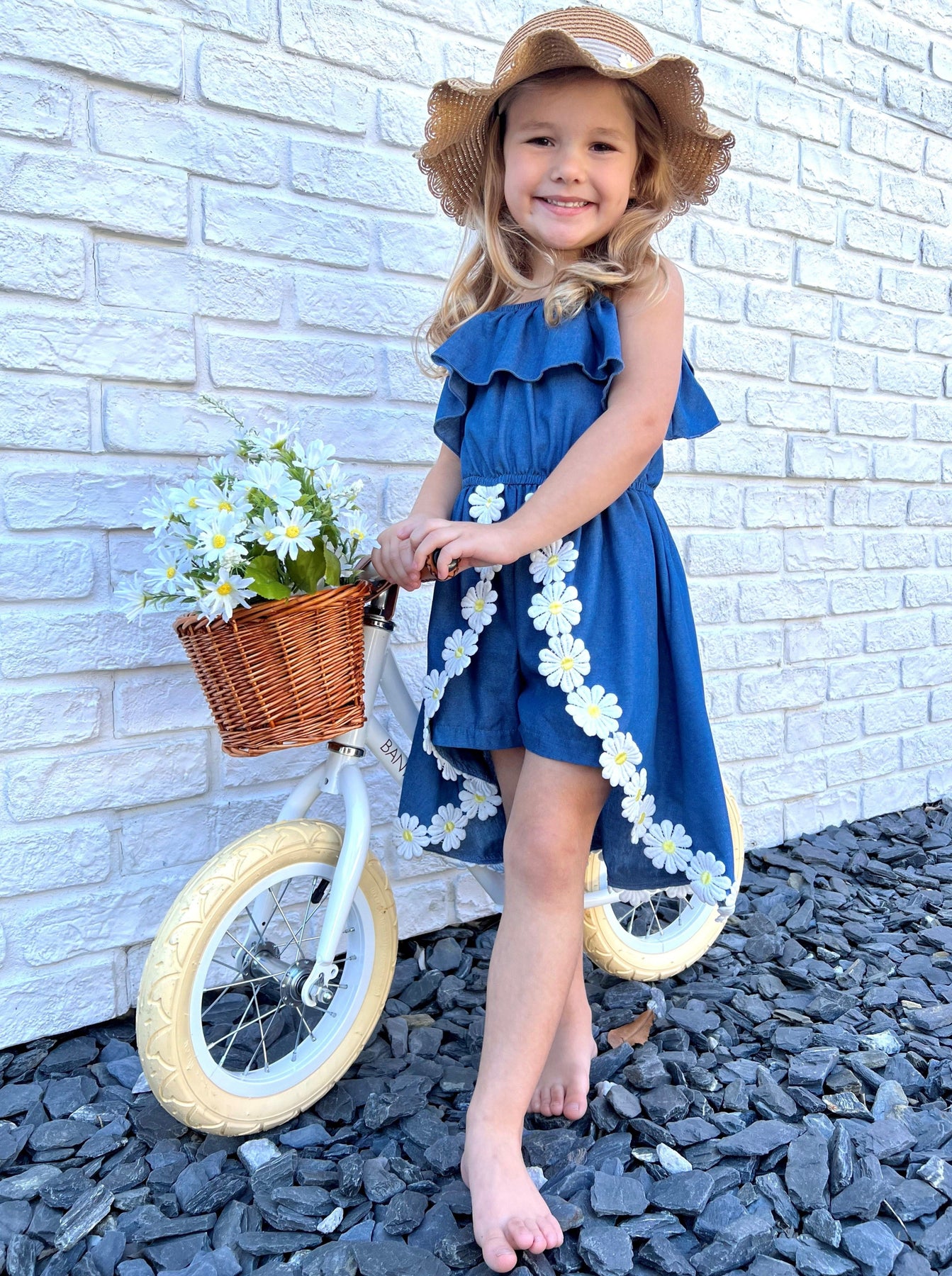 • She'll be looking like the sweetest summer child in our unique girls' chambray romper. Ideal for warm-weather adventures in the sun, this fashion piece features a ruffled bib design and a hi-lo train skirt decorated with the most beautiful daisy appliqués. It's THE perfect dress for summer outings and more!