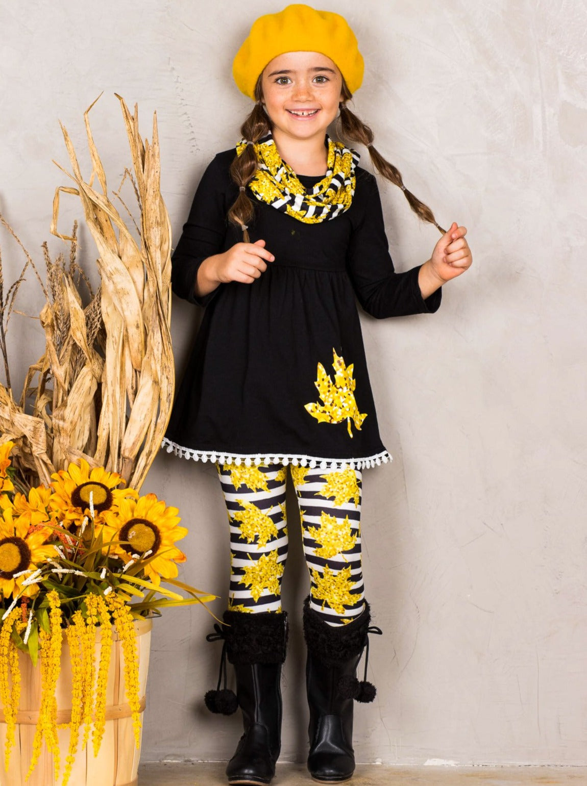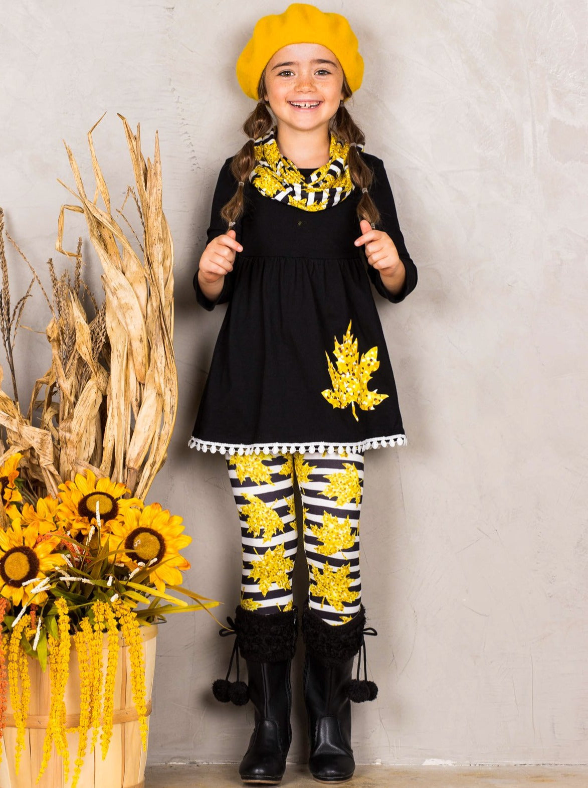 These gorgeous leaves are ready to be played in! Help her fall into fall-ready style with this leaves print scarf set made with a hint of stretch for comfort all day long. Everything from the color details on the leaves to the cute accents on the hem will have her looking her adorable best.