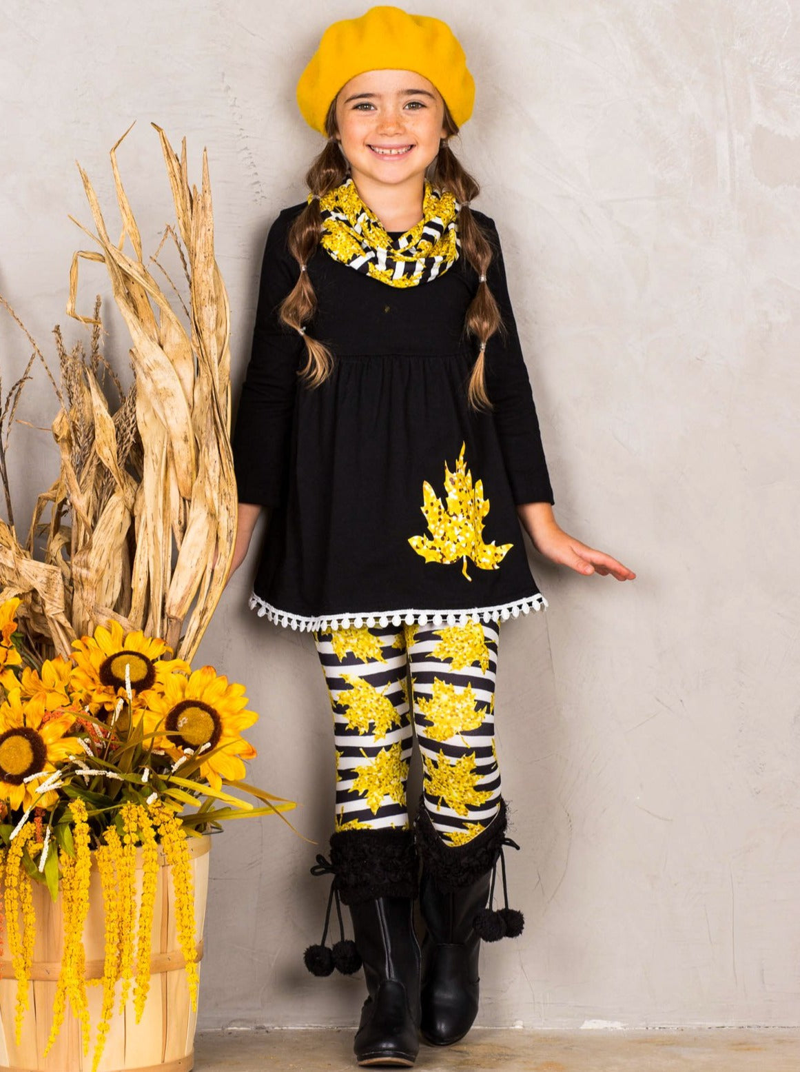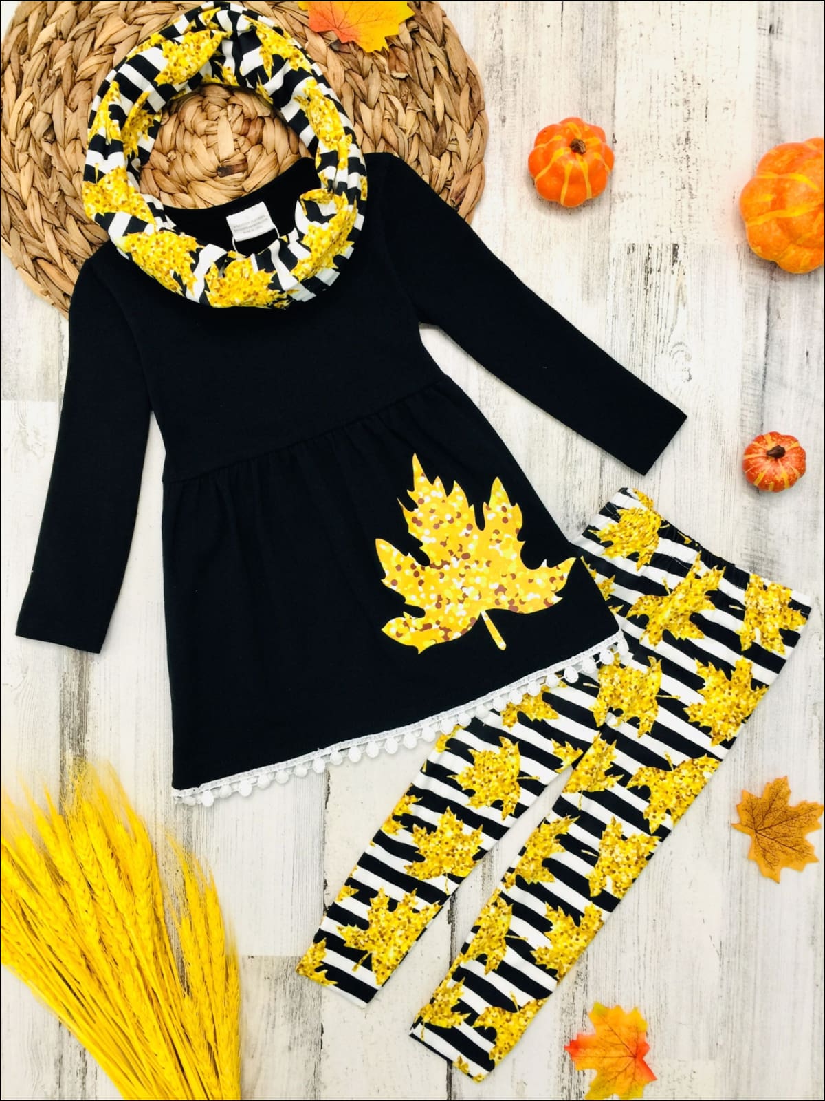 Girls Striped Leaves Print Circle Trim Hem Long Sleeve Tunic Leggings & Scarf Set - Girls Fall Casual Set