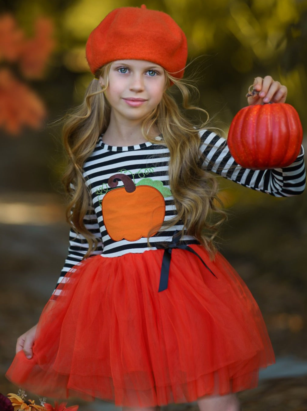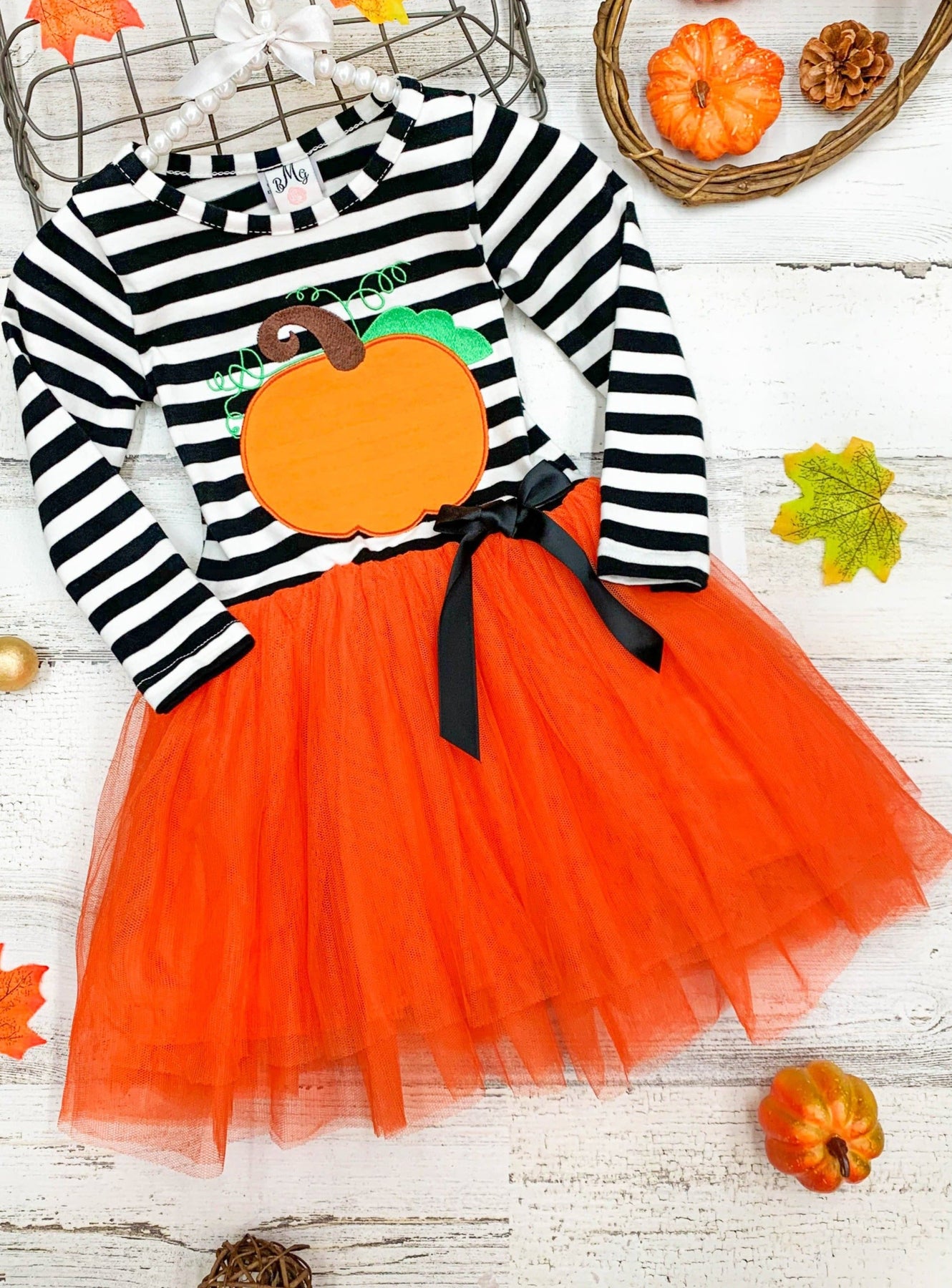 Little girls Halloween long-sleeve tutu dress with striped bodice, applique pumpkin, and gathered tulle skirt and satin bow finish - Mia Belle Girls