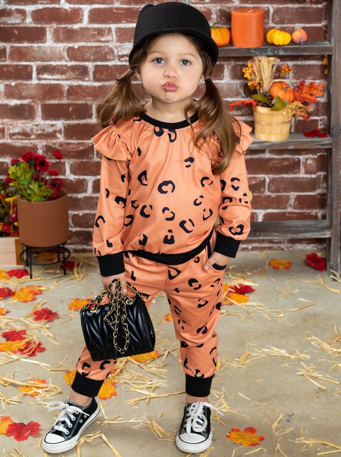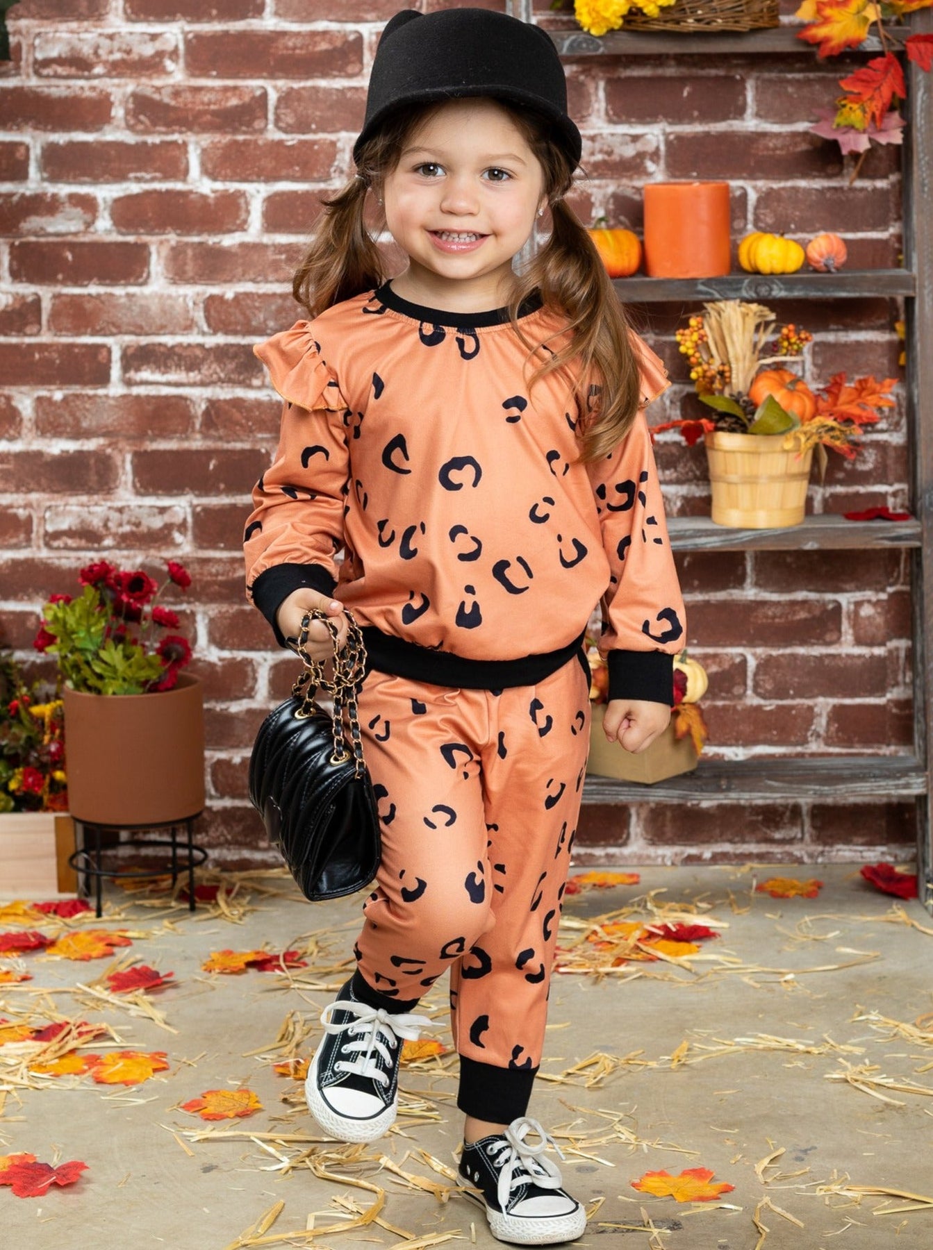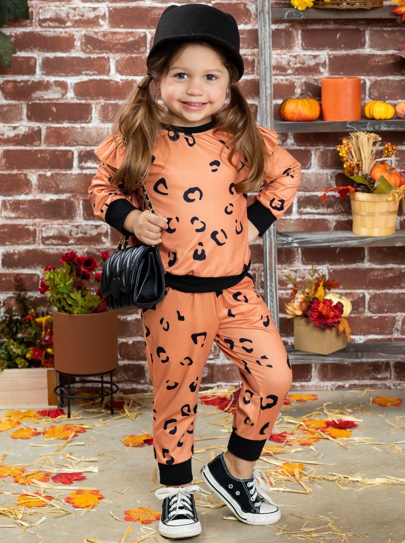 Girls jogger set features a trendy leopard print with ruffled shoulders and black cuffs