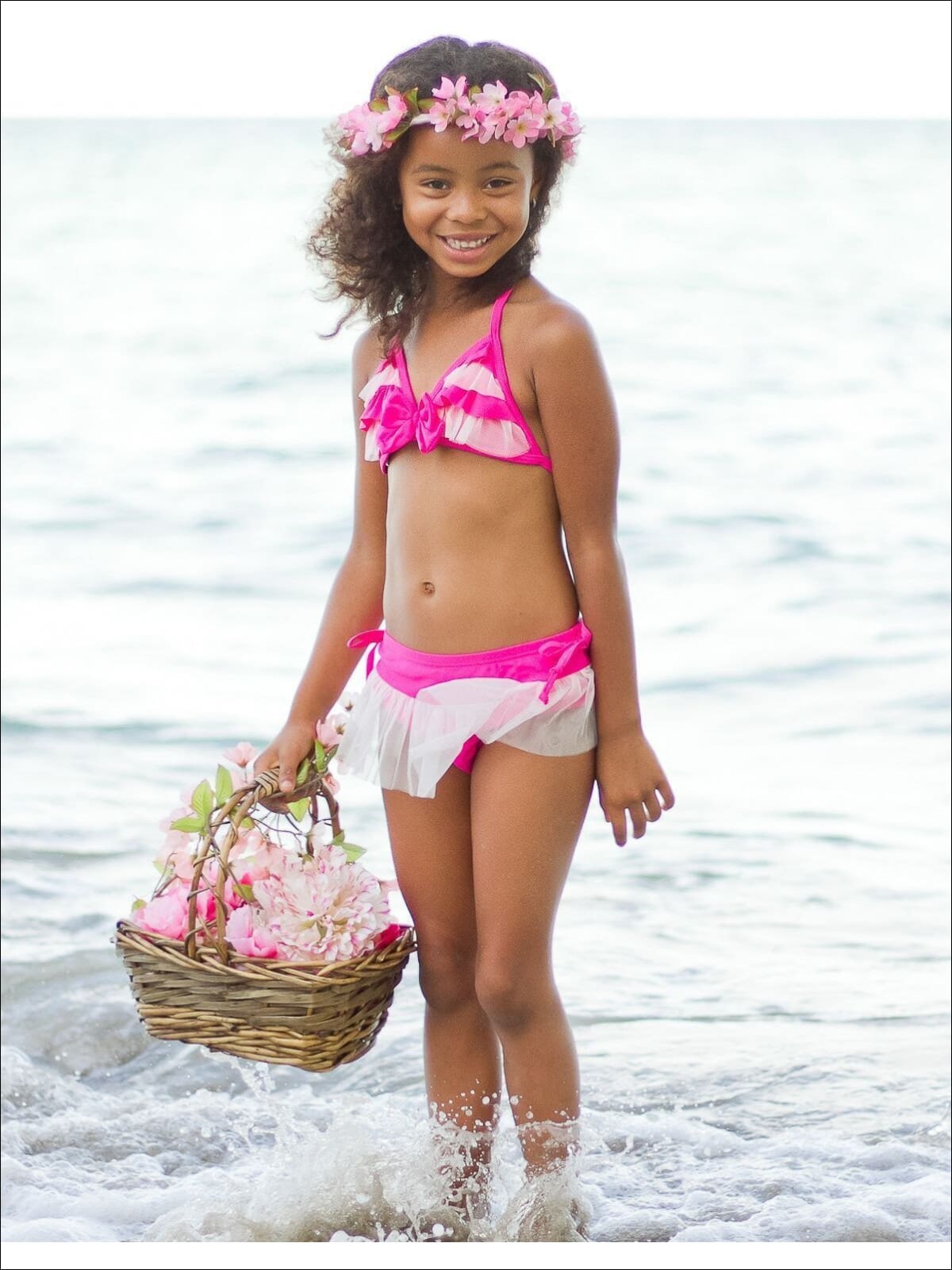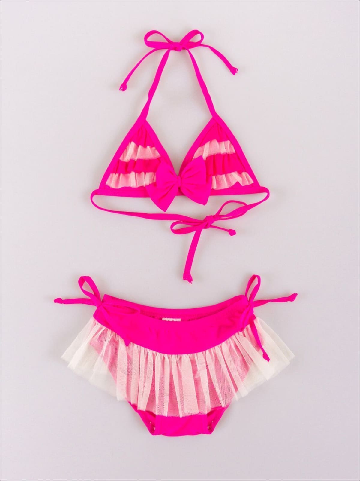 Let her soak up the sun and water in this delicately beautiful and detailed bikini she won't want to take off! From its mesh ruffles to bow detail, who wouldn't want to be seen in this beauty?