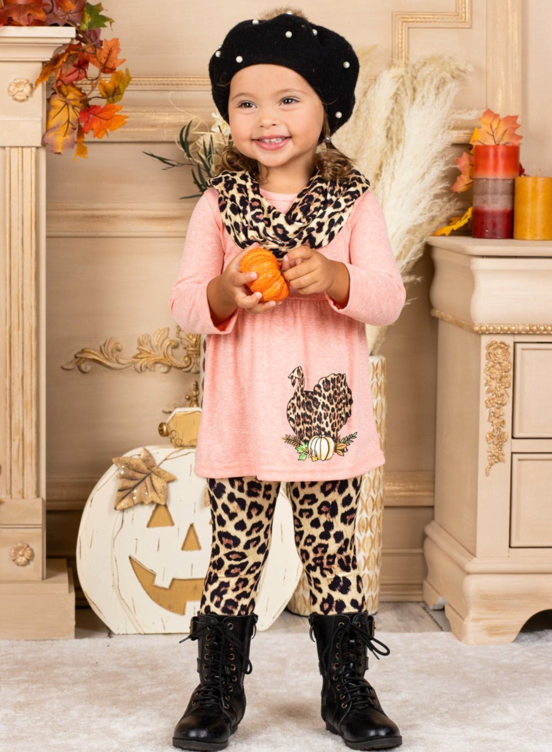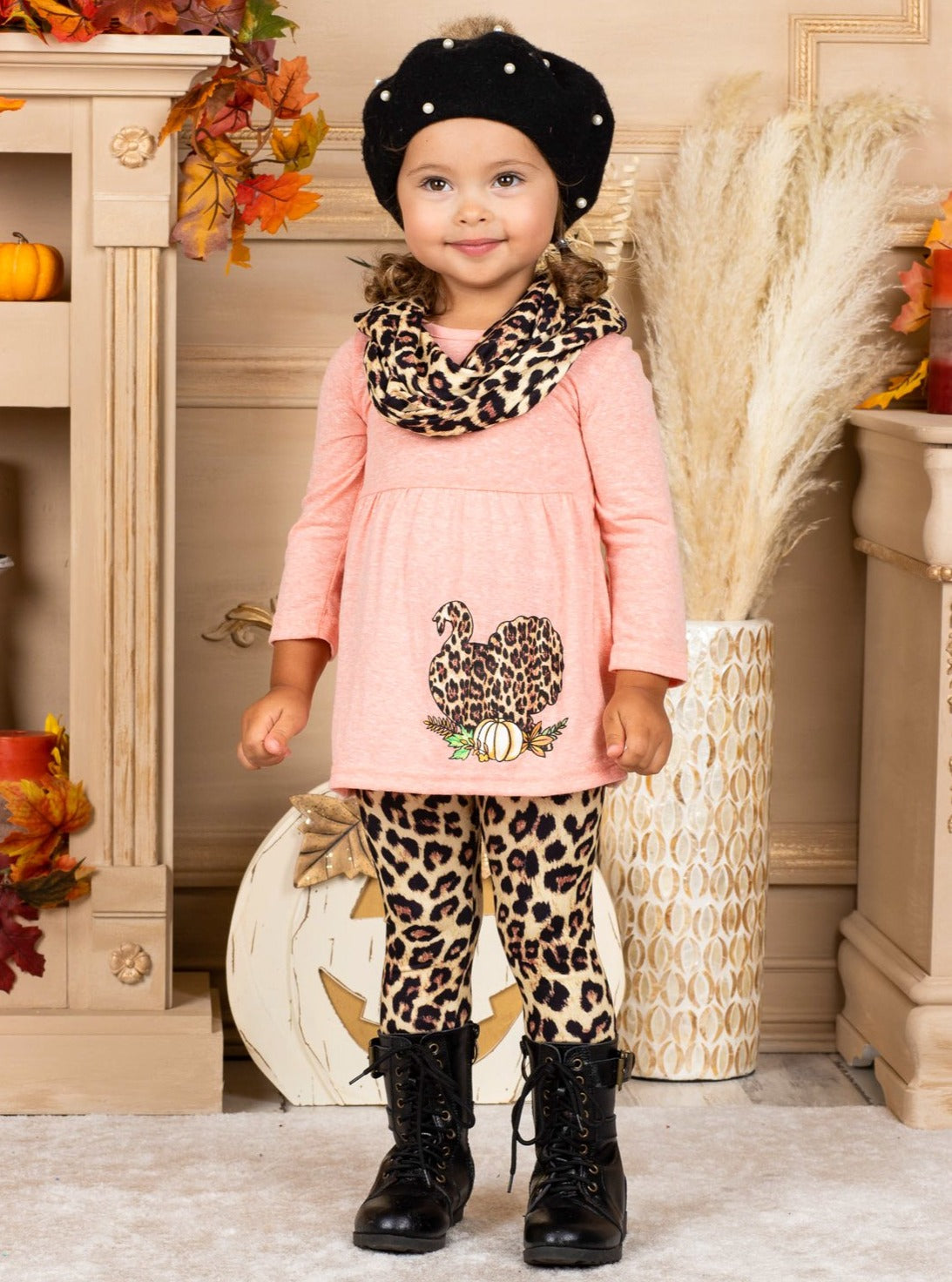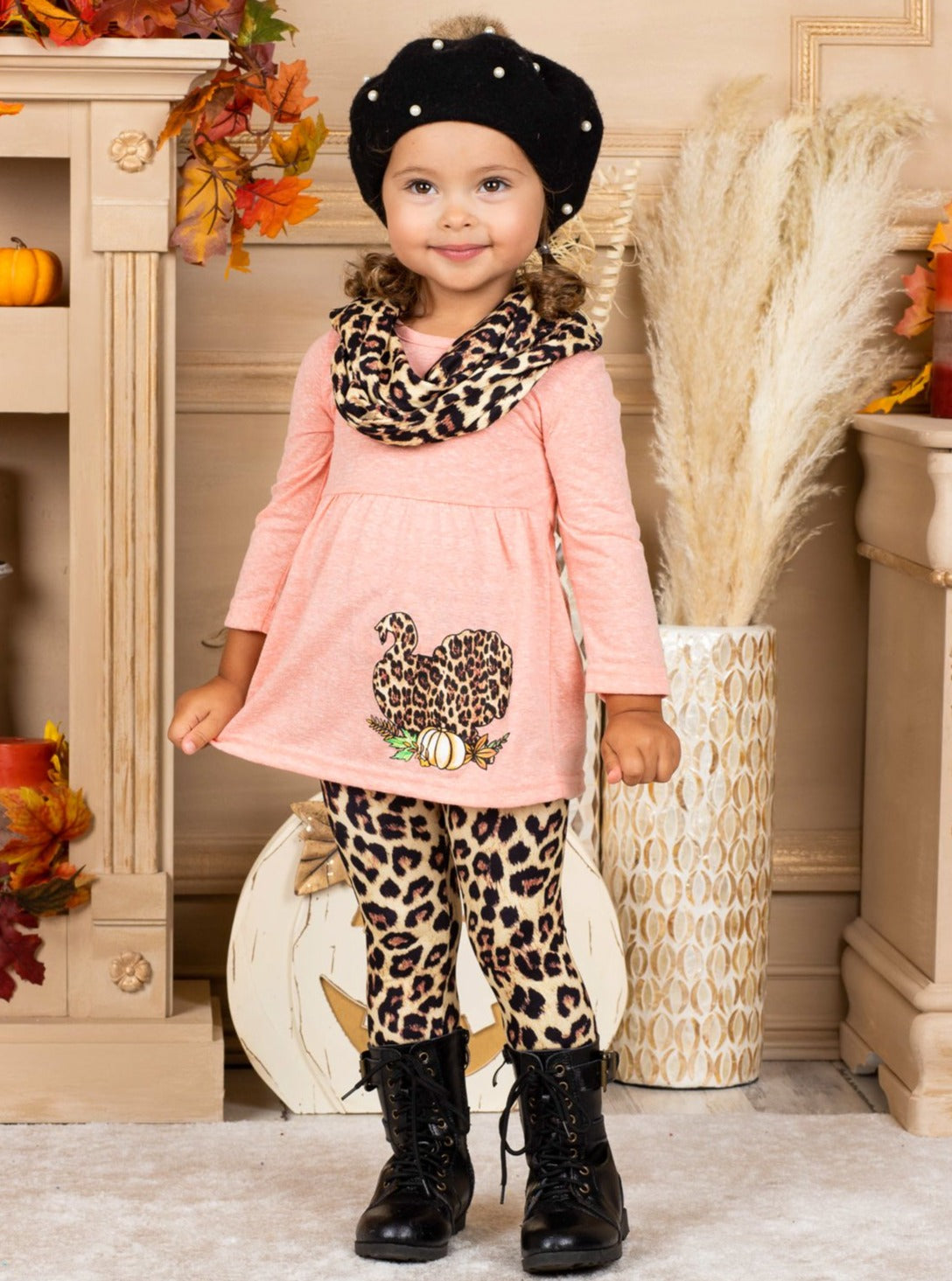 • When it comes to fall fashion, even the turkeys are wild! Love the way your little girl looks this Turkey Day season wearing our turkey tunic, leopard legging, and scarf set.