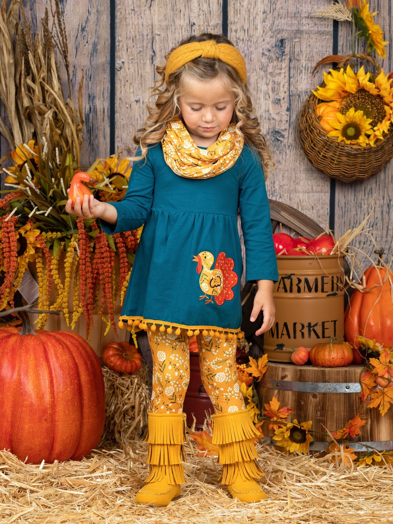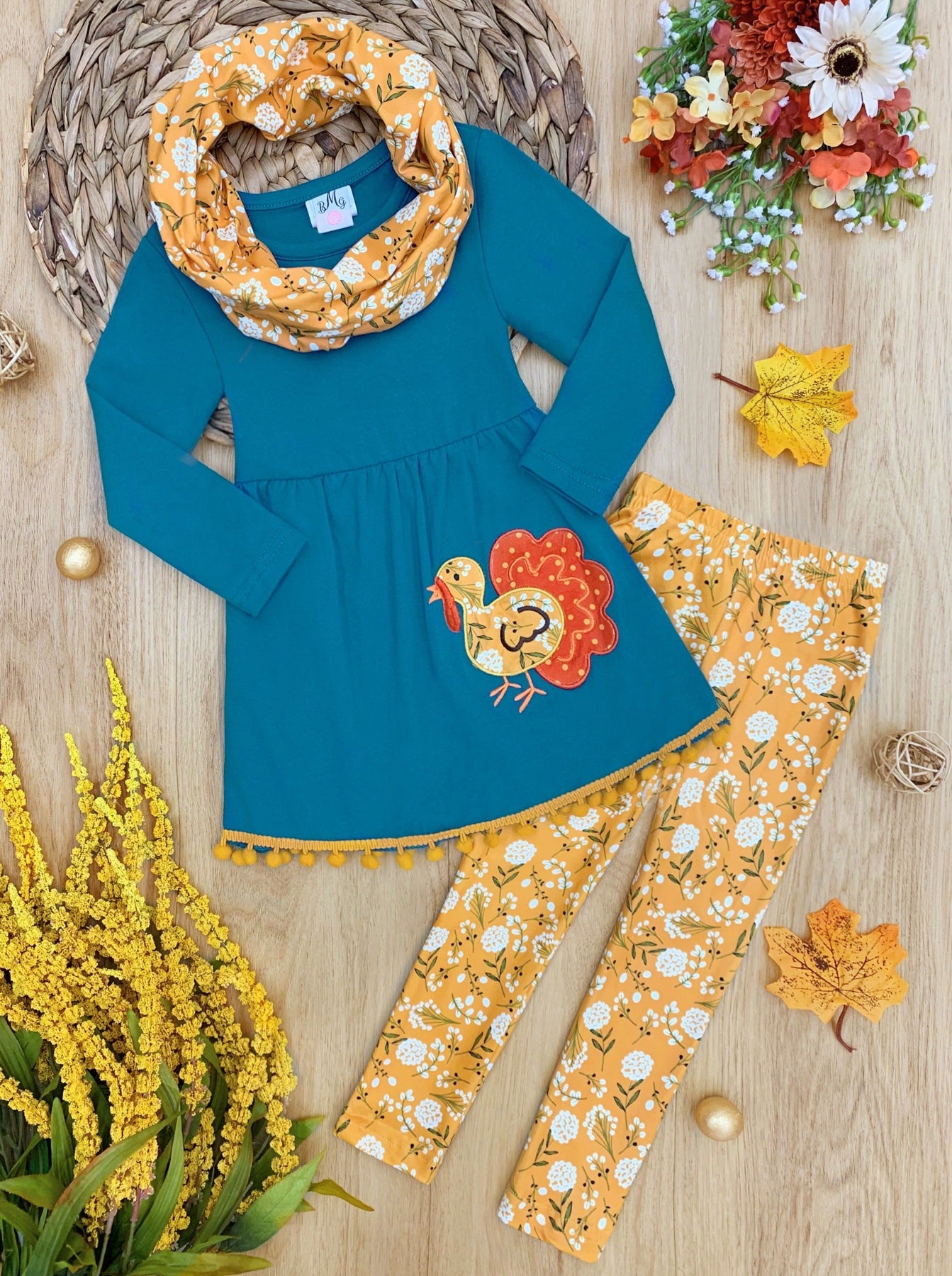 Long-sleeve blue tunic with pom-pom hem and turkey applique, floral print leggings with a matching infinity wrap scarf