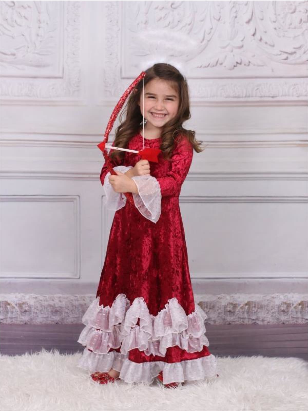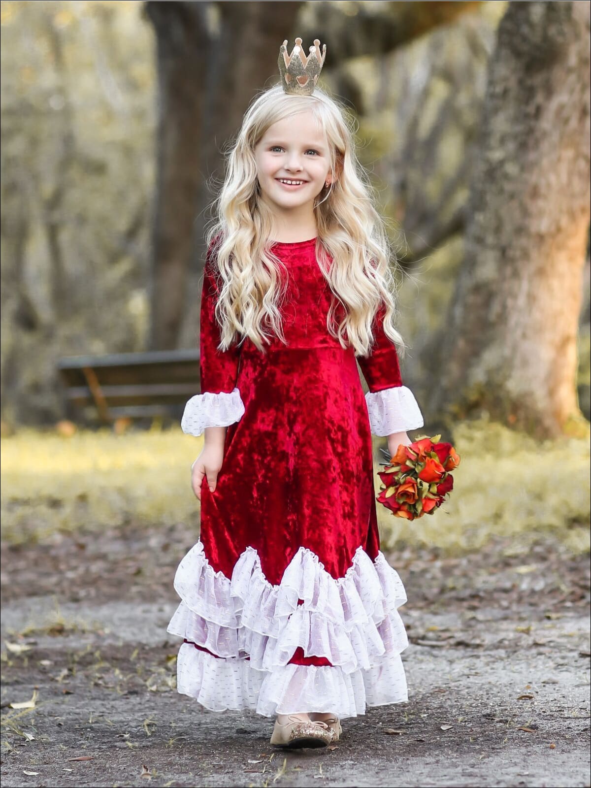 Girls Burgundy Velvet Princess Maxi Holiday Dress with Ruffled Waves