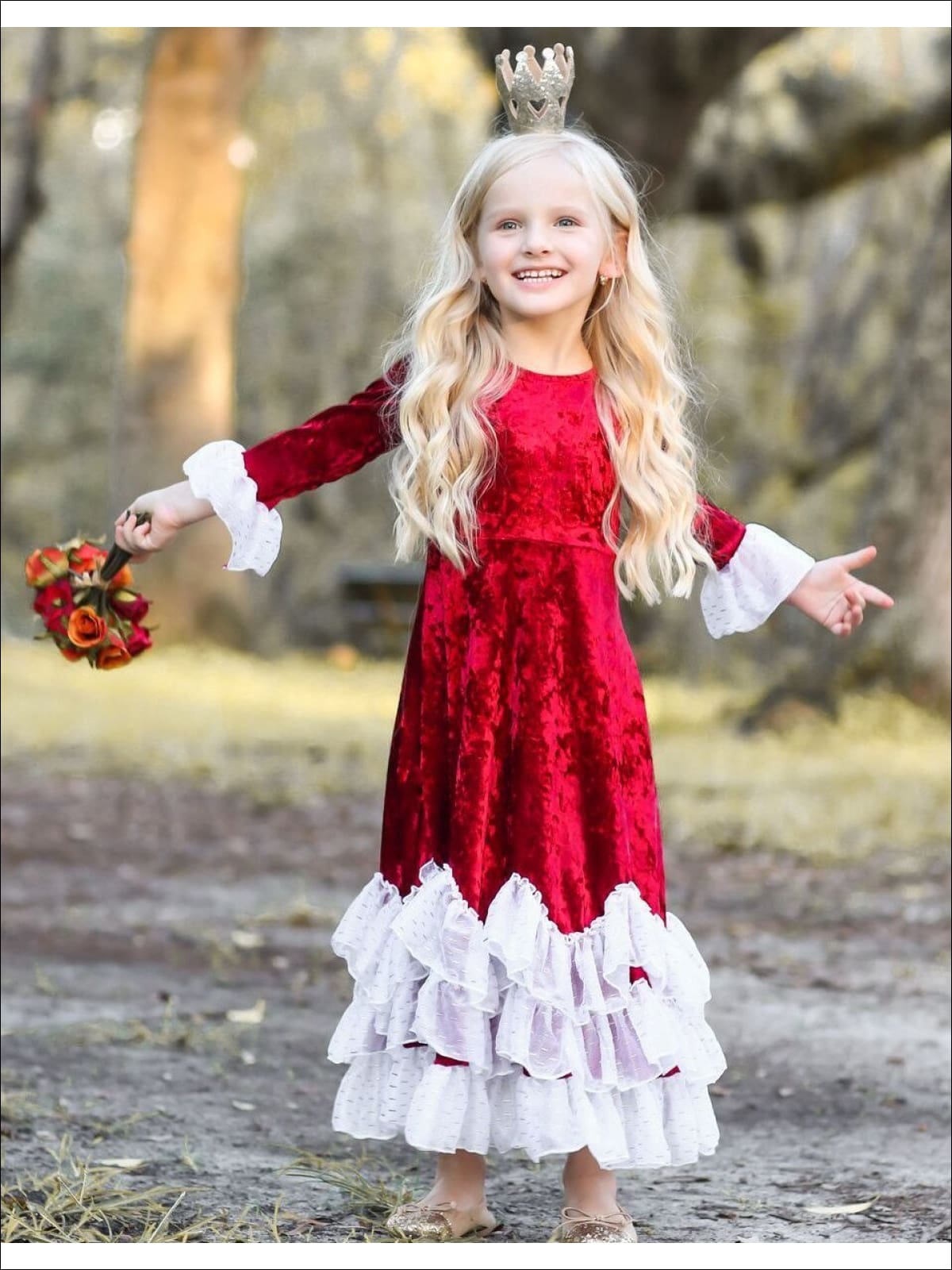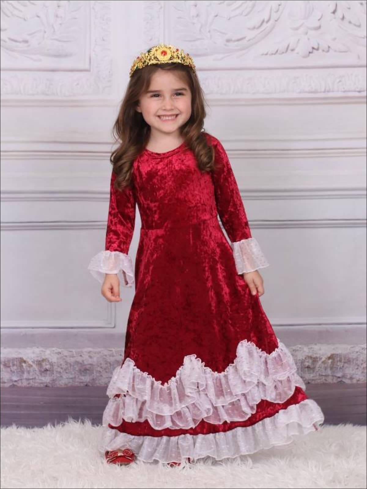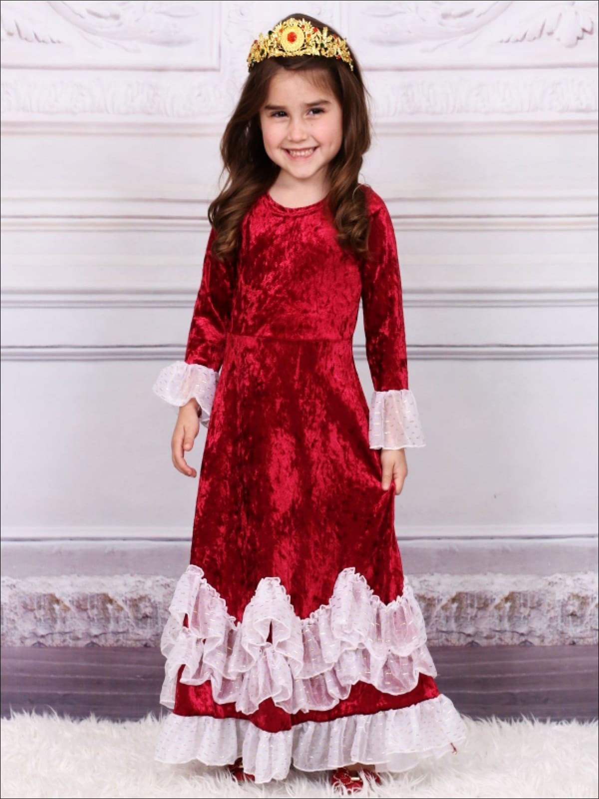 Girls Burgundy Velvet Princess Maxi Holiday Dress with Ruffled Waves - Girls Fall Dressy Dress