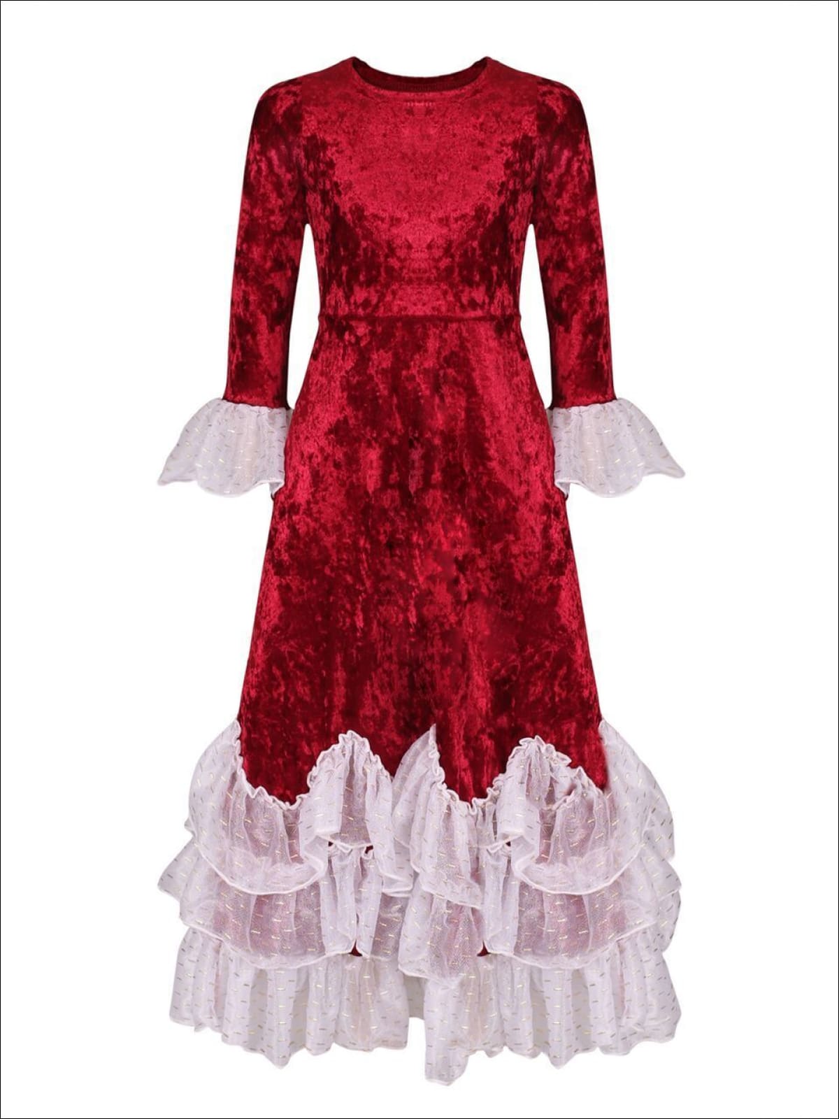 Girls Burgundy Velvet Princess Maxi Holiday Dress with Ruffled Waves - Burgundy / 2T/3T - Girls Fall Dressy Dress