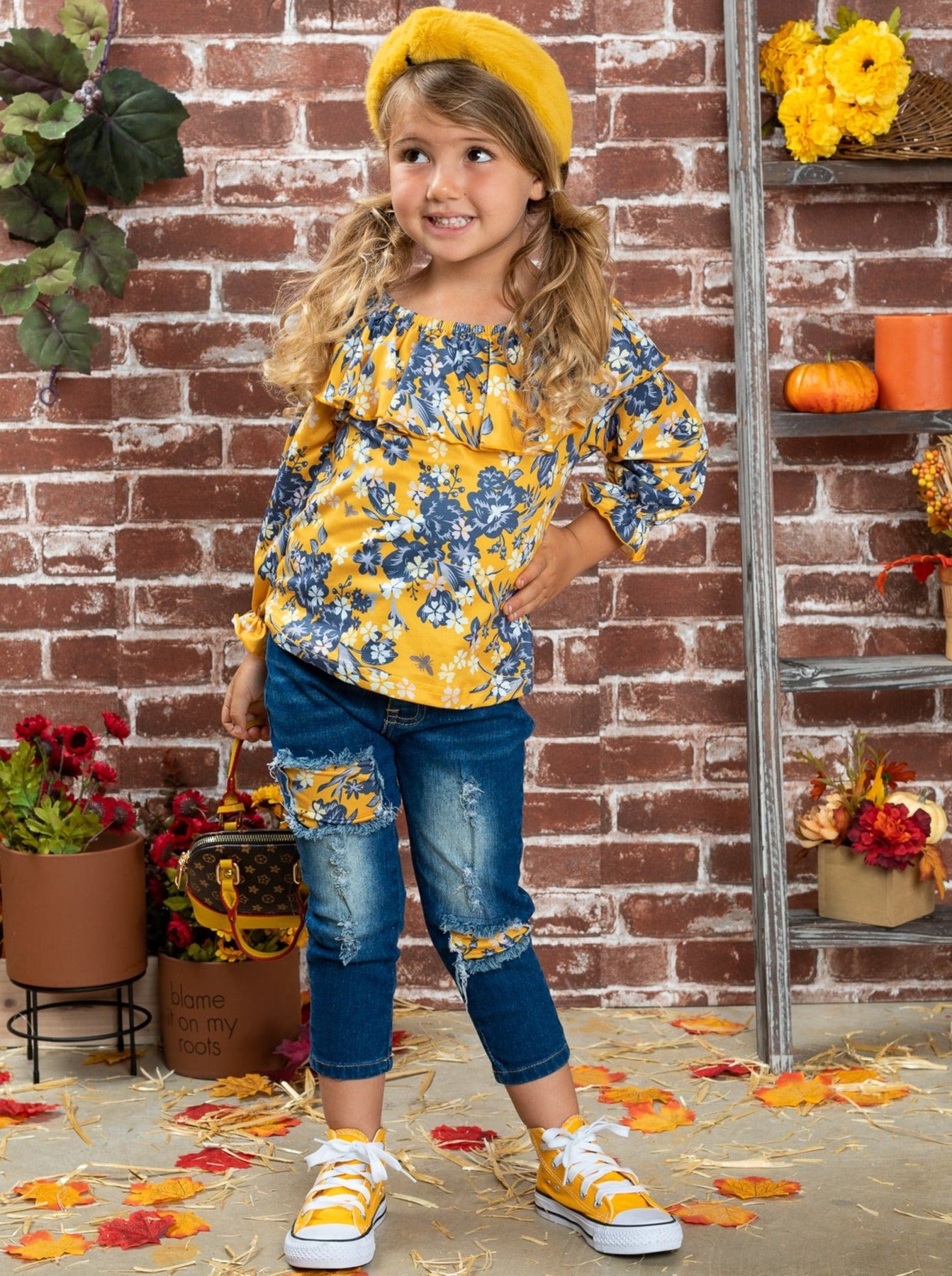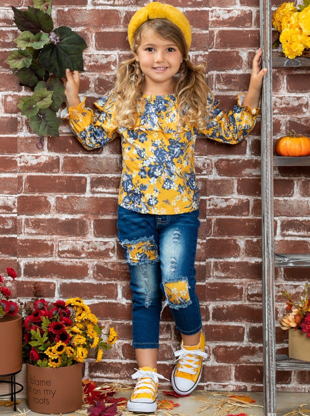 Let her FALL in love with her cold-weather wardrobe all over again! Prep your girl for chilly days with the stylish protection of this easy all-in-one look. She’ll be styled in a flash with this fully composed ensemble that comes with a wildflower printed top and matching patched jeans crafted from lightweight fabric and sporting a double ruffle neckline bib.