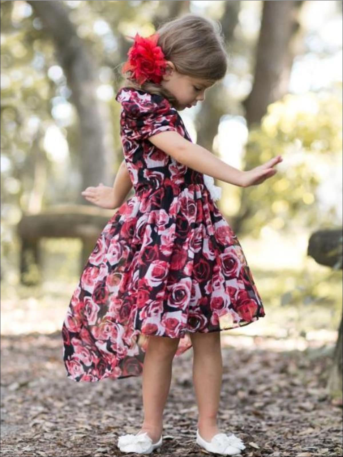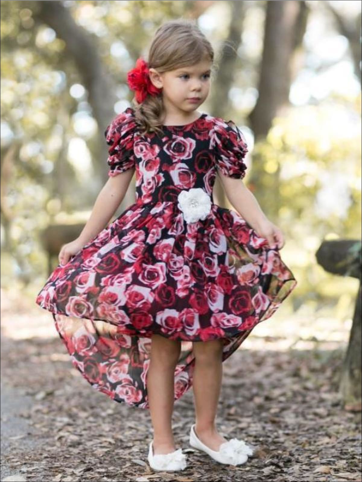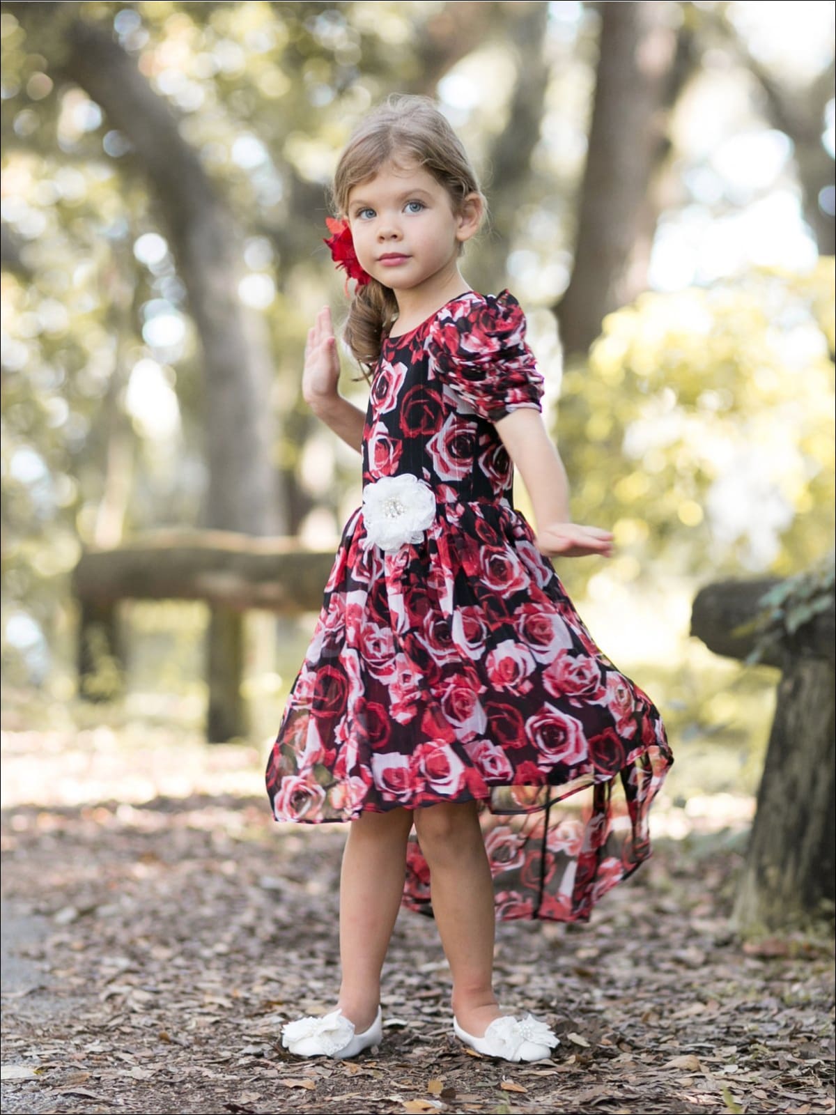 Girls Winter Red Rose Hi-Lo Dress with Gathered Cap Sleeves