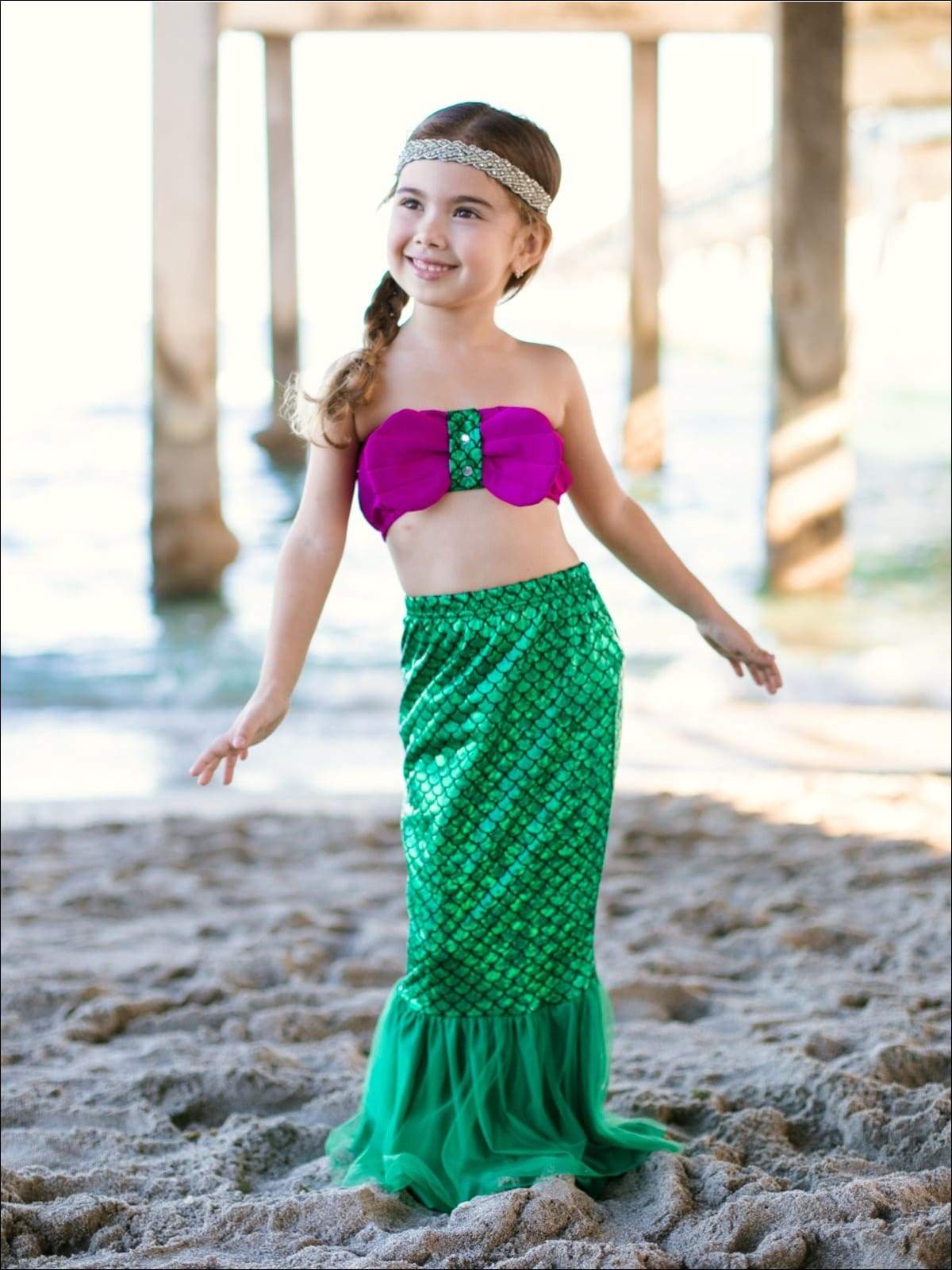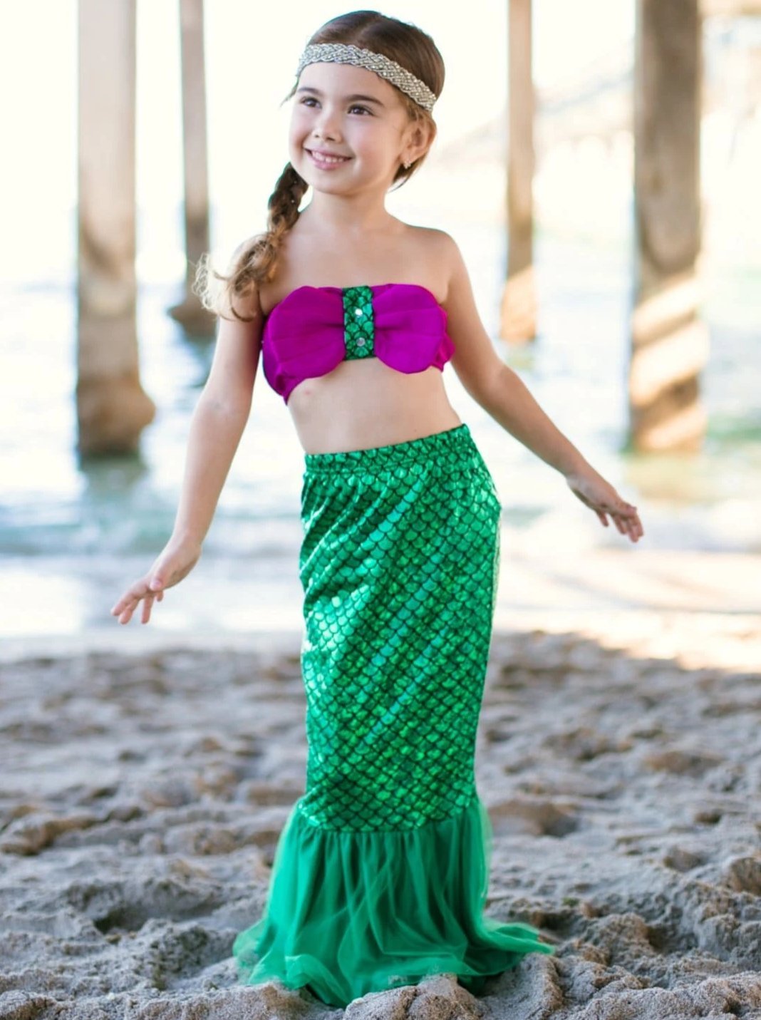 Little Mermaid who? Your water-loving cutie might just take over the fantastical role in this shiny mermaid bikini and tail skirt cover up. Grant her the ultimate spring dream to master the water looking fabulous and mystical!