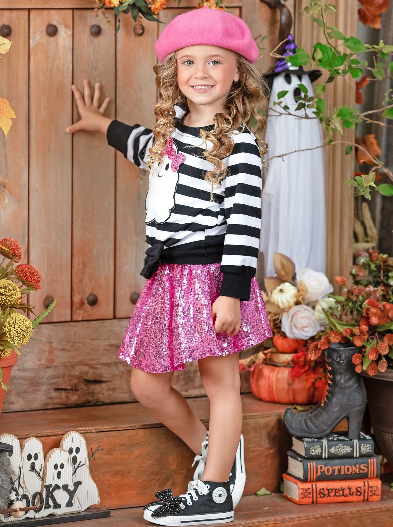 Long-sleeve striped knot-hem top with ghost girl applique glitter bow and matching sequin skirt