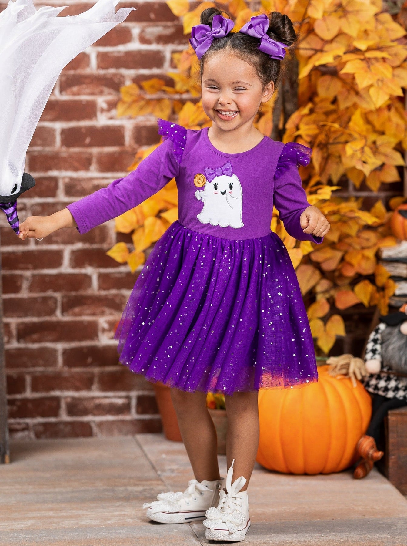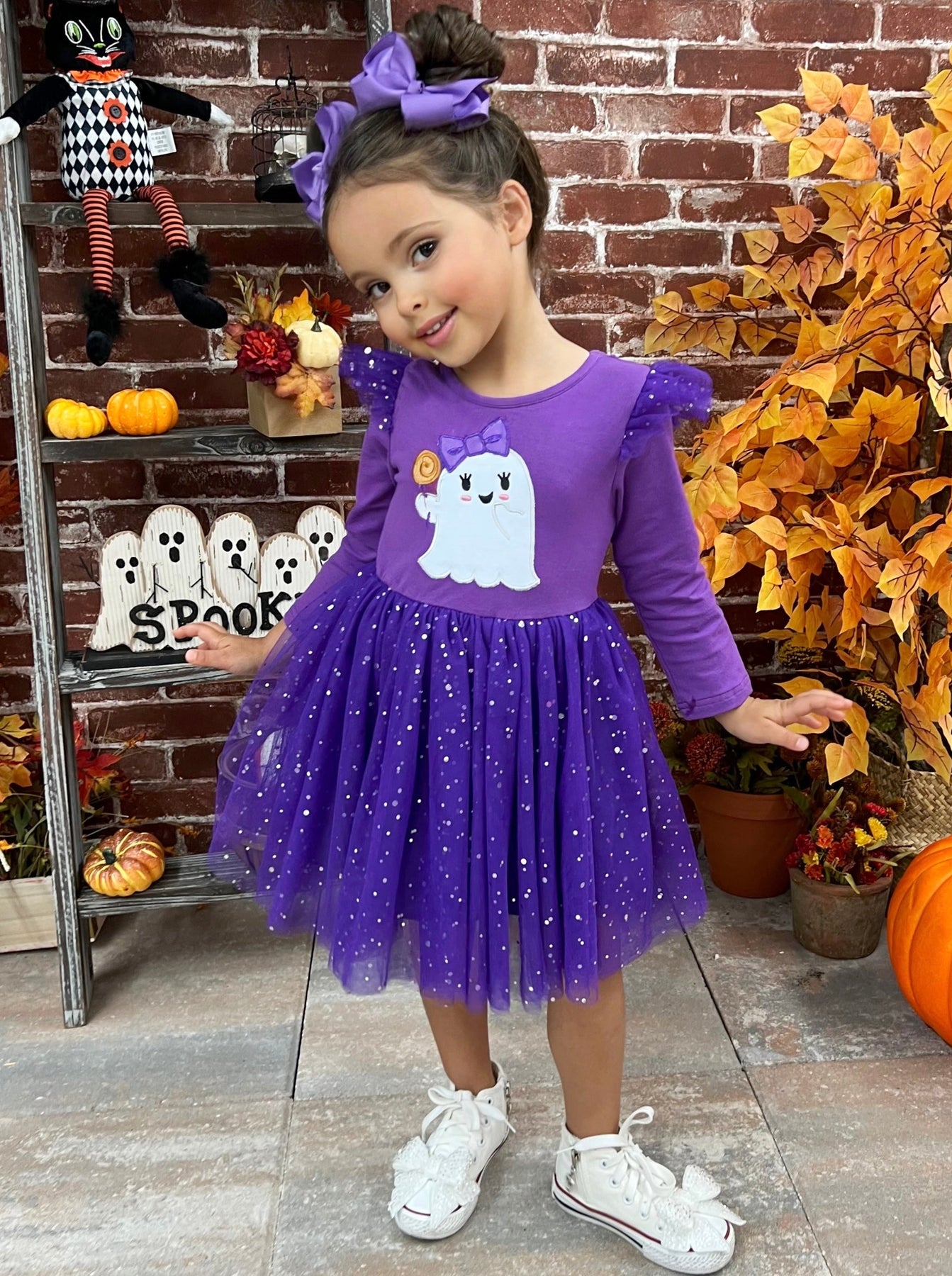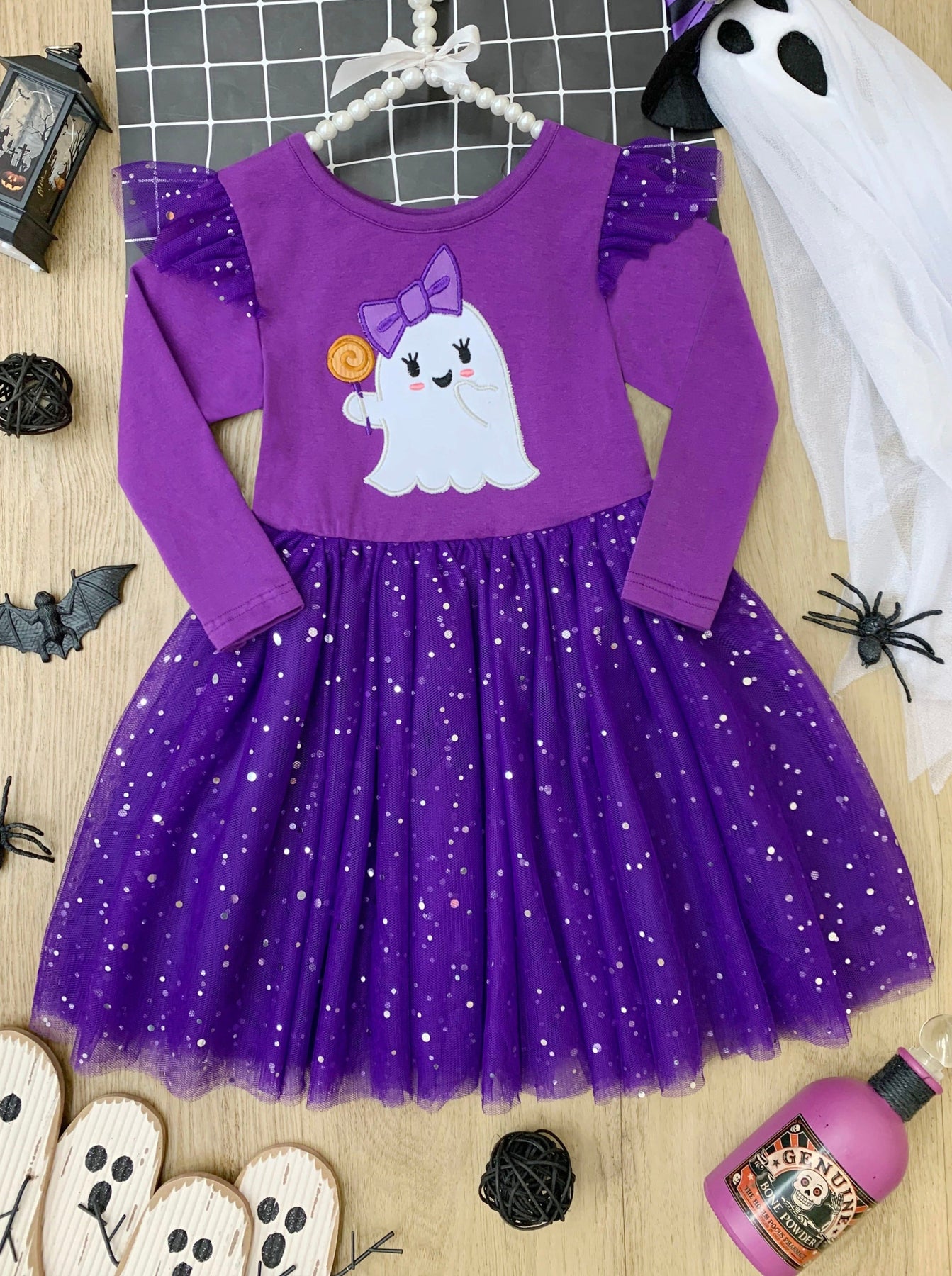 • Long sleeve tutu dress with ghost graphic, flutter shoulders, and a sparkly sequin tutu skirt