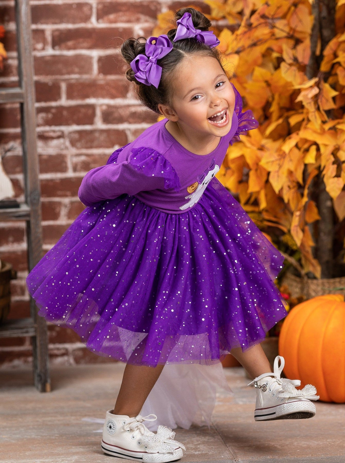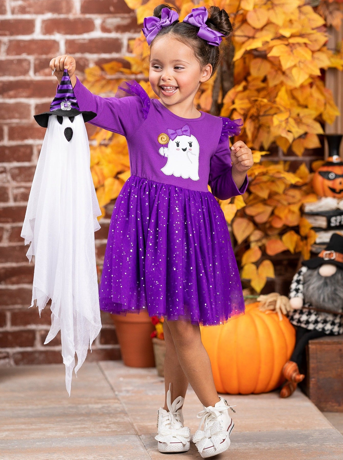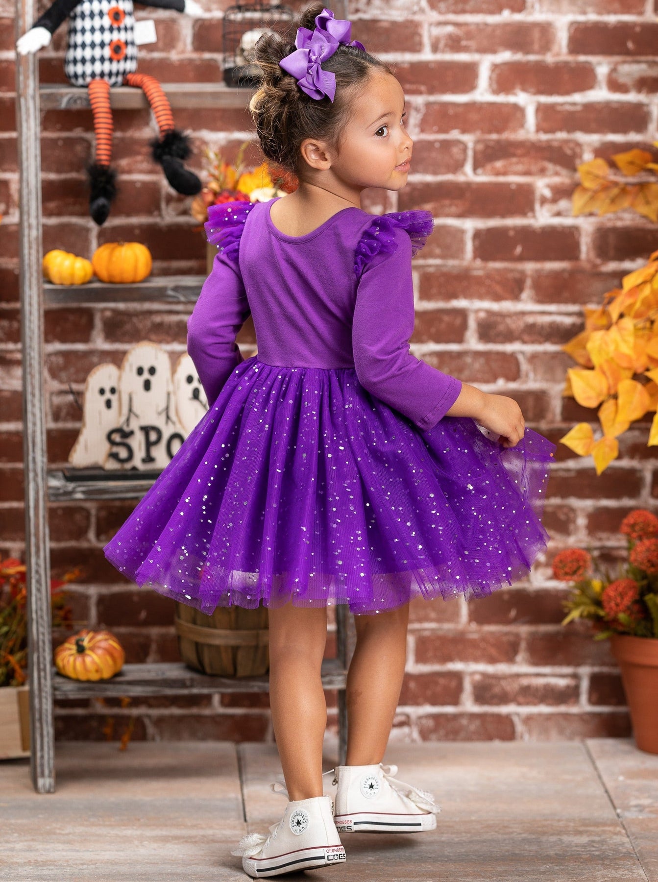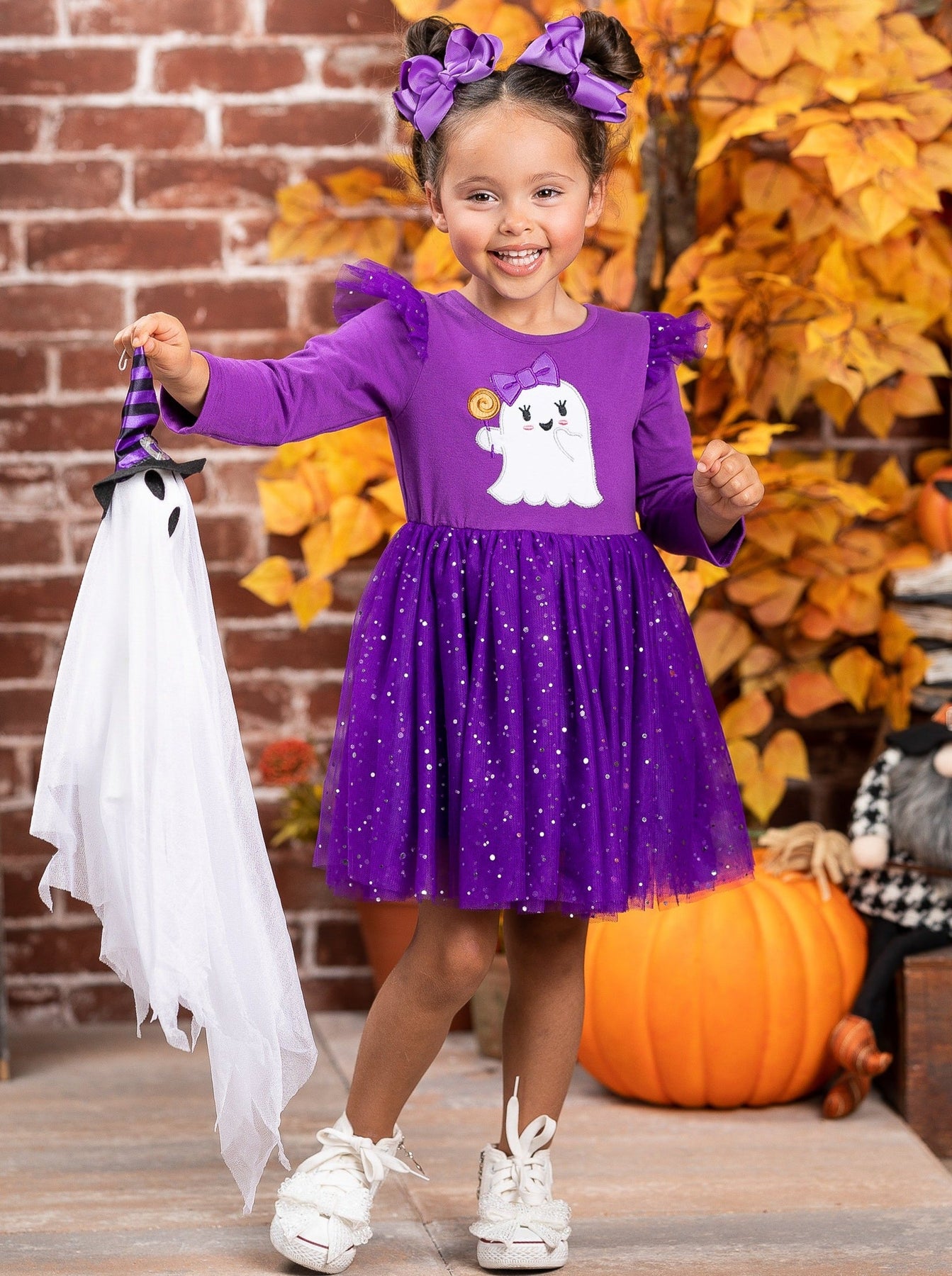 • Long sleeve tutu dress with ghost graphic, flutter shoulders, and a sparkly sequin tutu skirt