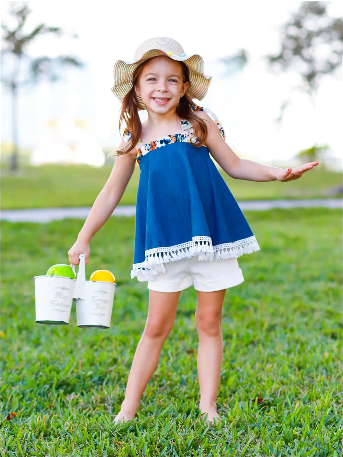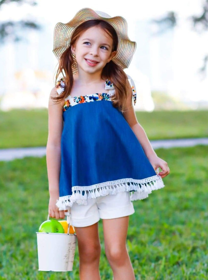 Girls Indigo Denim Swing Top with Printed Band & Fringe Trim - Girls Spring Top