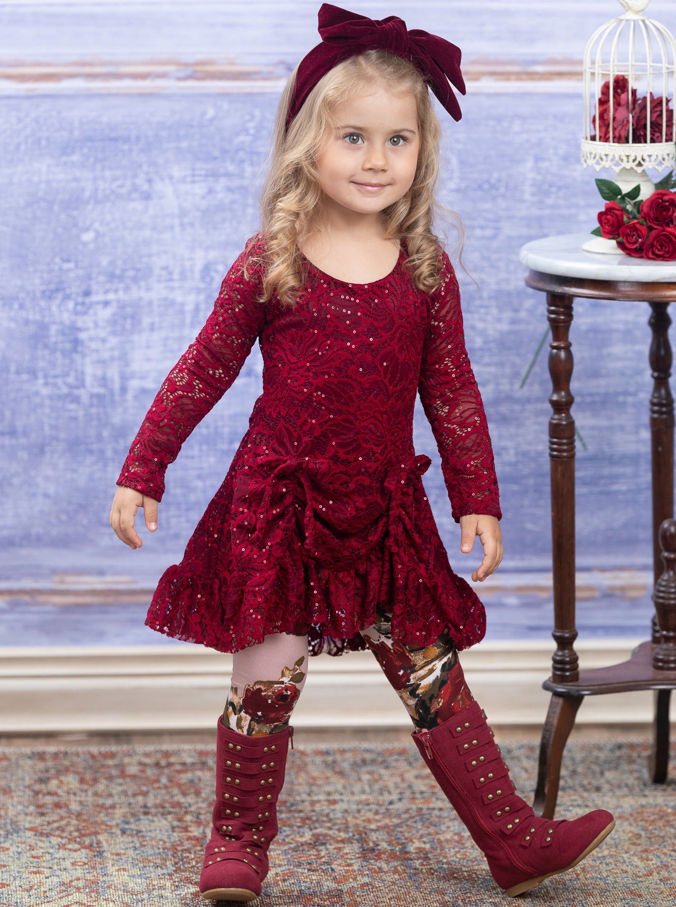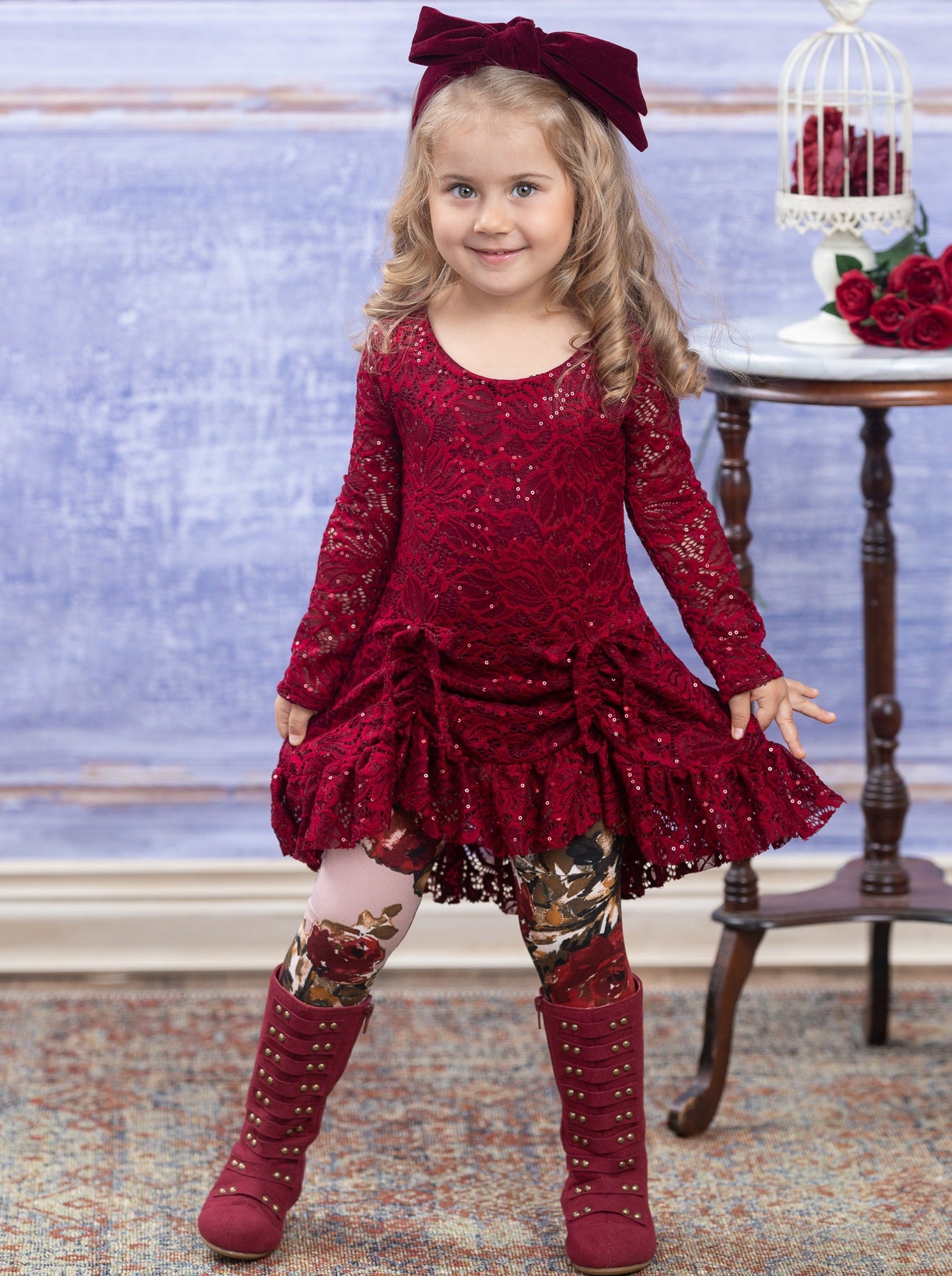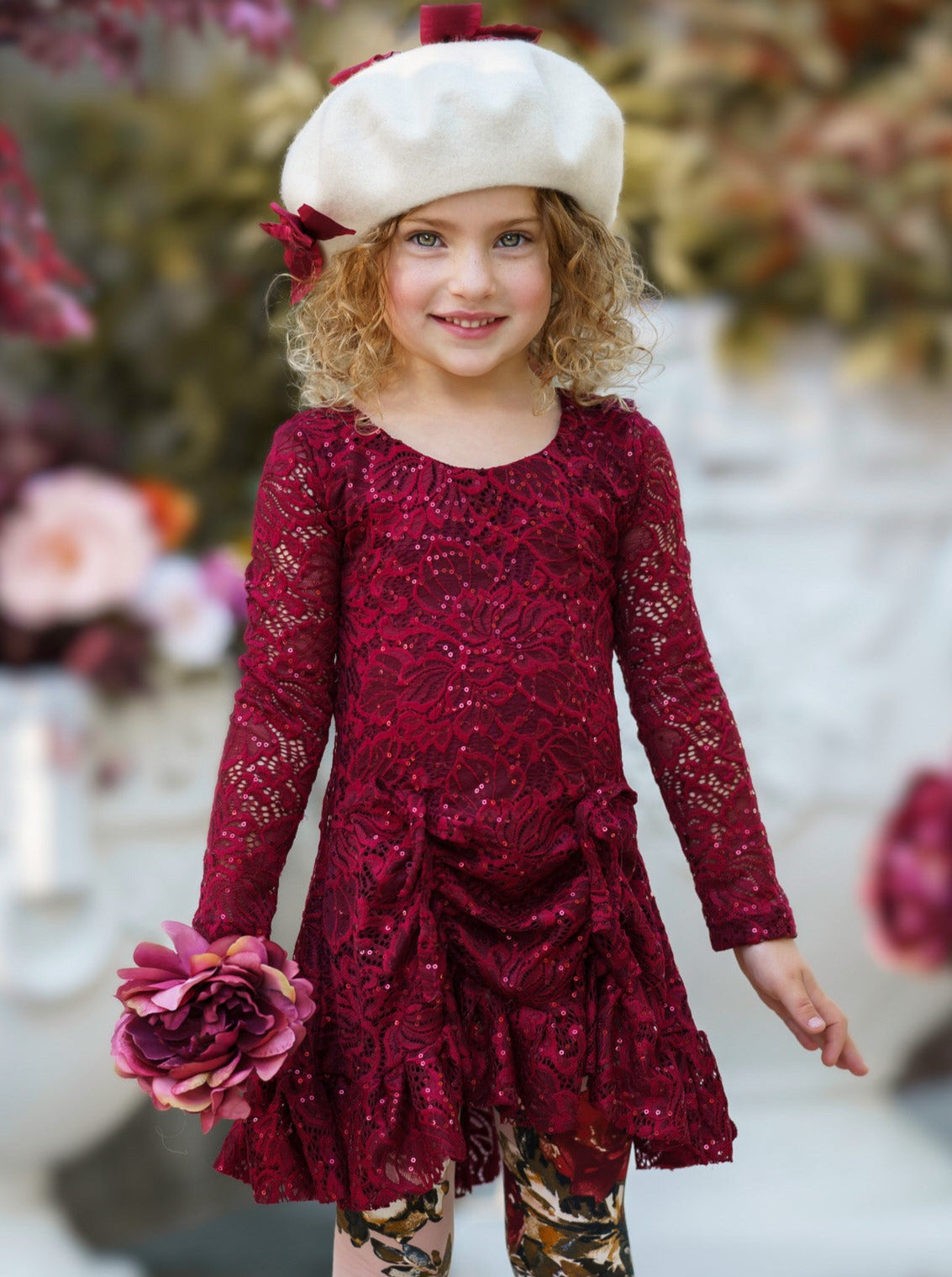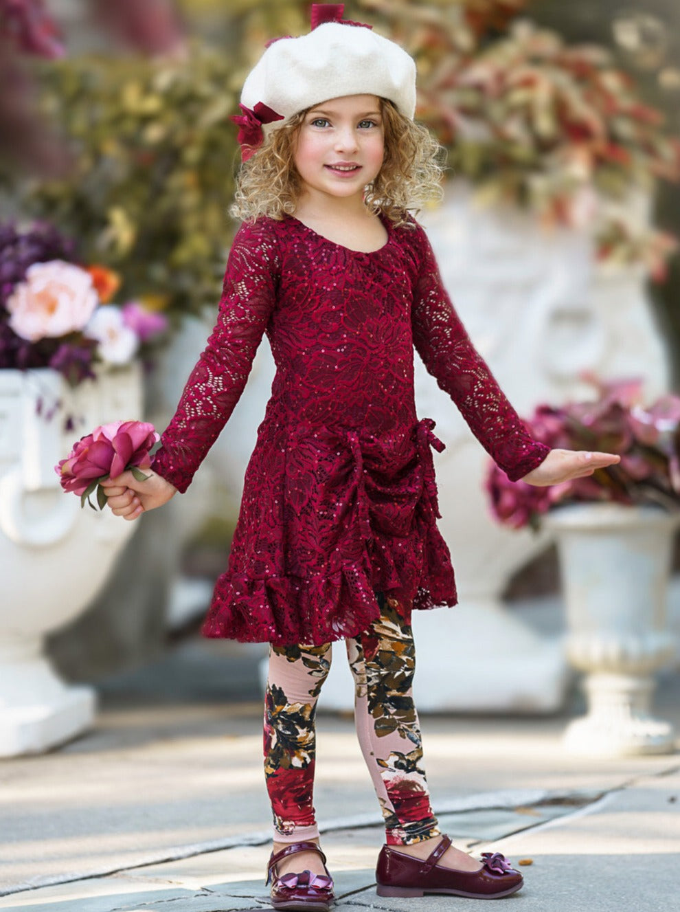We added sparkly sequin to our lace drawstring tunic and floral legging set! She'll dazzle the room with grace and style. A Fall must-have for your little girl.