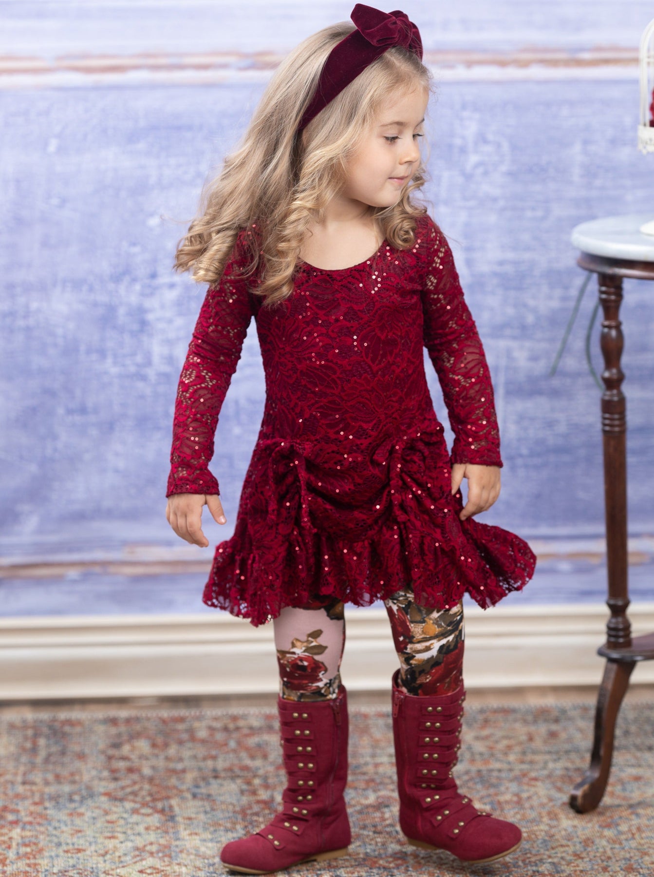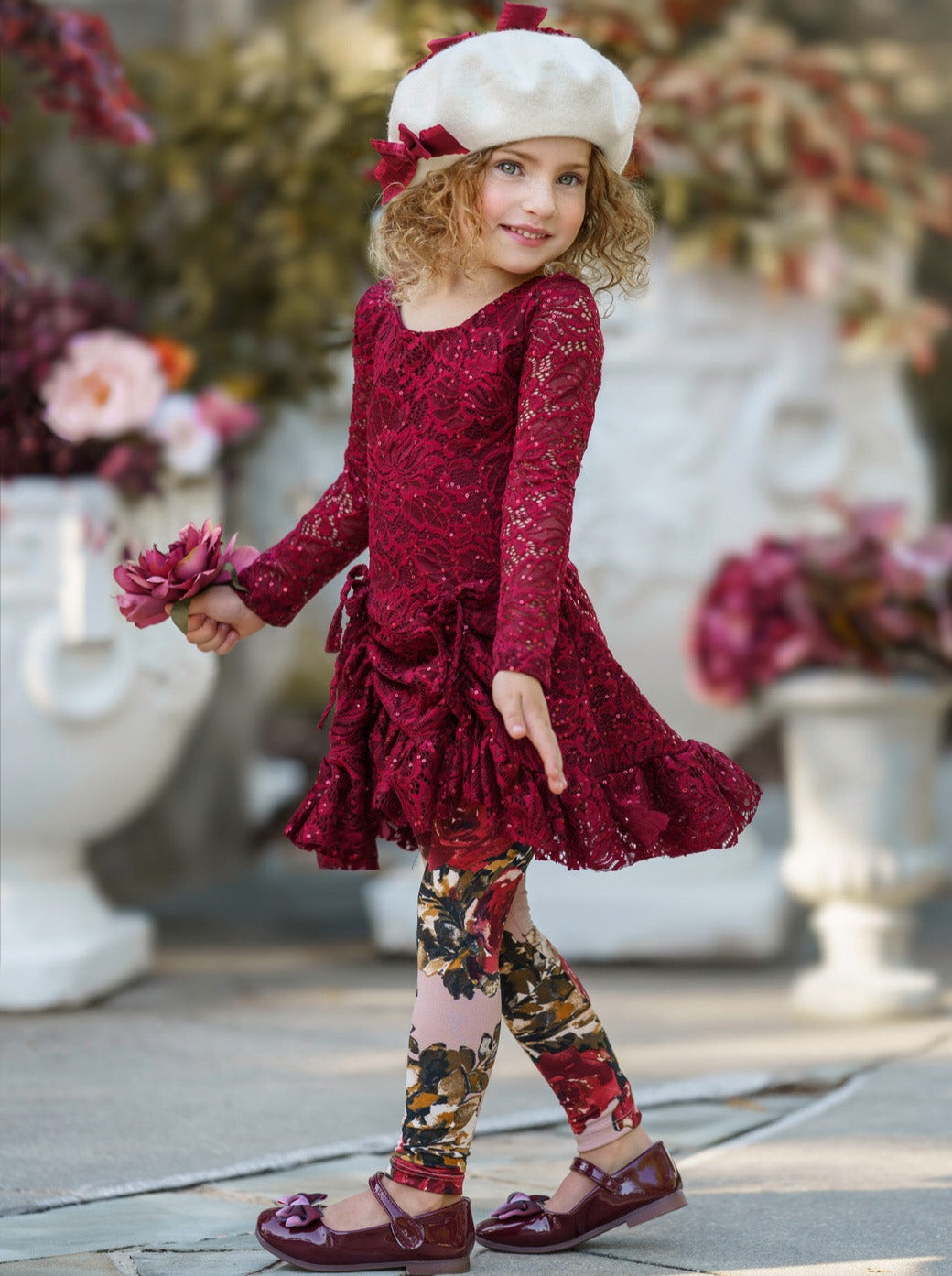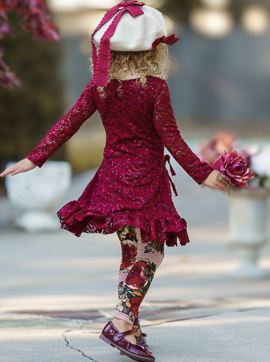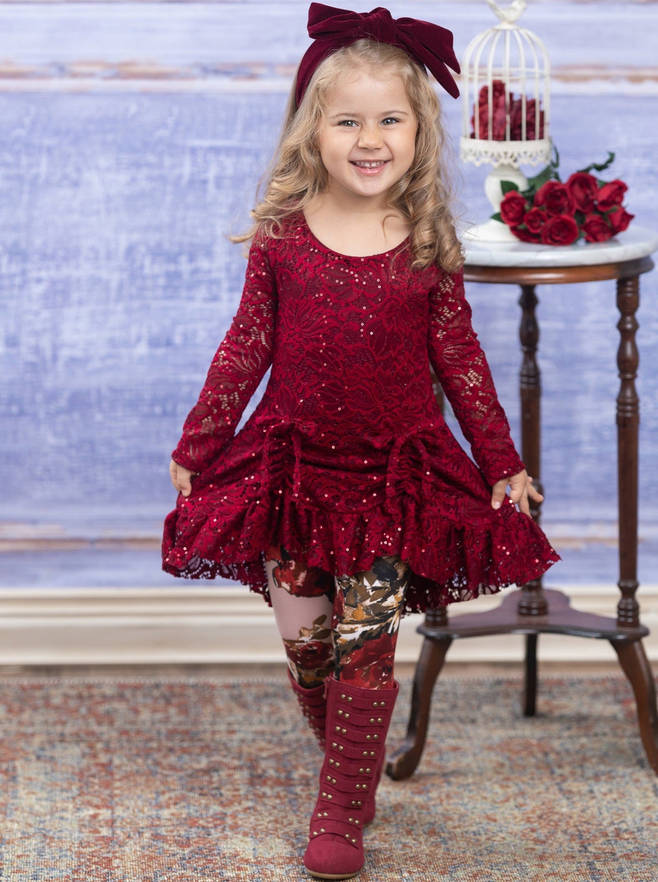 We added sparkly sequin to our lace drawstring tunic and floral legging set! She'll dazzle the room with grace and style. A Fall must-have for your little girl.