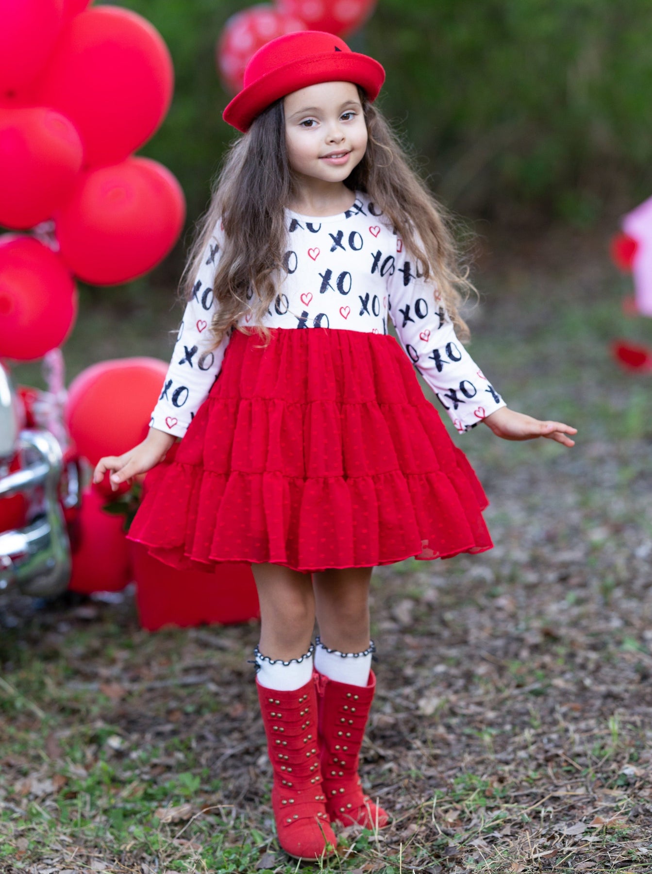 - This darling swiss tulle ruffle dress has our hearts in a bind! Complete with a trendy XOXO print bodice and adjustable tie neckline, it's a must-have for your precious princess.