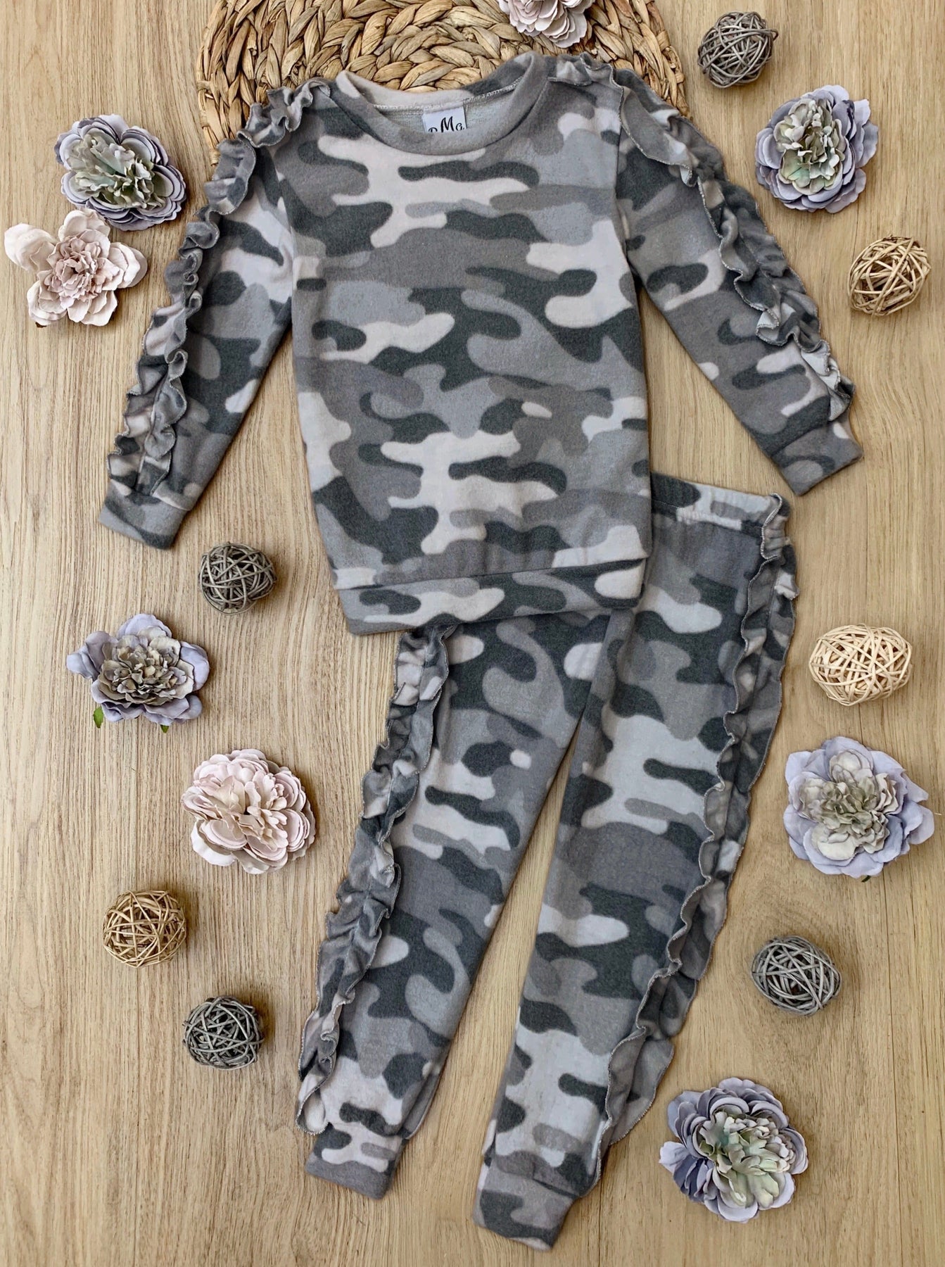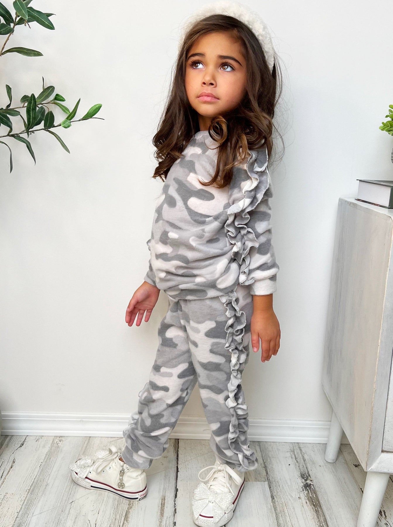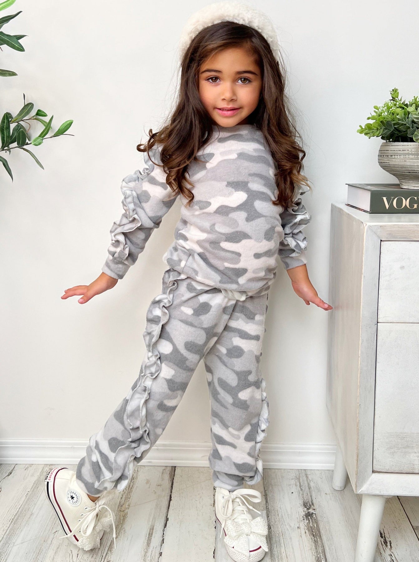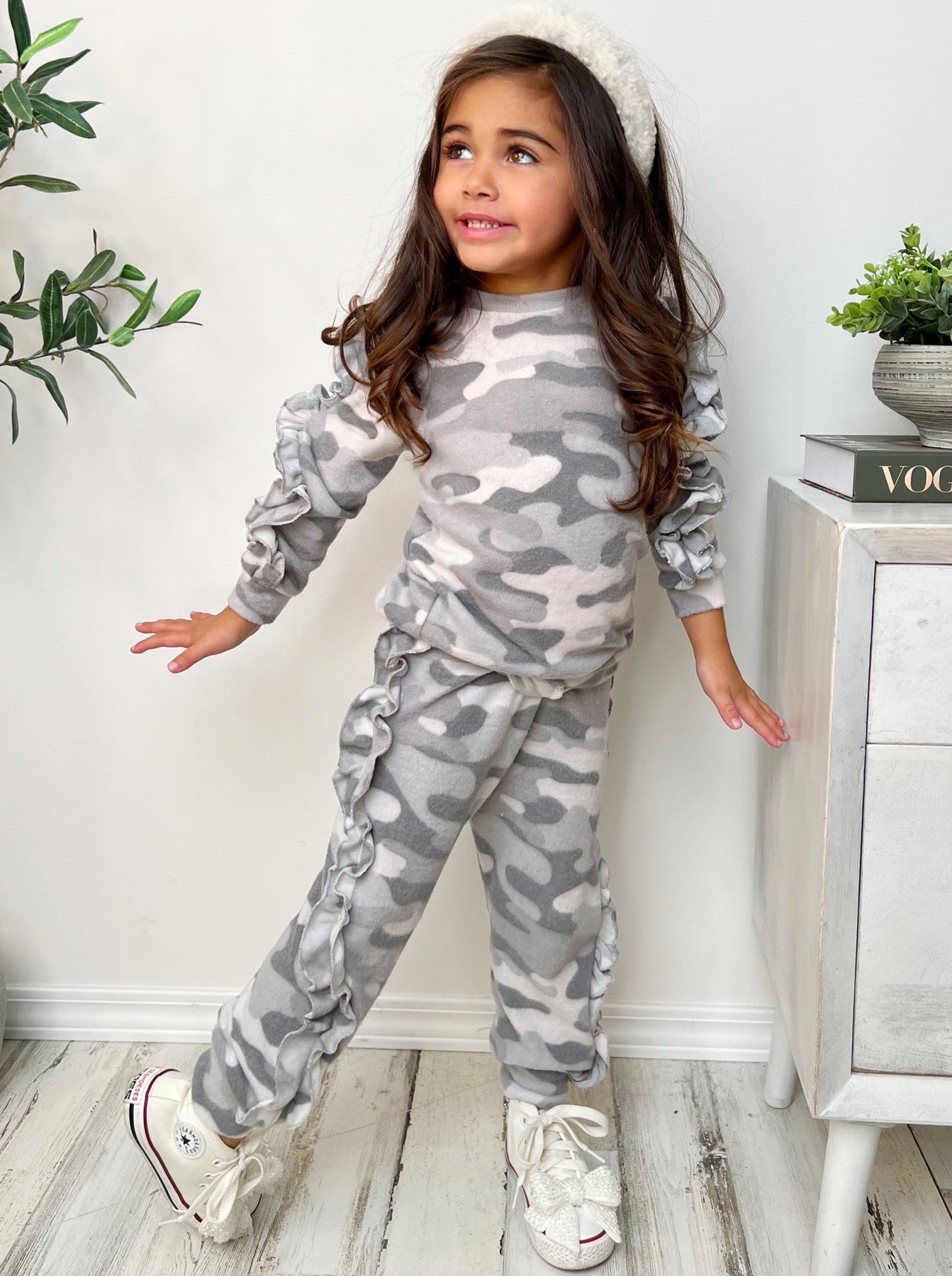 We just found THE most comfortable jogger set to dress your little girl in this fall. Trendy faded camo and cascading ruffle design for lounging or activewear with friends.