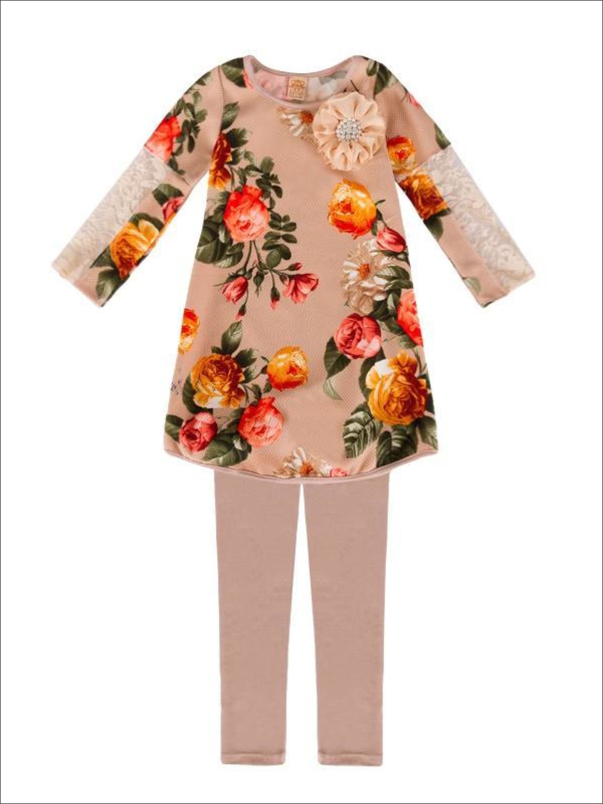 Long lace sleeve tunic with floral print bodice, flower applique, and matching leggings