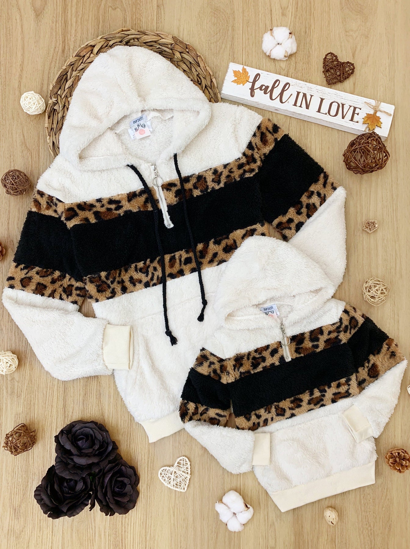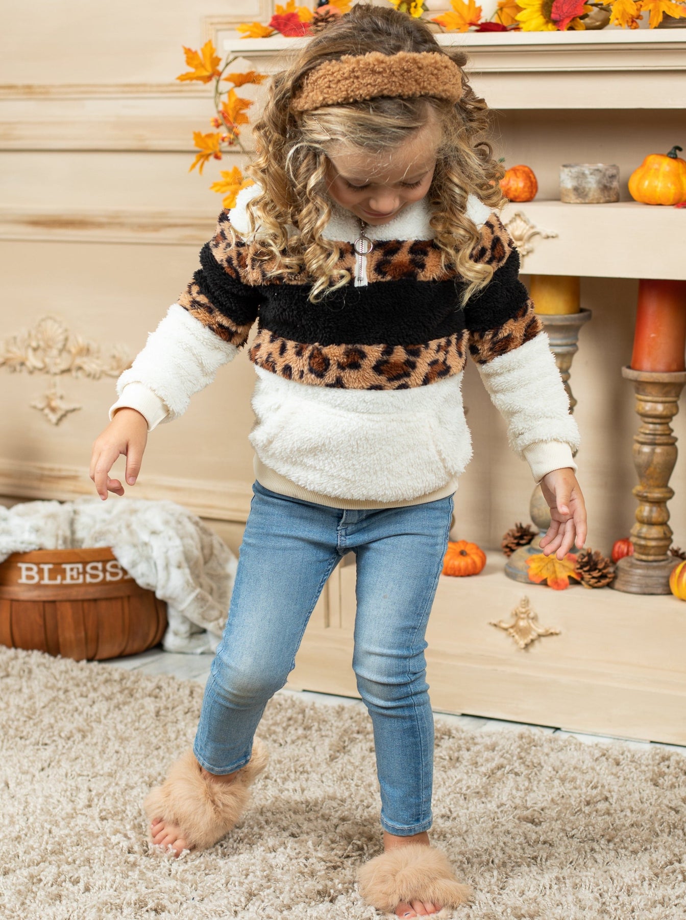 Long-sleeve plush fleece sweater with quarter zip and creme/black/leopard print color blocking and front kangaroo pocket