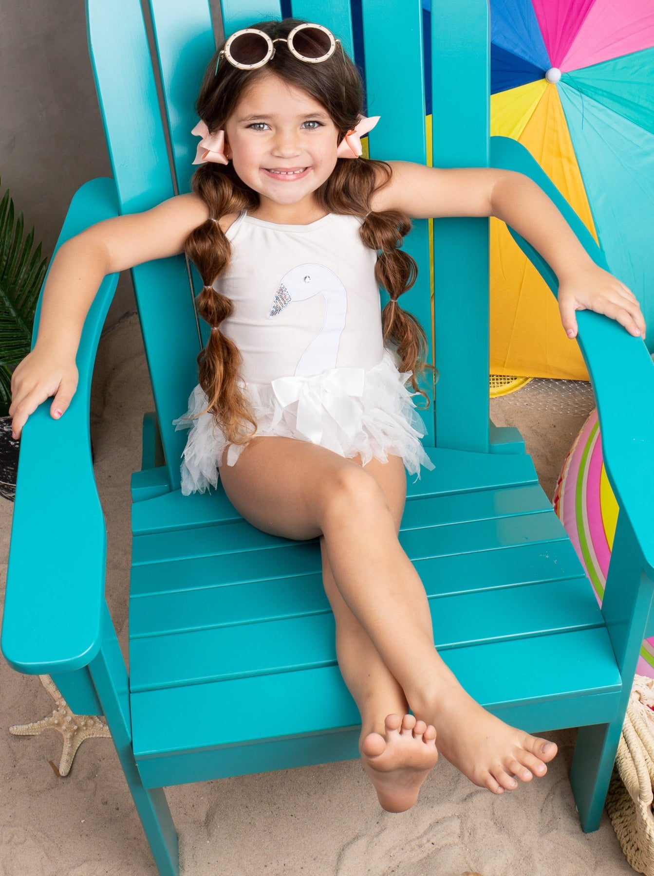 • The one-piece tutu skirted swimsuit adorns a swan with a ribbon bow tie and sequin beak