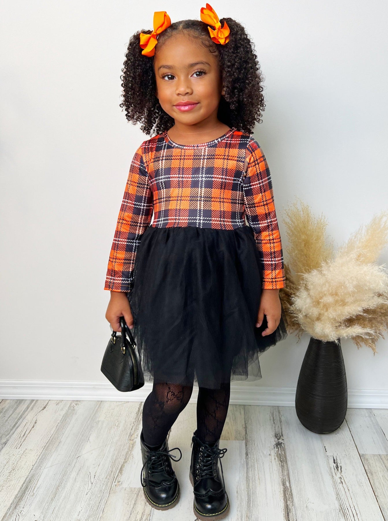Girls Long Sleeved Black and Orange Plaid Tutu Dress - Mia Belle Girls