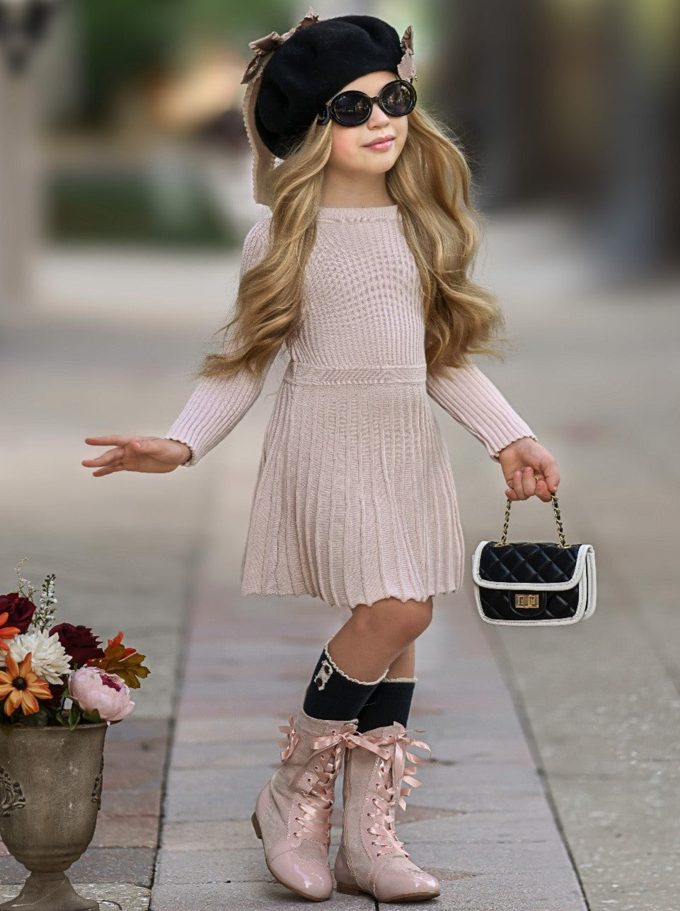 A fabulous and flattering pleated sweater dress for your fashionista's wardrobe. Cute cuffed long sleeves and soft knit fabric make it ideal for school days, family dinners, or just looking sweet.