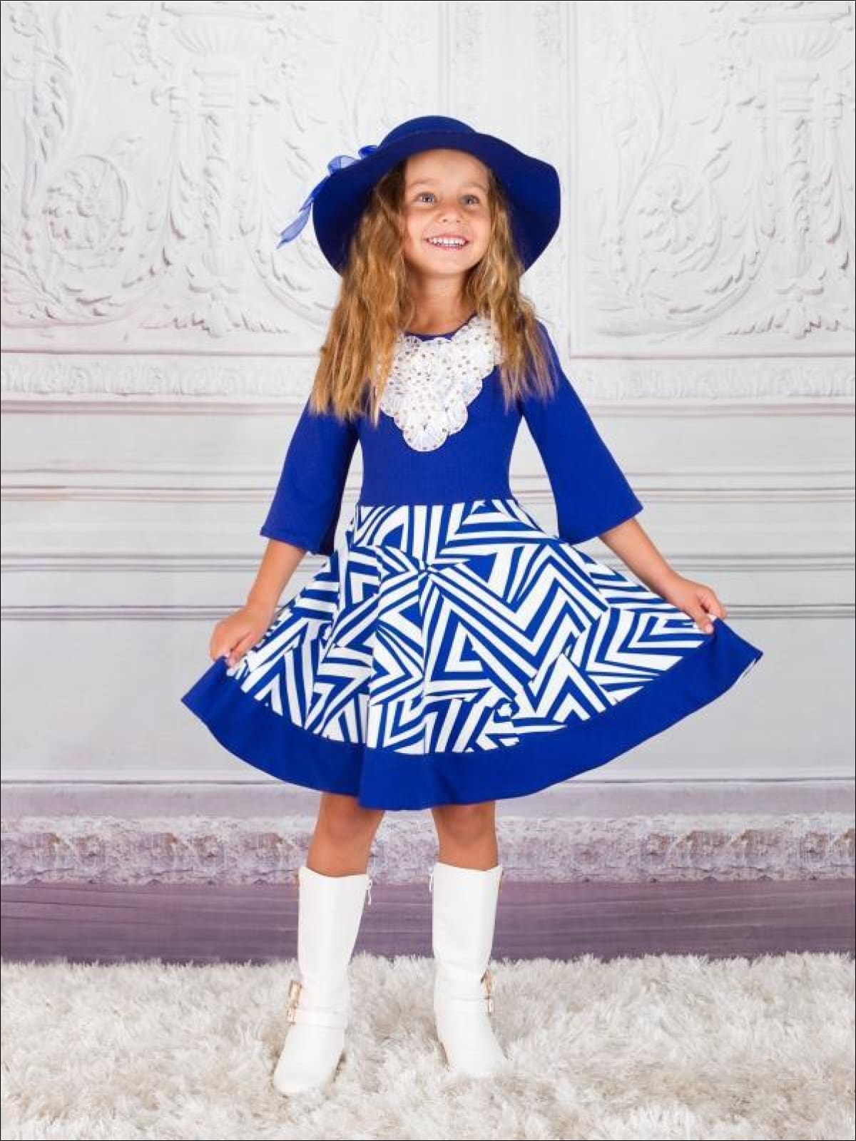 Girls Royal & Creme Circle Skirt Fancy Collar Printed Dress