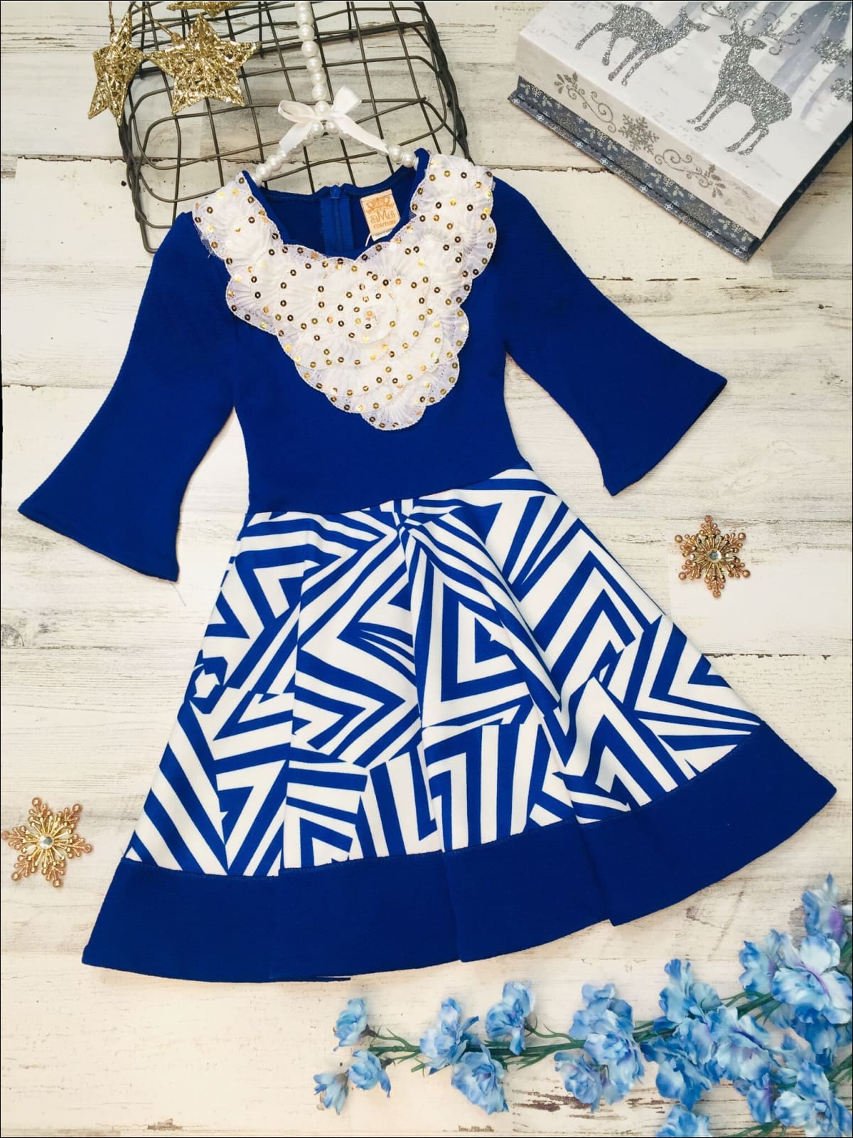Festive & cute, this circle skirt dress offers loads of twirls along with a fancy sequin collar. 3/4 length sleeves are are perfect for cold weather!