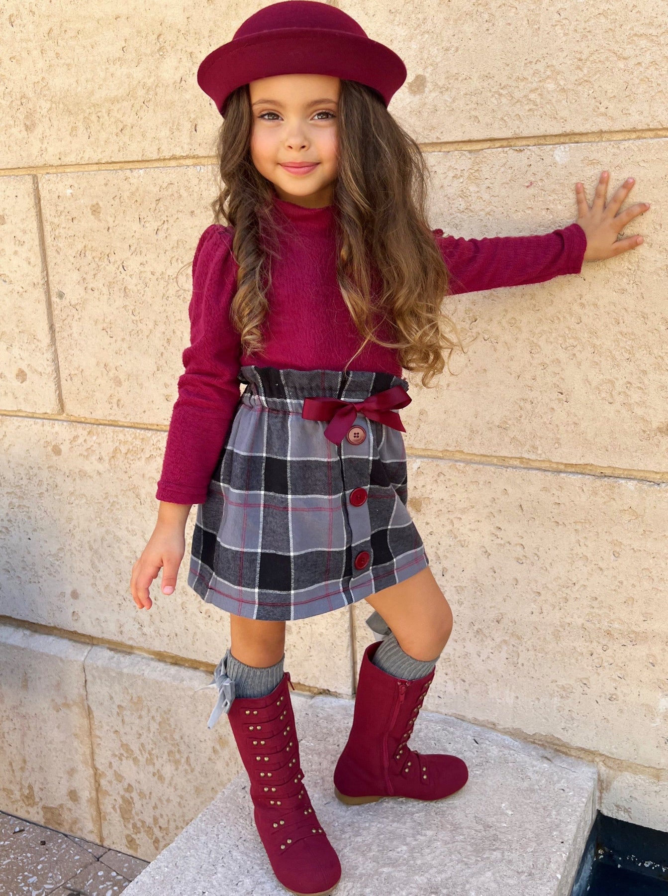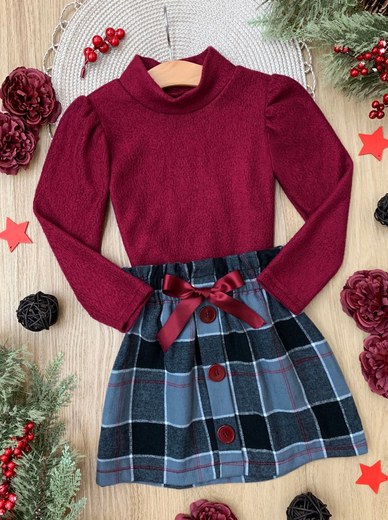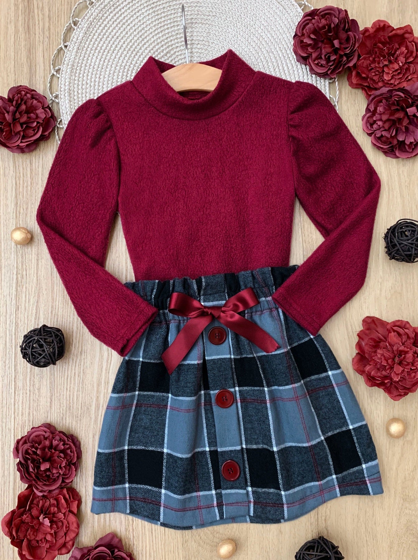 Long-sleeve turtleneck top and plaid skirt with faux buttons, ribbon accents, and a ruffled elastic waist