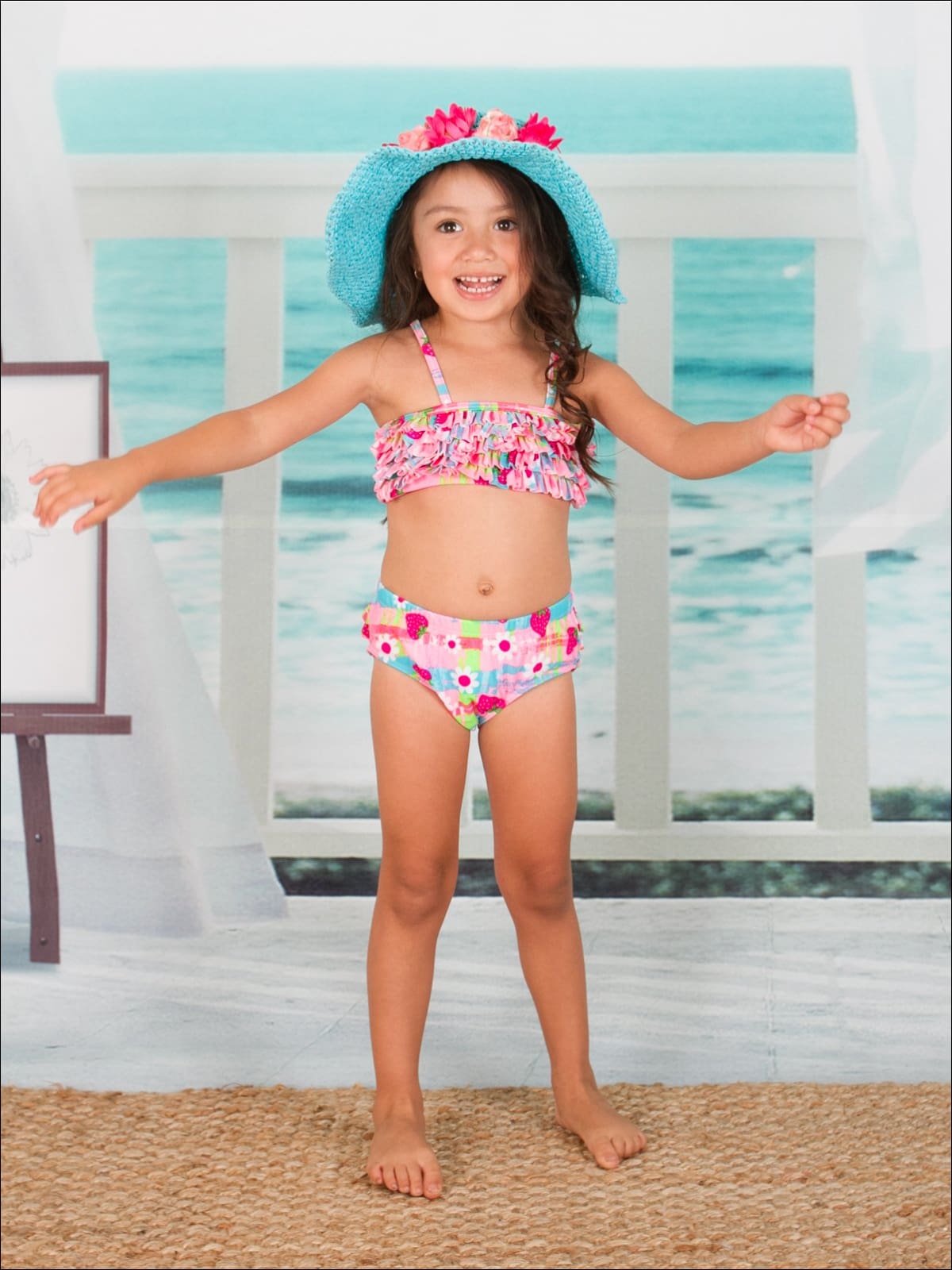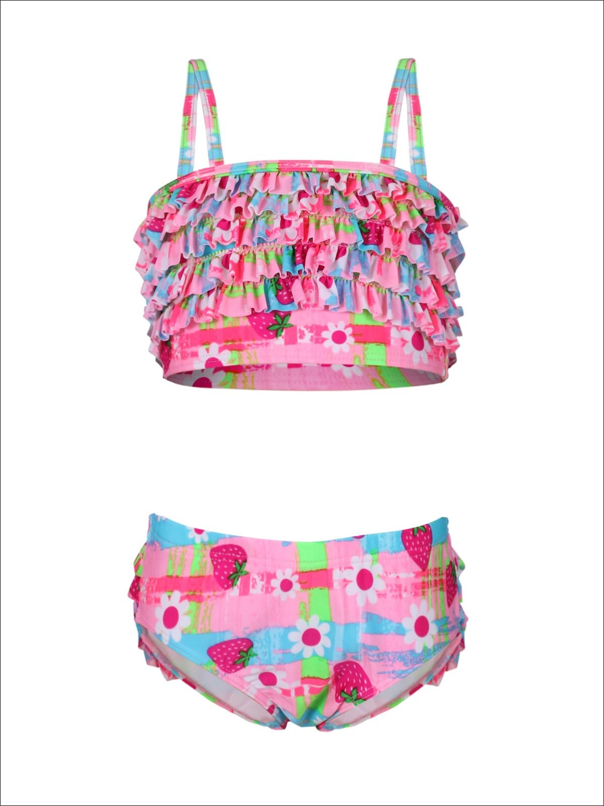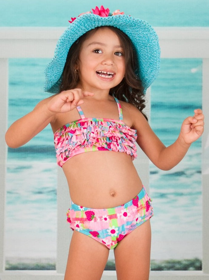 No sweeter way to start spring than in this berry berry cute strawberry and floral print bikini that boasts vibrant colors and tiered ruffles! It'll be impossible not to spot her from afar!