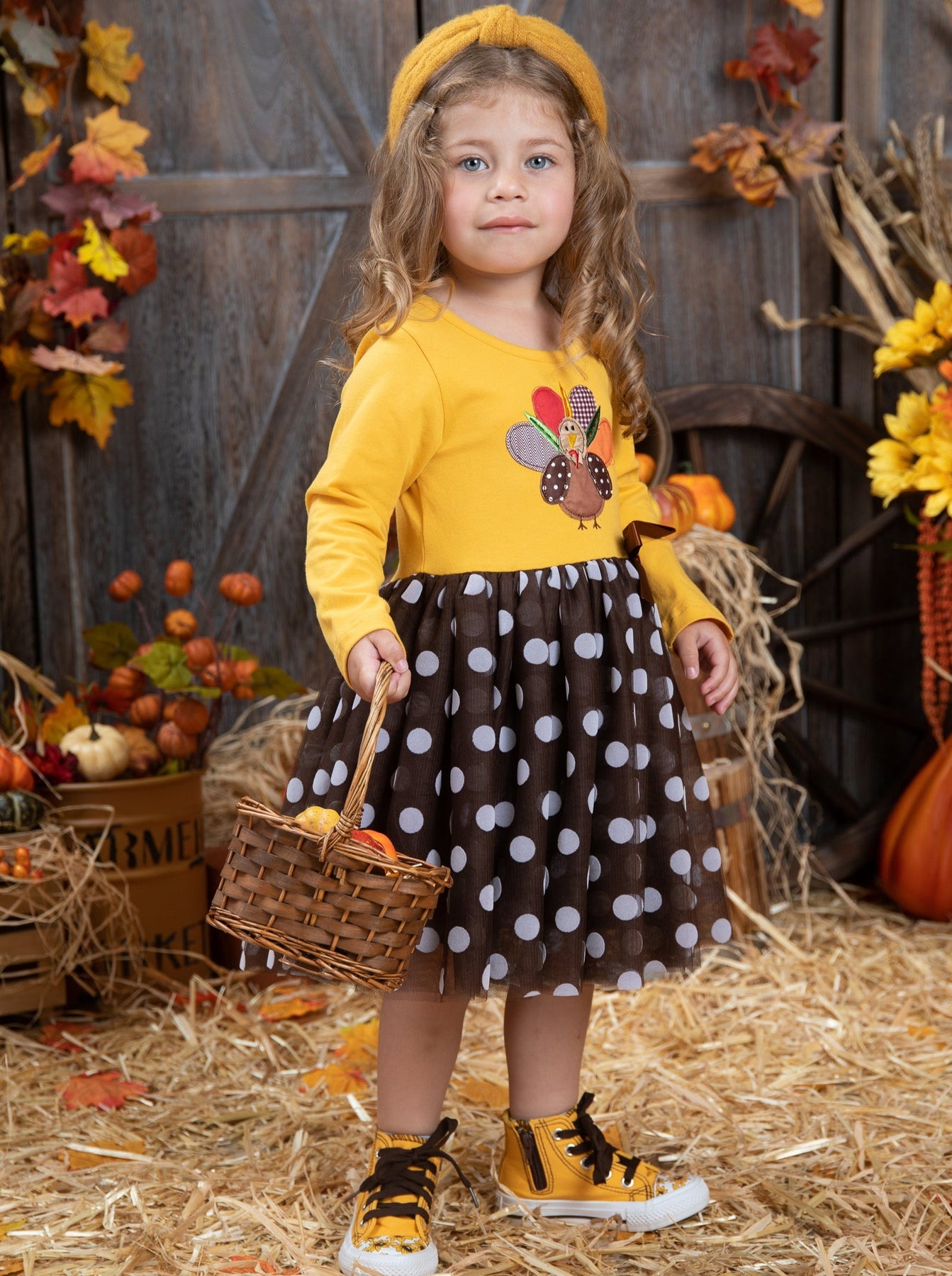 Turkey has never looks so precious! This sweet polka dot tutu dress will keep your little girl at her cutest all season long. It's definitely twirl-approved and ideal for Thanksgiving events!