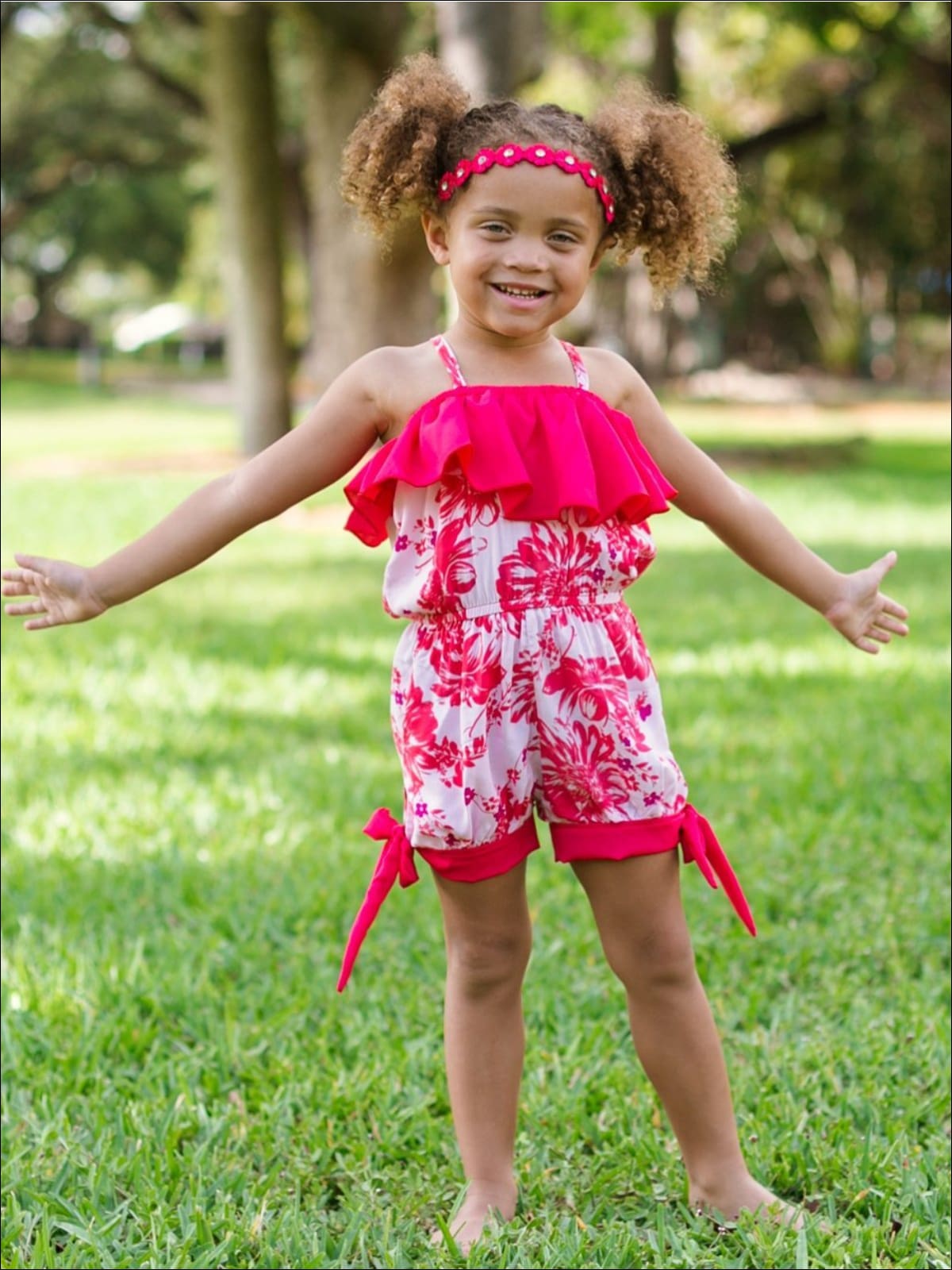 Girls Tomato Red/Pink Floral Spaghetti Strap Banded Bottom Romper w/ Ruffle Detail - Girls Jumpsuit