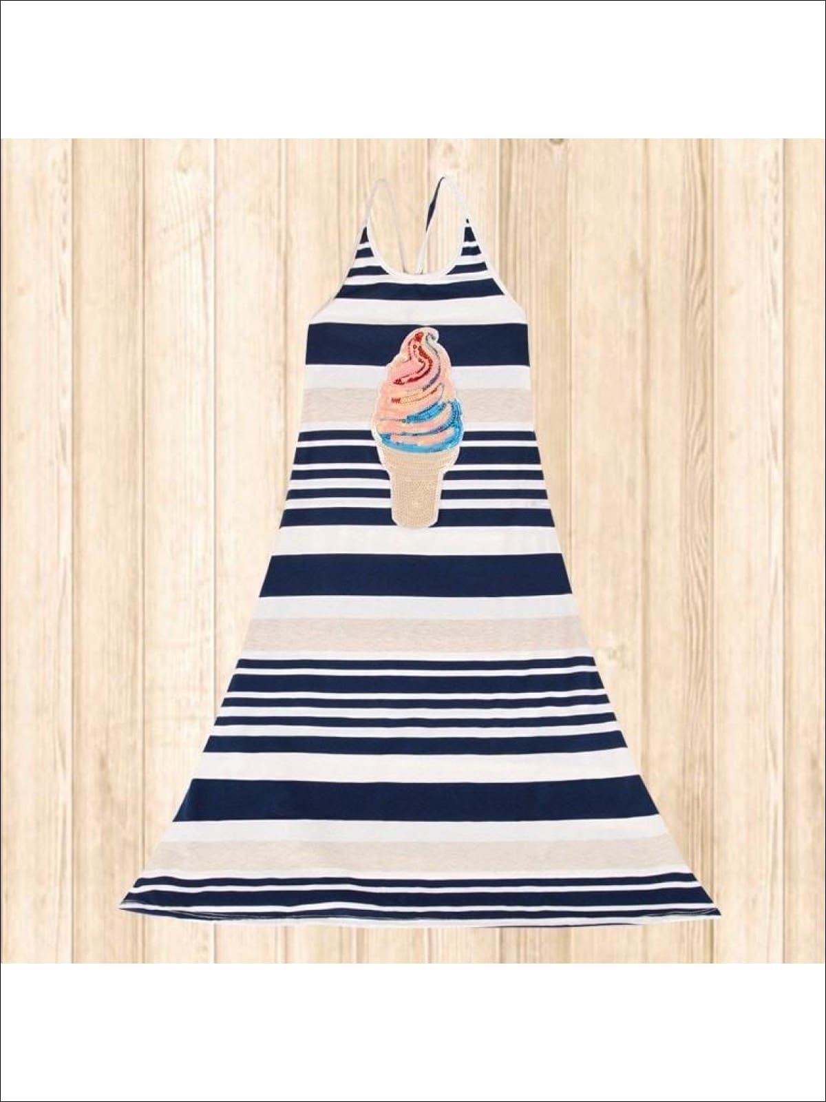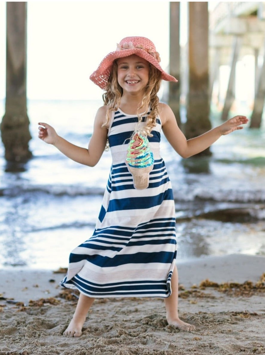 Girls Navy & Oatmeal Striped Ice Cream Applique Maxi Dress
