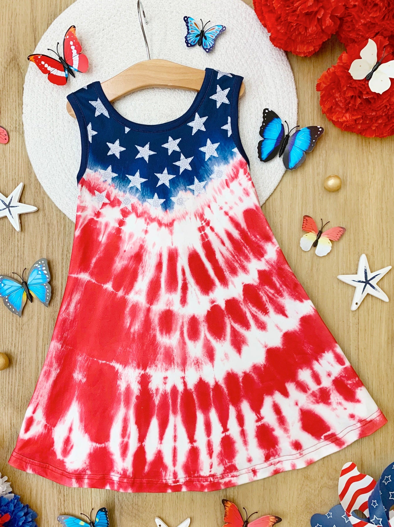 Girls 4th of July Dresses | US Flag Print Boho Tie Dye Midi Sundress