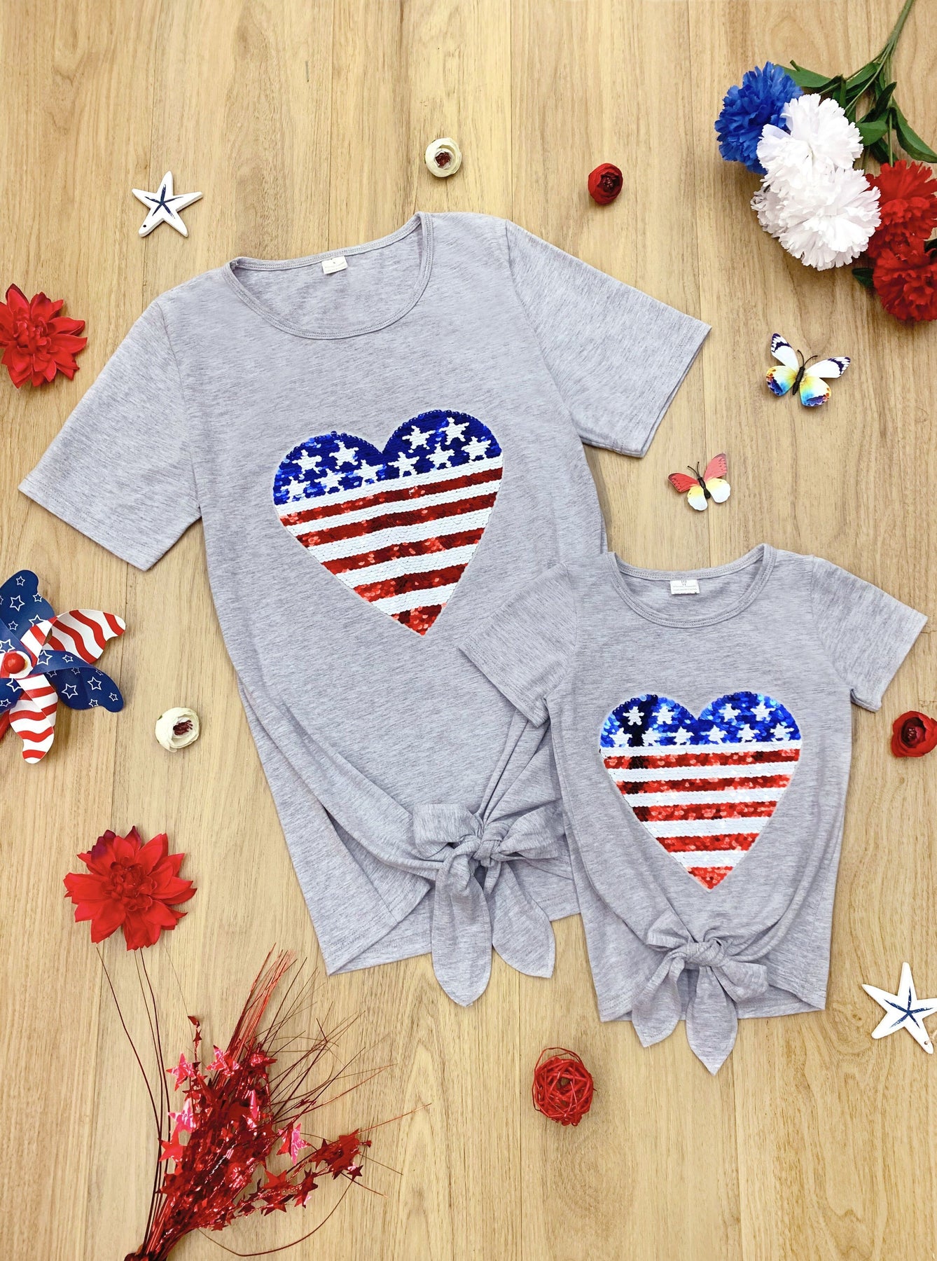 - Our sweet mother-daughter matching proud patriot knot-hem sequin tops will not disappoint! Keeping it cute and casual with your signature pair of shorts or leggings means running errands, hanging out with friends, or chilling with your baby-bestie will be perfectly on-trend. We know you'll HEART them!