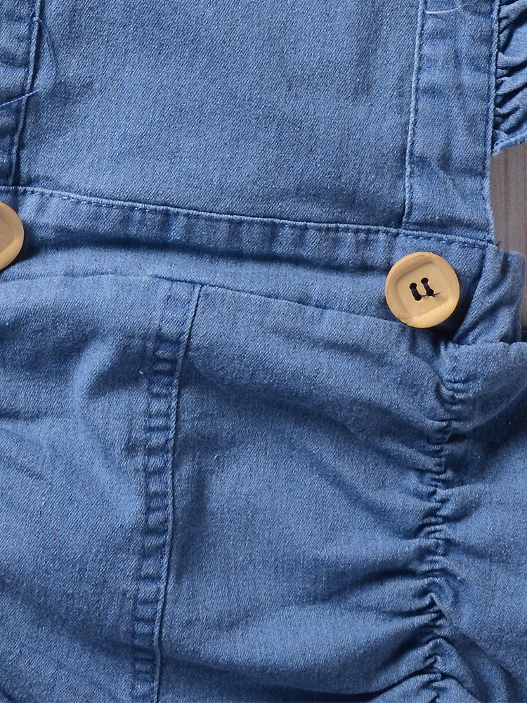 - The overall style romper onesie has ruffled shoulder straps that tie on the back. has 2 little buttons on the front to make it even more stylish